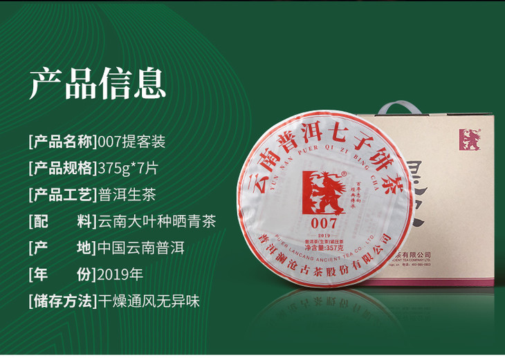 澜沧古茶2019年007生普洱茶生普新茶叶云南七子饼茶古树357g*7片