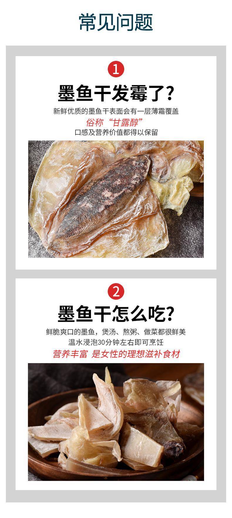 【温馨提示】墨鱼干表面会有一层薄双覆盖,那不是发霉,是一种糖醇,俗称“甘露醇”,品质好的墨鱼干才会晒出来的东西,食用前可清洗掉,对身体无害。