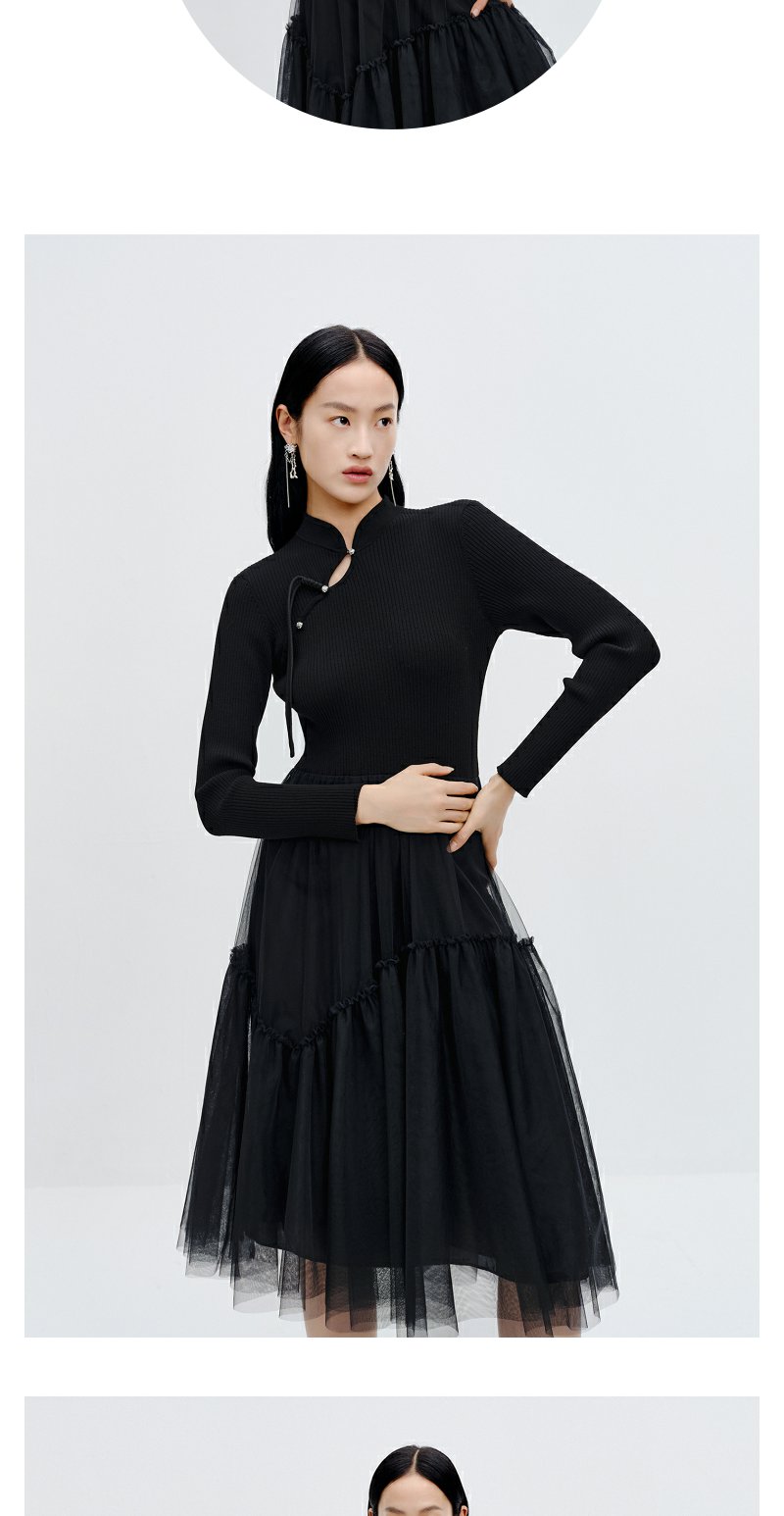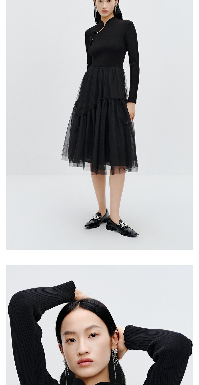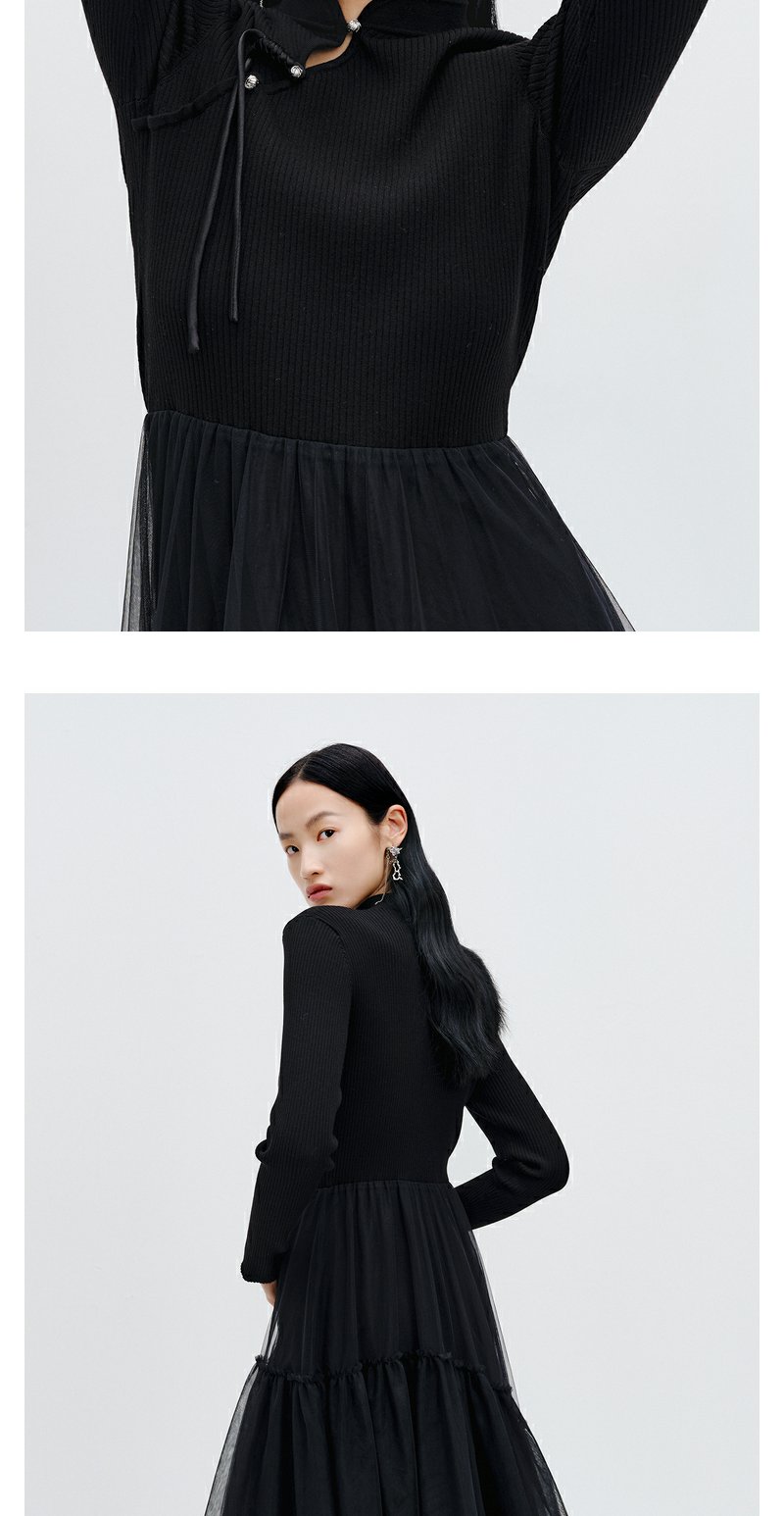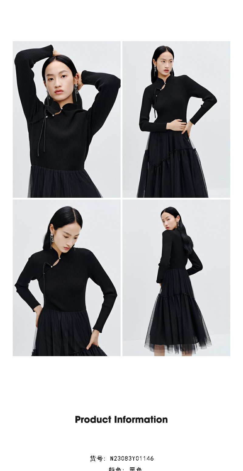 NEELLY纳俪商场同款针织网纱拼接连衣裙2023秋新款黑色新中式长裙N23083Y01146