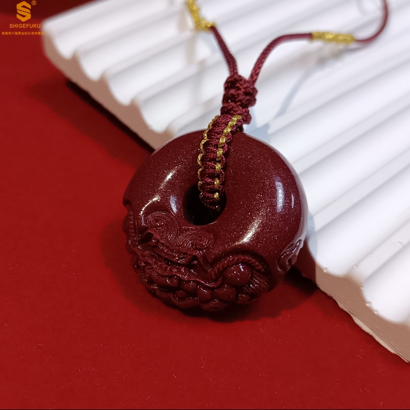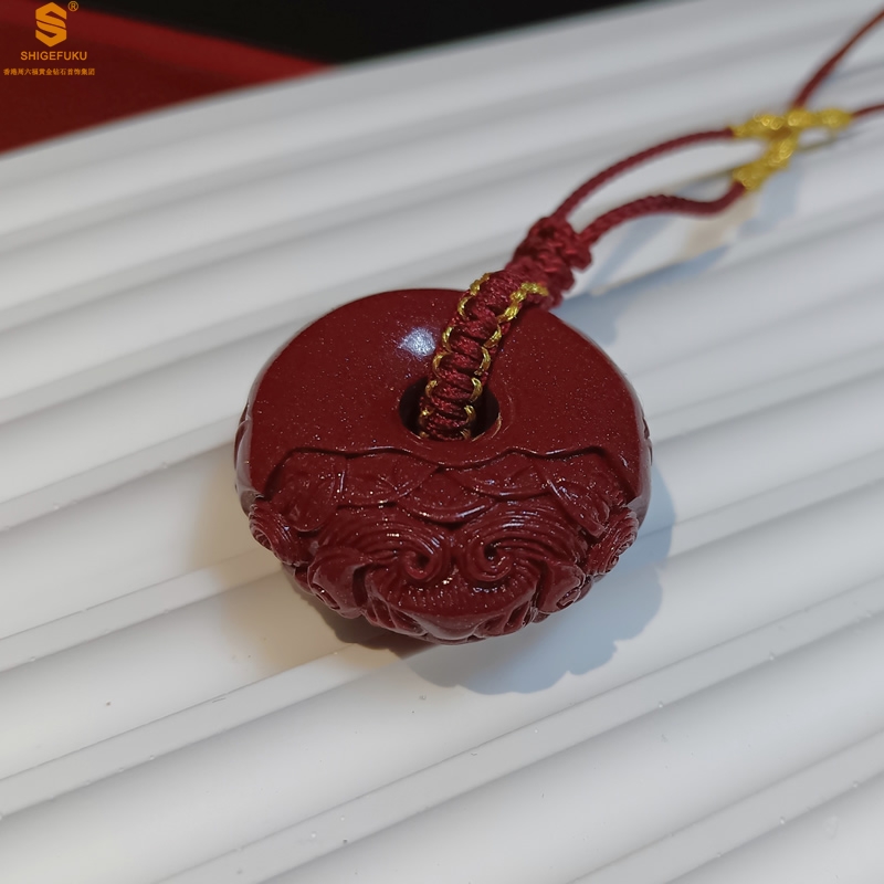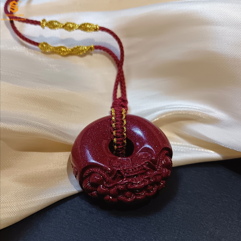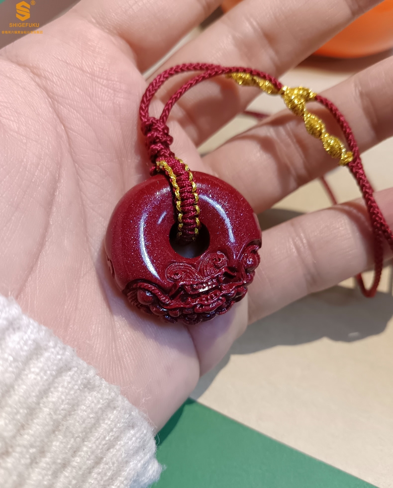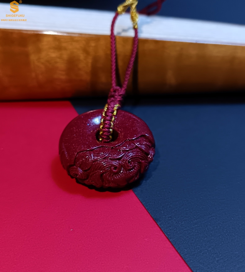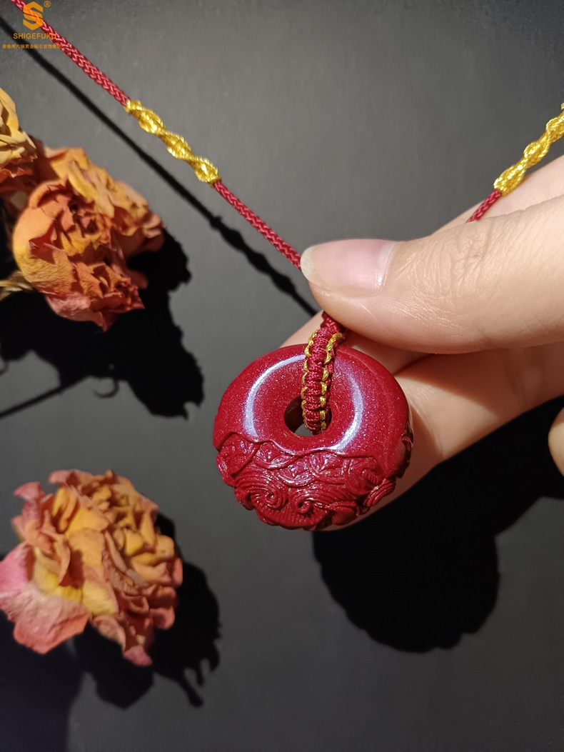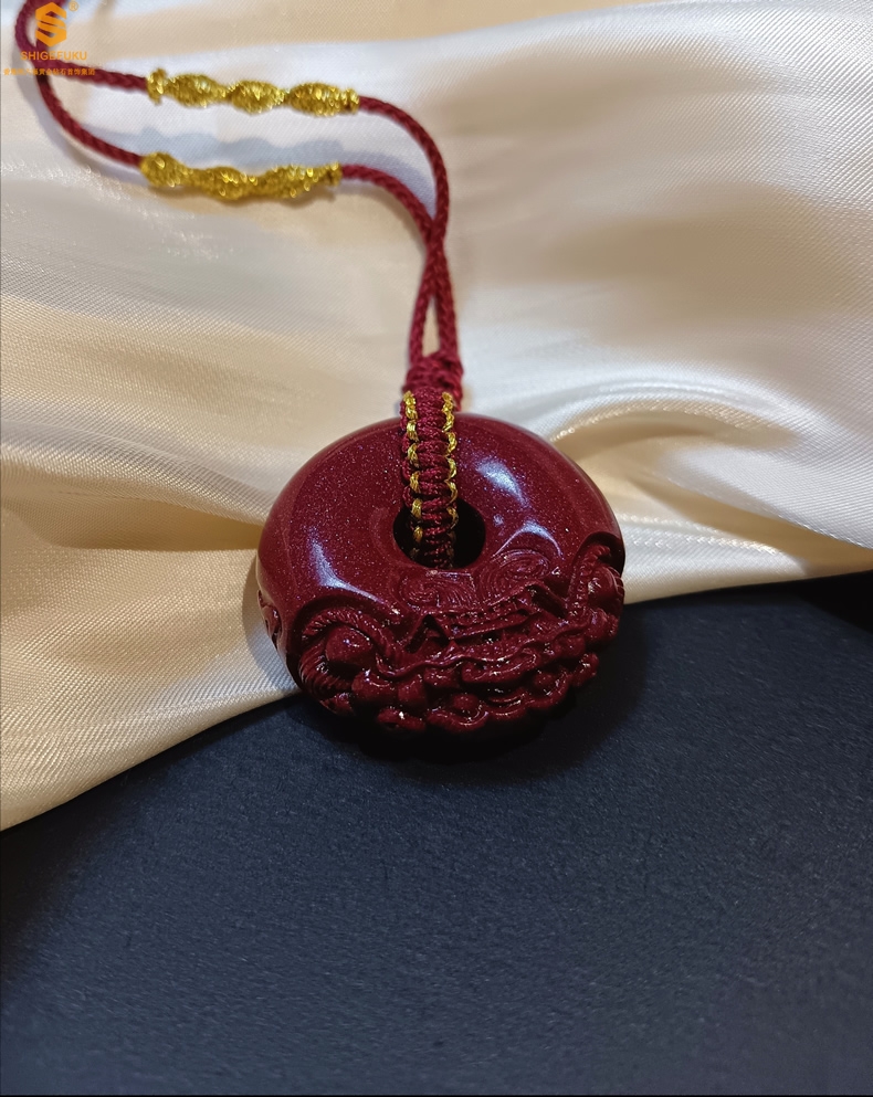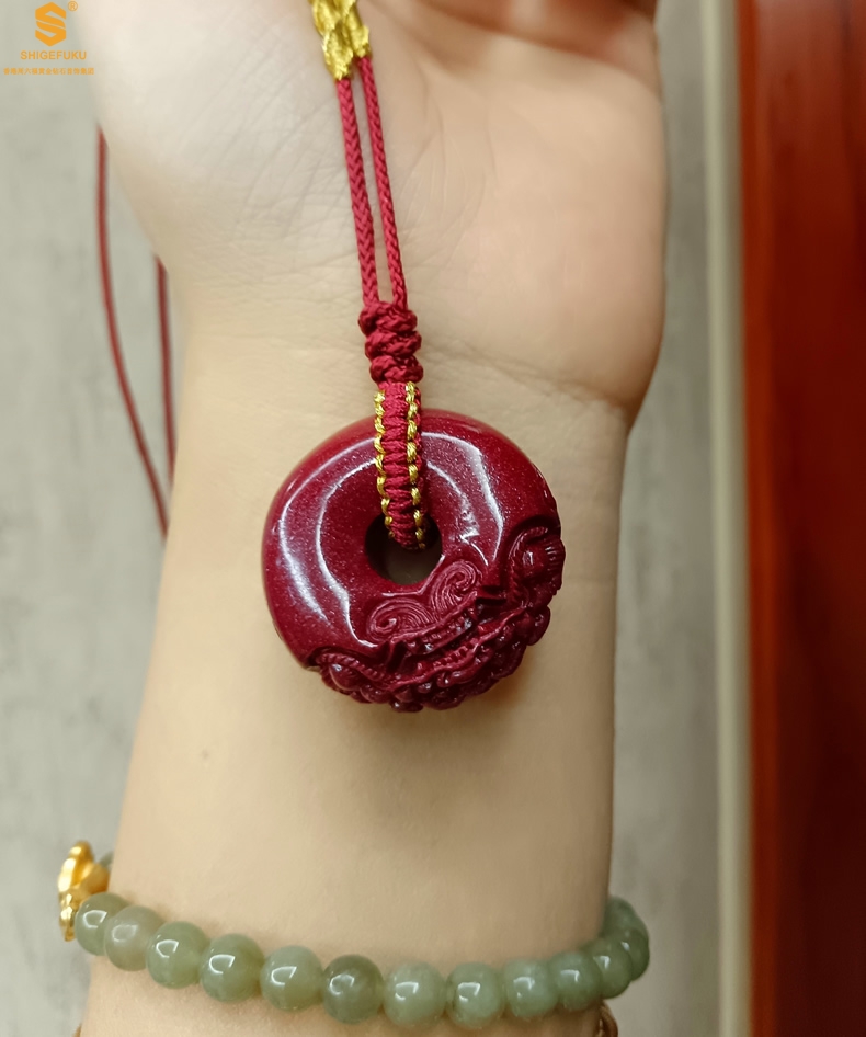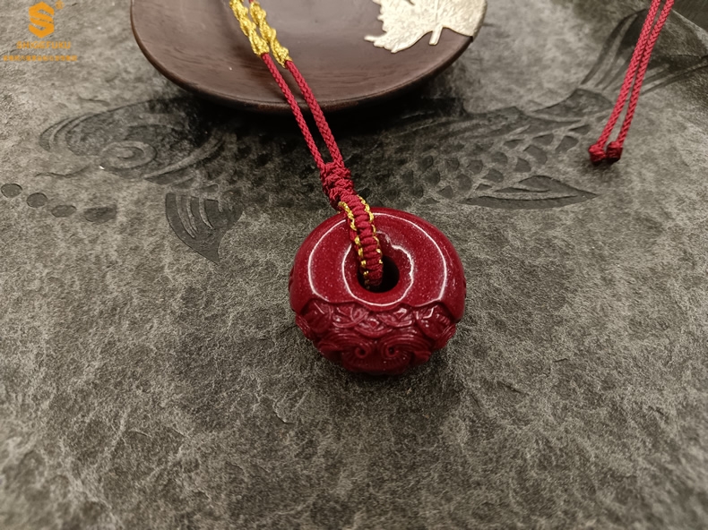 【品名】天然原矿朱砂微雕麒麟平安扣吊坠