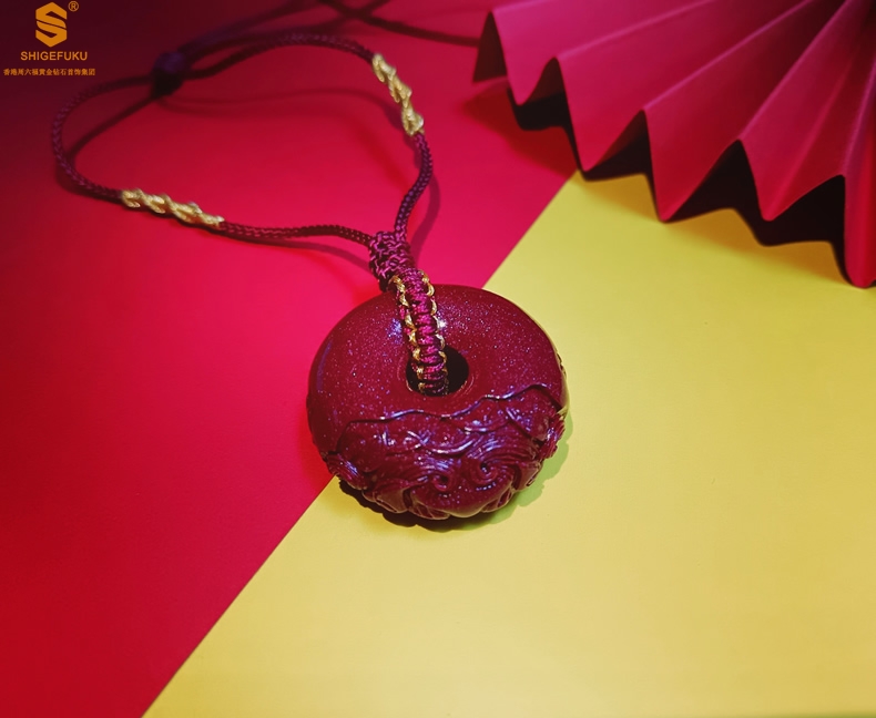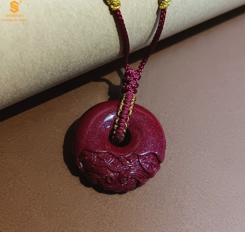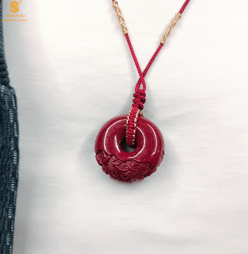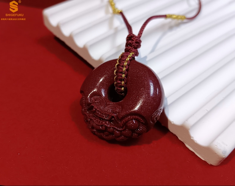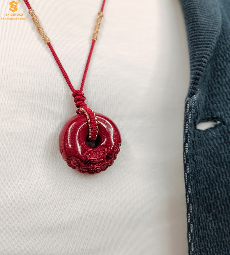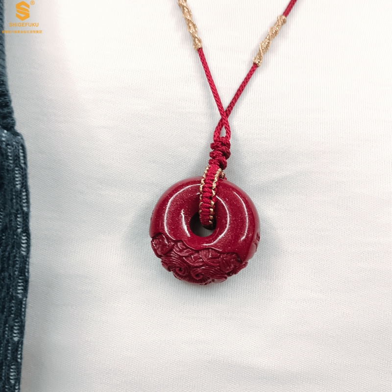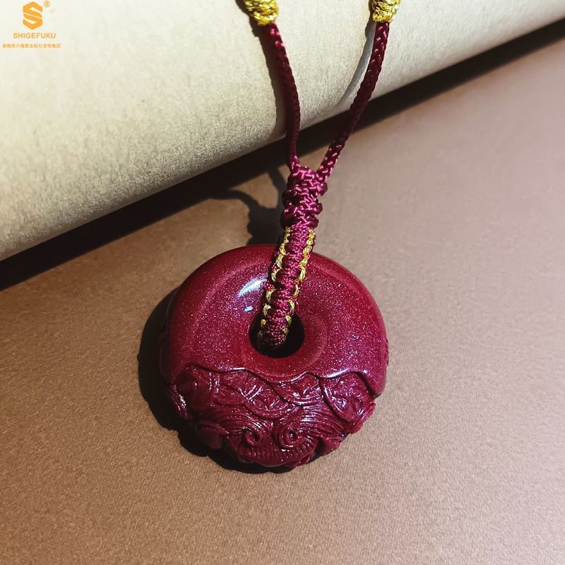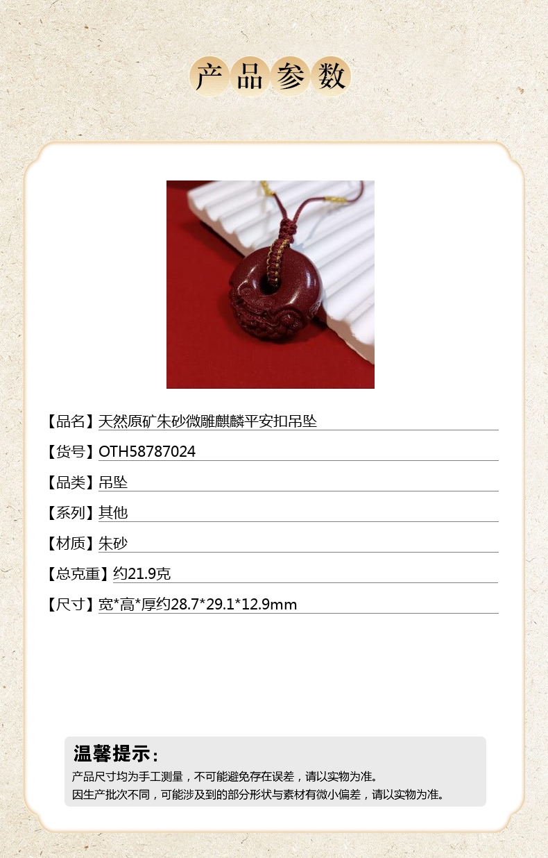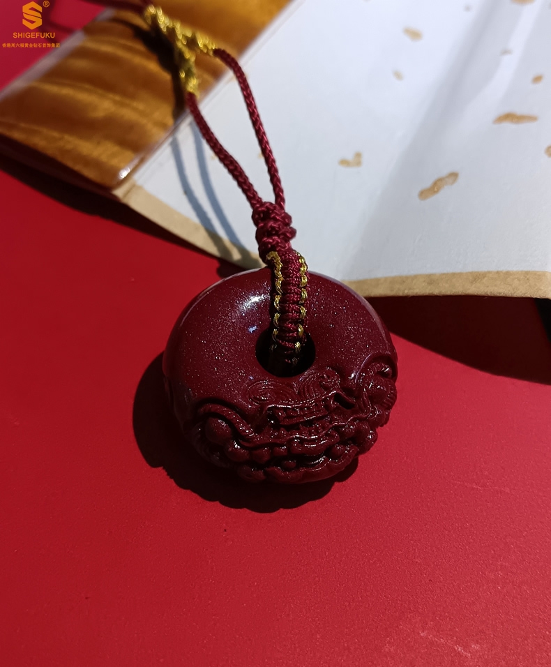 【品名】天然原矿朱砂微雕麒麟平安扣吊坠