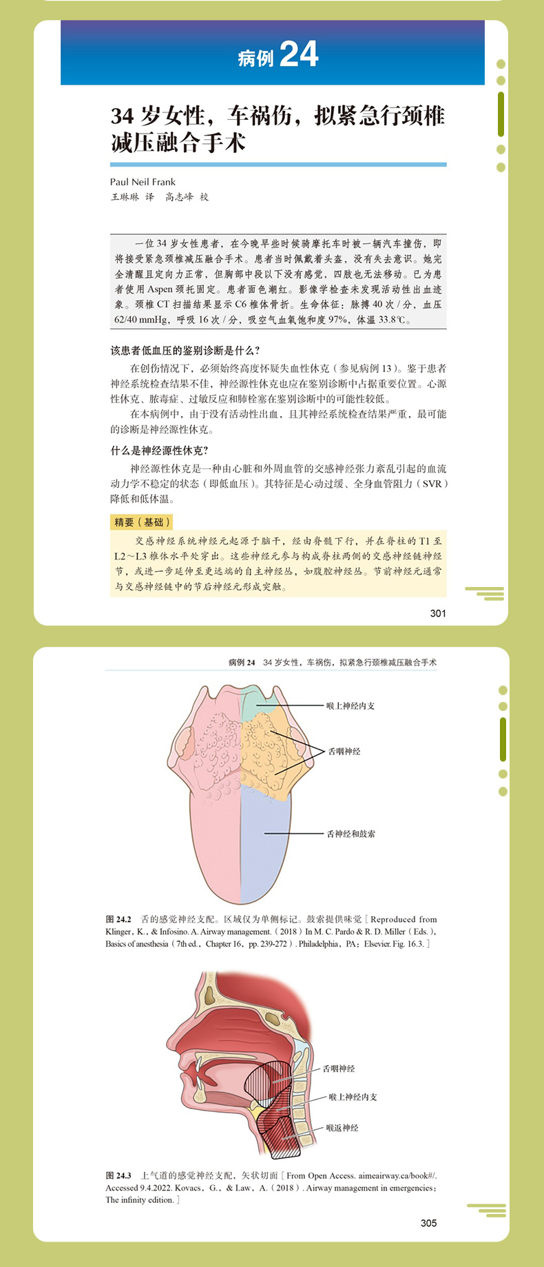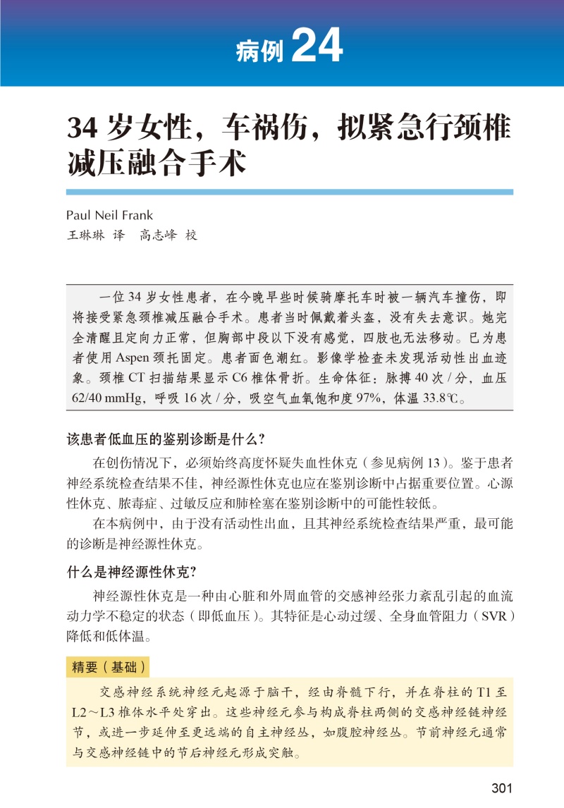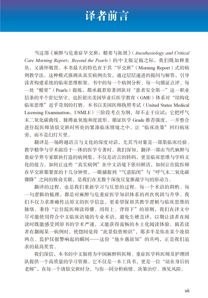 《麻醉与危重症早交班:精要与拓展》是一本以病例为基础的教材,涵盖美国医师执照考试(USMLE)和轮转结业考核的核心内容,以及麻醉学住院医师培训中所遇到的高效实用的临床情景和主题。本书专注于读者需要了解的实用信息,指导读者如何像在早交班病例讨论会上那样,精准剖析临床病例片段,磨练读者的临床决策能力,并帮助麻醉医师为真实的患者情境制定基于循证的方案。早交班/大查房的形式以主诉开篇,病例末尾附有“精要”。问题贯穿整个病例,以模拟临床环境和医师资格考试中的实际决策过程。40多个病例源自麻醉学总论及各麻醉亚专科,包括区域麻醉、儿科麻醉、心胸外科麻醉和产科麻醉,是低年资和高年资住院医师的理想指导手册。