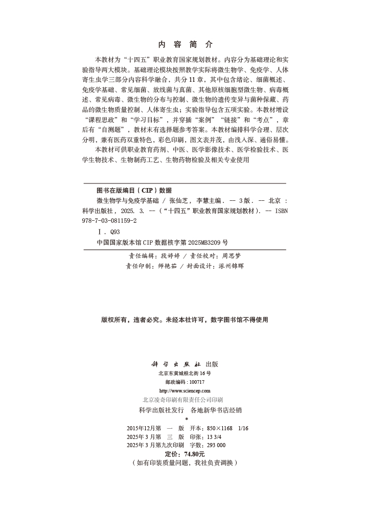 微生物学与免疫学基础 第3三版 张仙芝 李慧 主编 供职业教育药剂中医医学影像技术医学检验技术等 9787030811592科学出版社