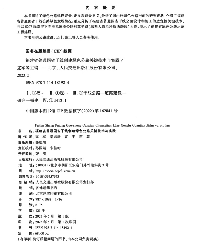书名:福建省普通国省干线创建绿色公路关键技术与实践