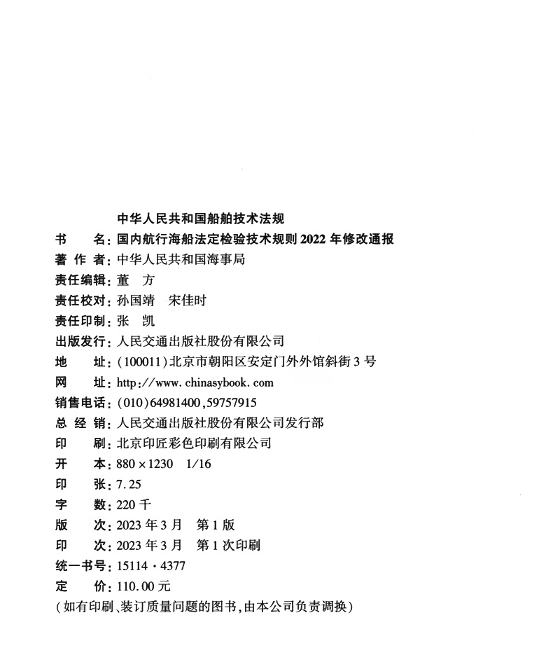 书名:国内航行海船法定检验技术规则 2022年修改通报