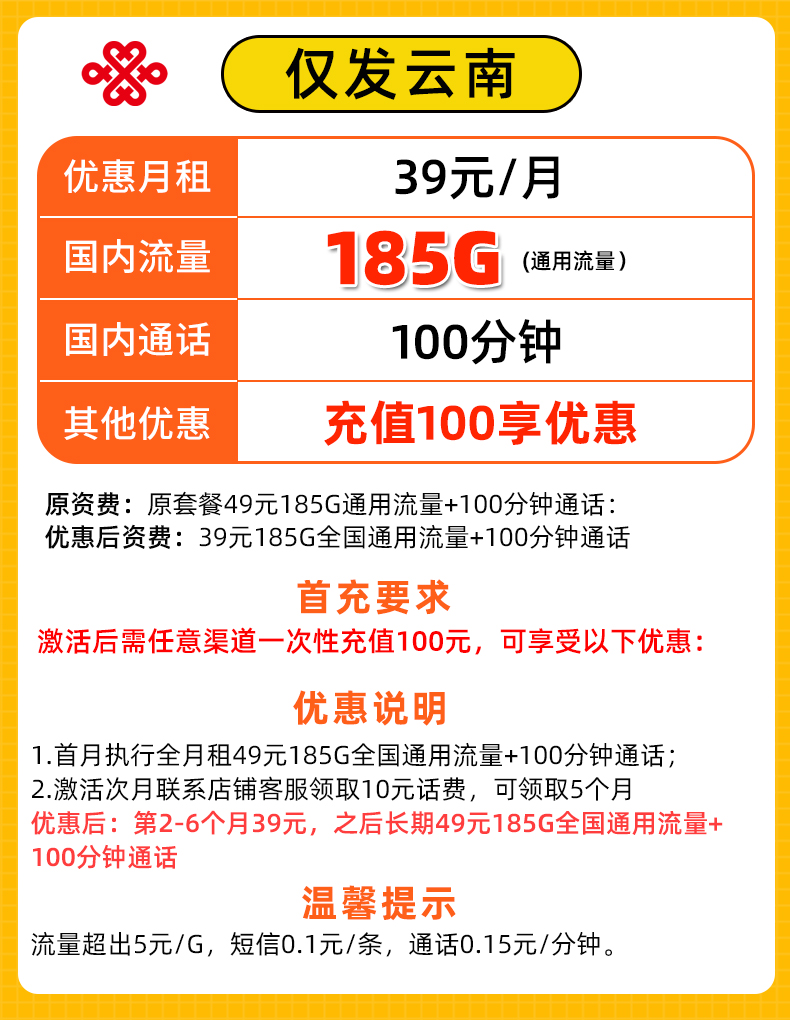 【只发云南】联通5G流量卡 长期100分钟185G通用流量