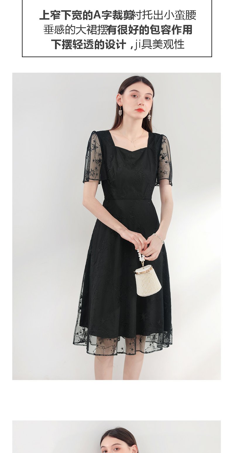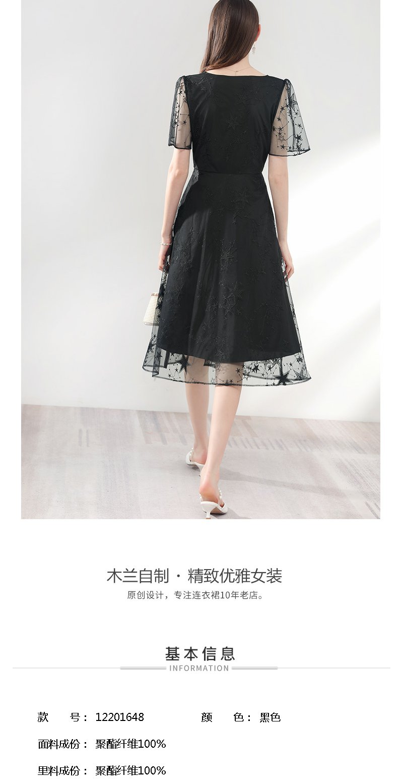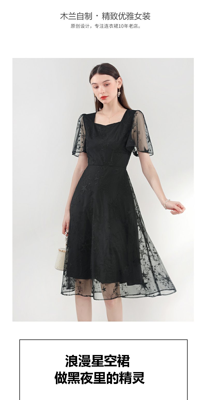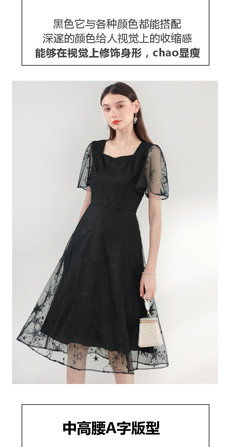 未风黑色网纱绣花连衣裙女夏2024年夏季新款女装气质高腰显瘦裙子