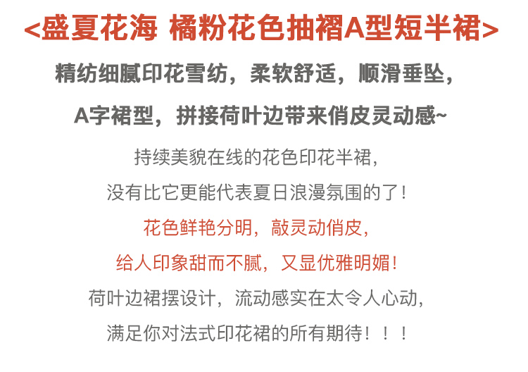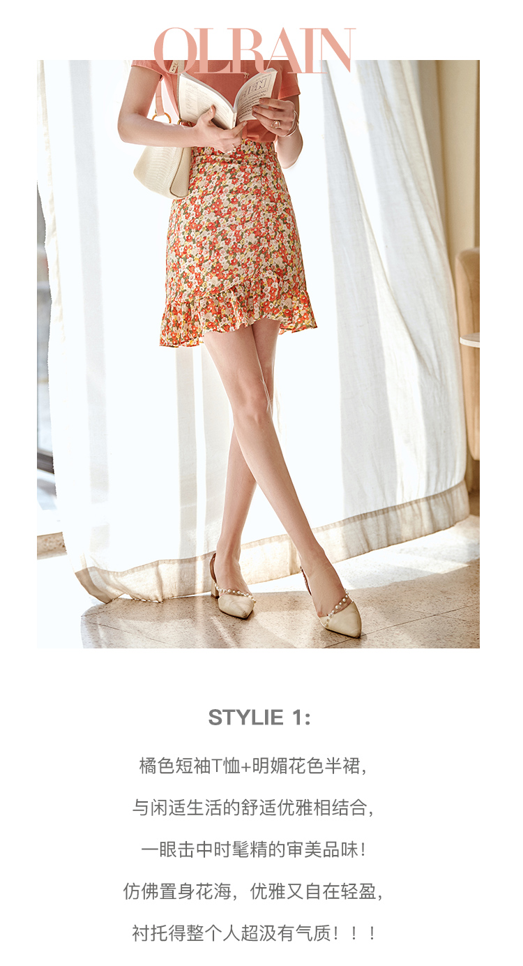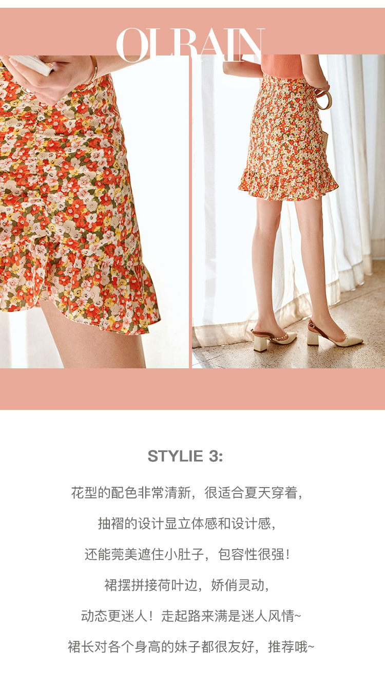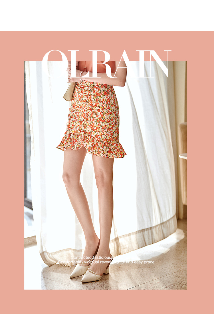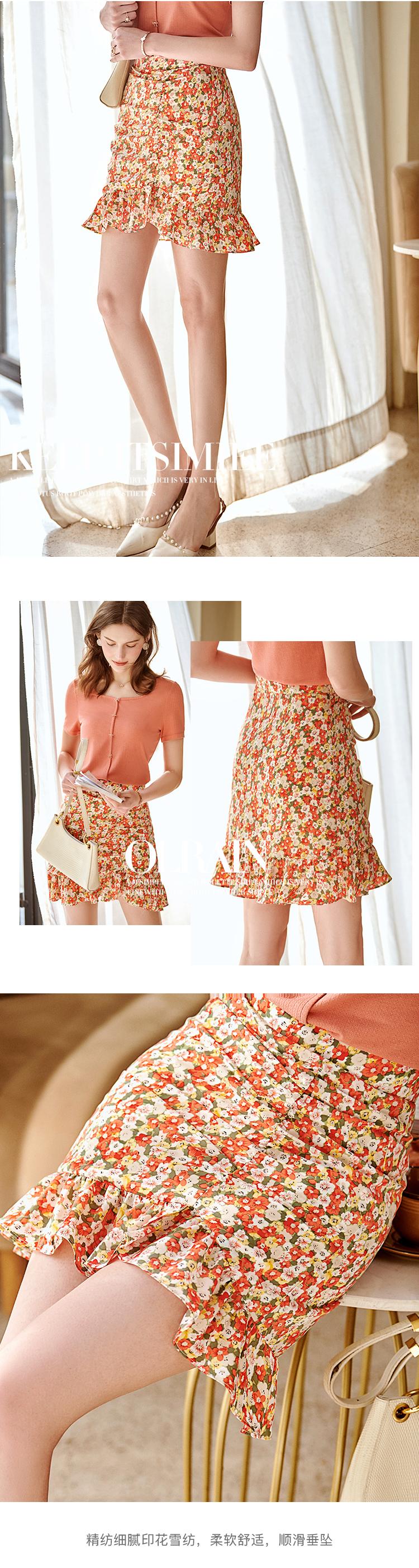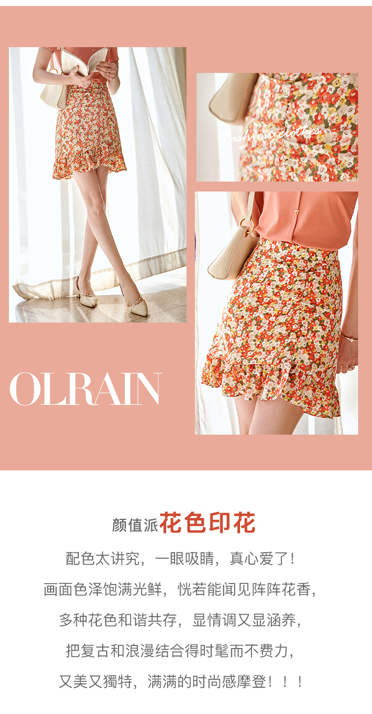 欧芮儿印花雪纺半身裙2021高腰显瘦拼接荷叶边抽褶设计A字裙
