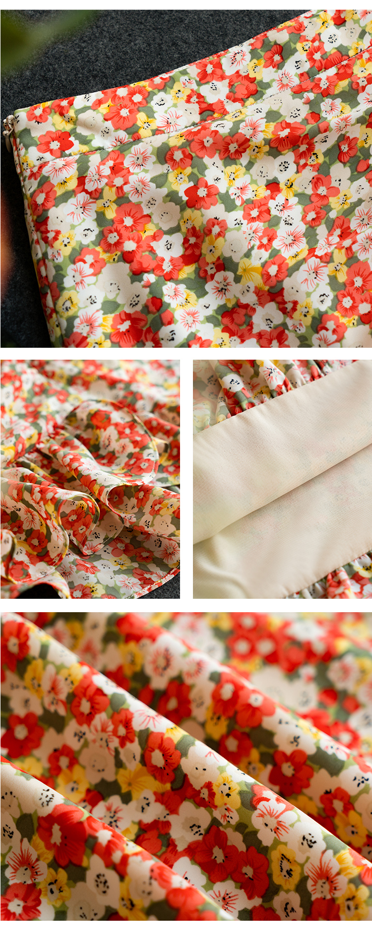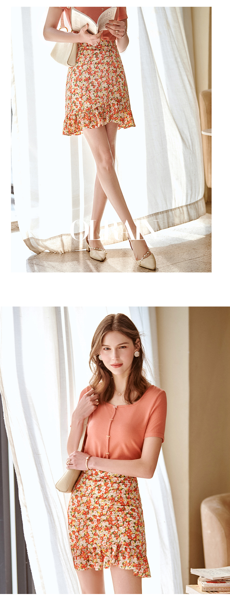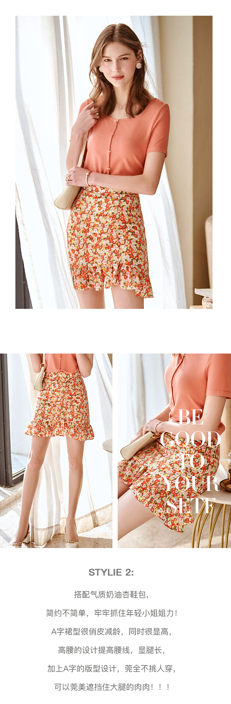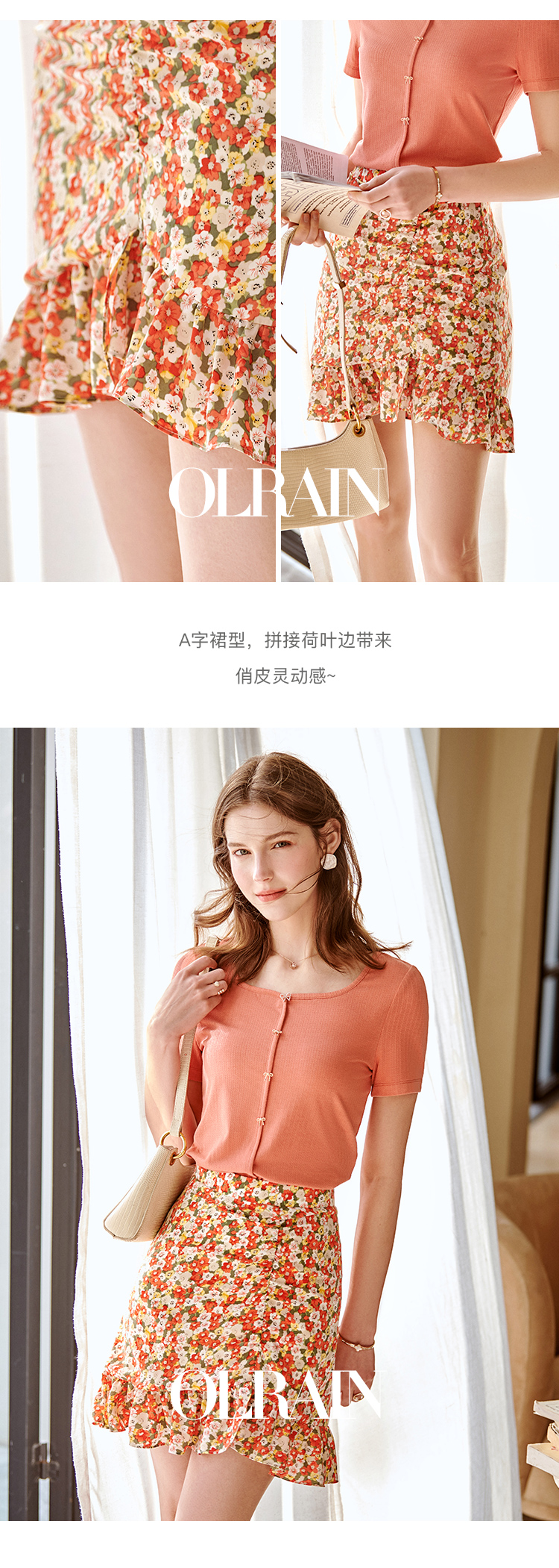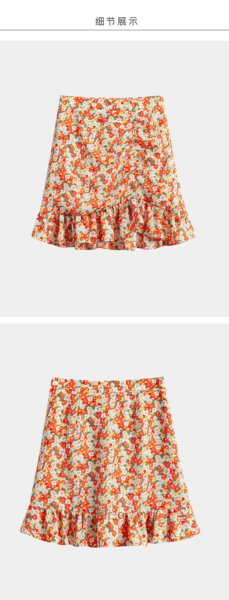 欧芮儿印花雪纺半身裙2021高腰显瘦拼接荷叶边抽褶设计A字裙