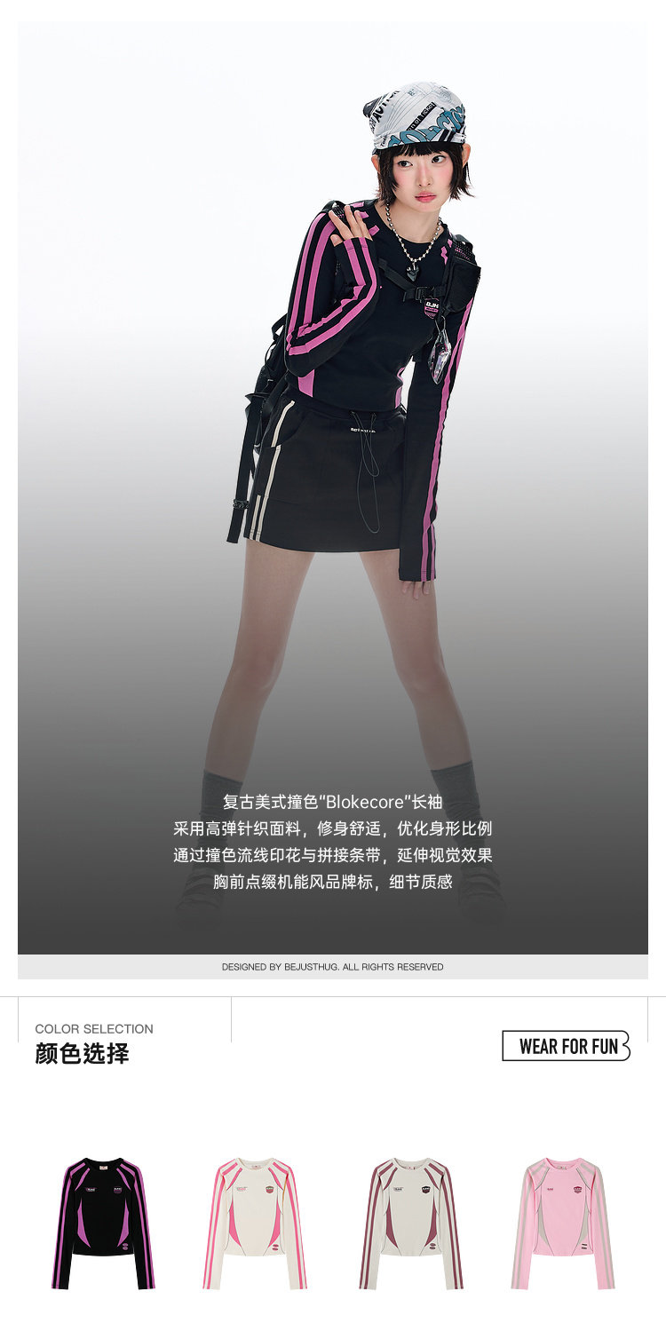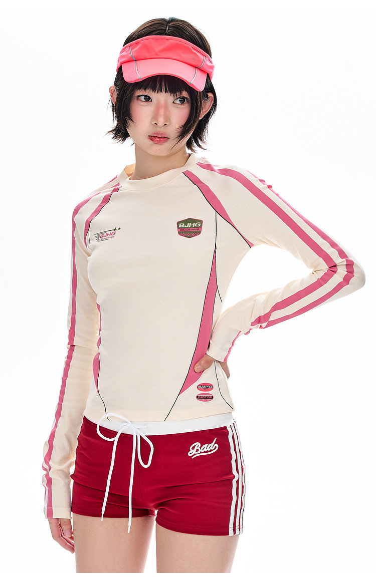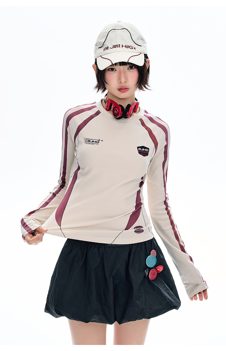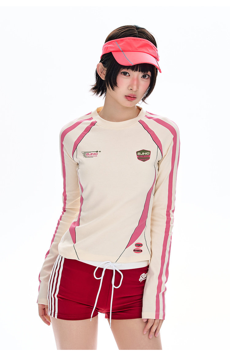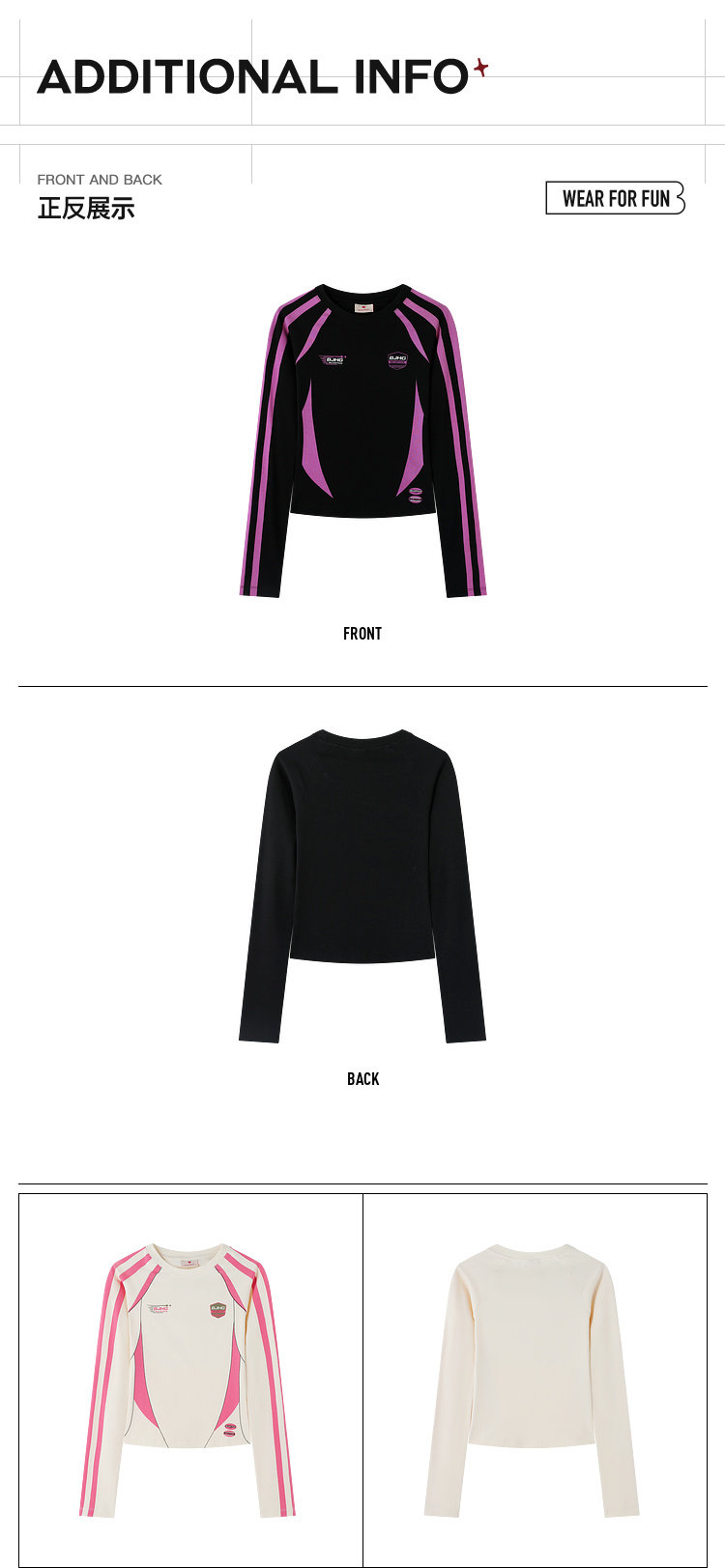 BJHG不计后果赛车风长袖T恤女款春季 印花撞色短款修身打底衫内搭