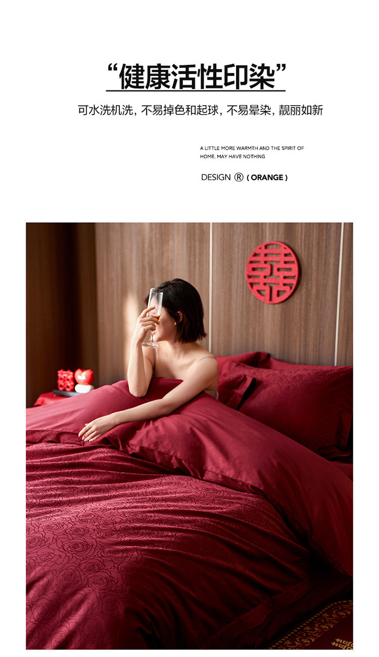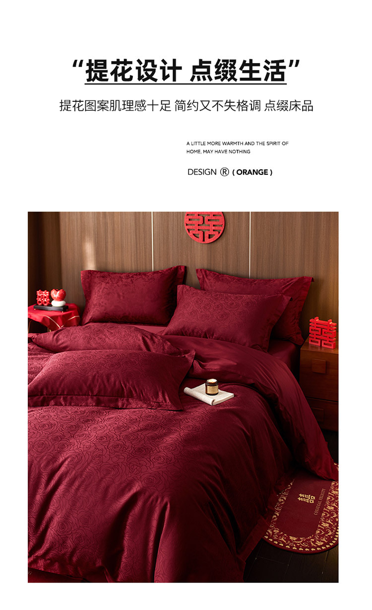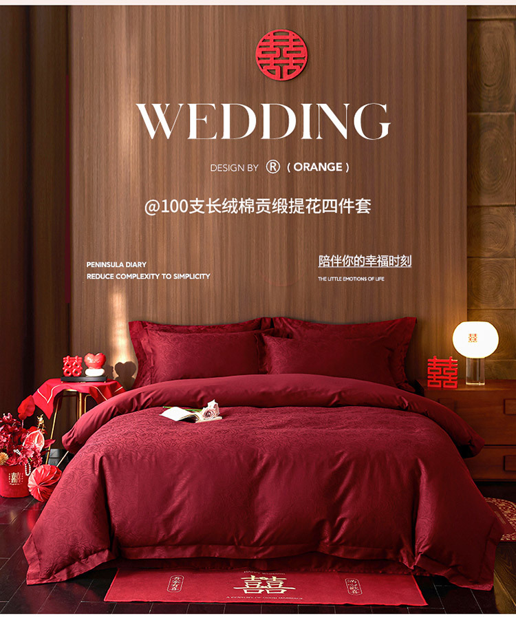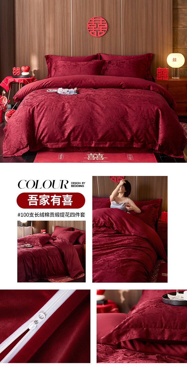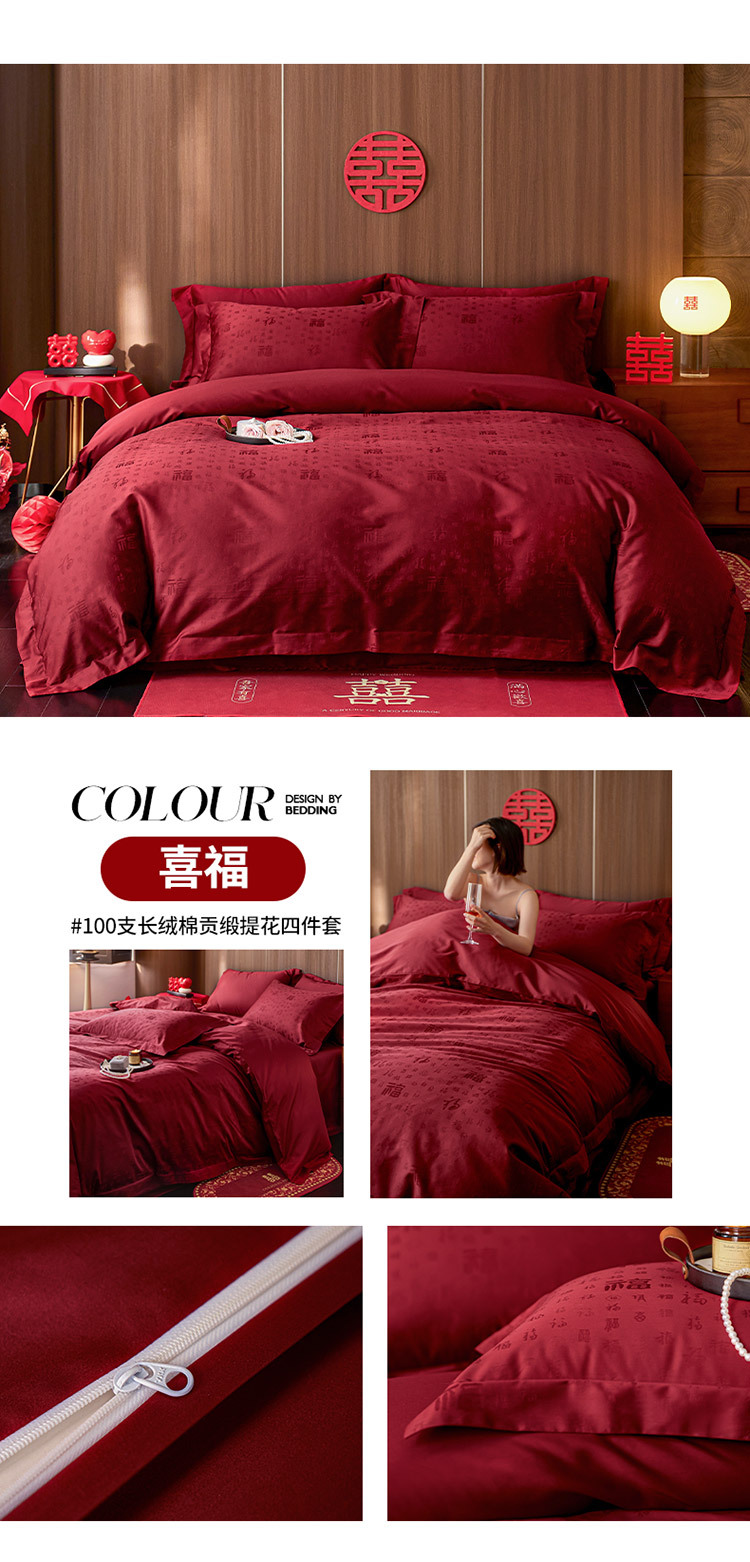 【长绒棉贡缎提花100S四件套】简约中式婚庆四件套长绒棉贡缎提花100S纯棉嫁娶红色全棉结婚床品