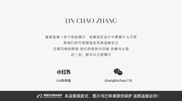 - 浙江林限定时装有限公司 自创品牌女装“LIN CHAO ZHANG ”直营微信店铺。