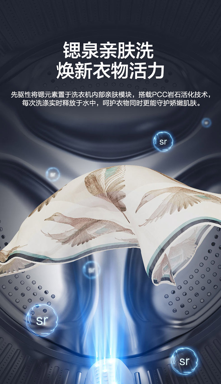 ❀【晶彩系列】锶泉Q,in肤洗【锶泉Q,in肤洗】先驱性将锶元素置于洗衣机内部q,in肤模块,搭载PCC岩石活化技术,每次洗涤实时释放于水中,呵护衣物同时更能守护娇嫩肌肤