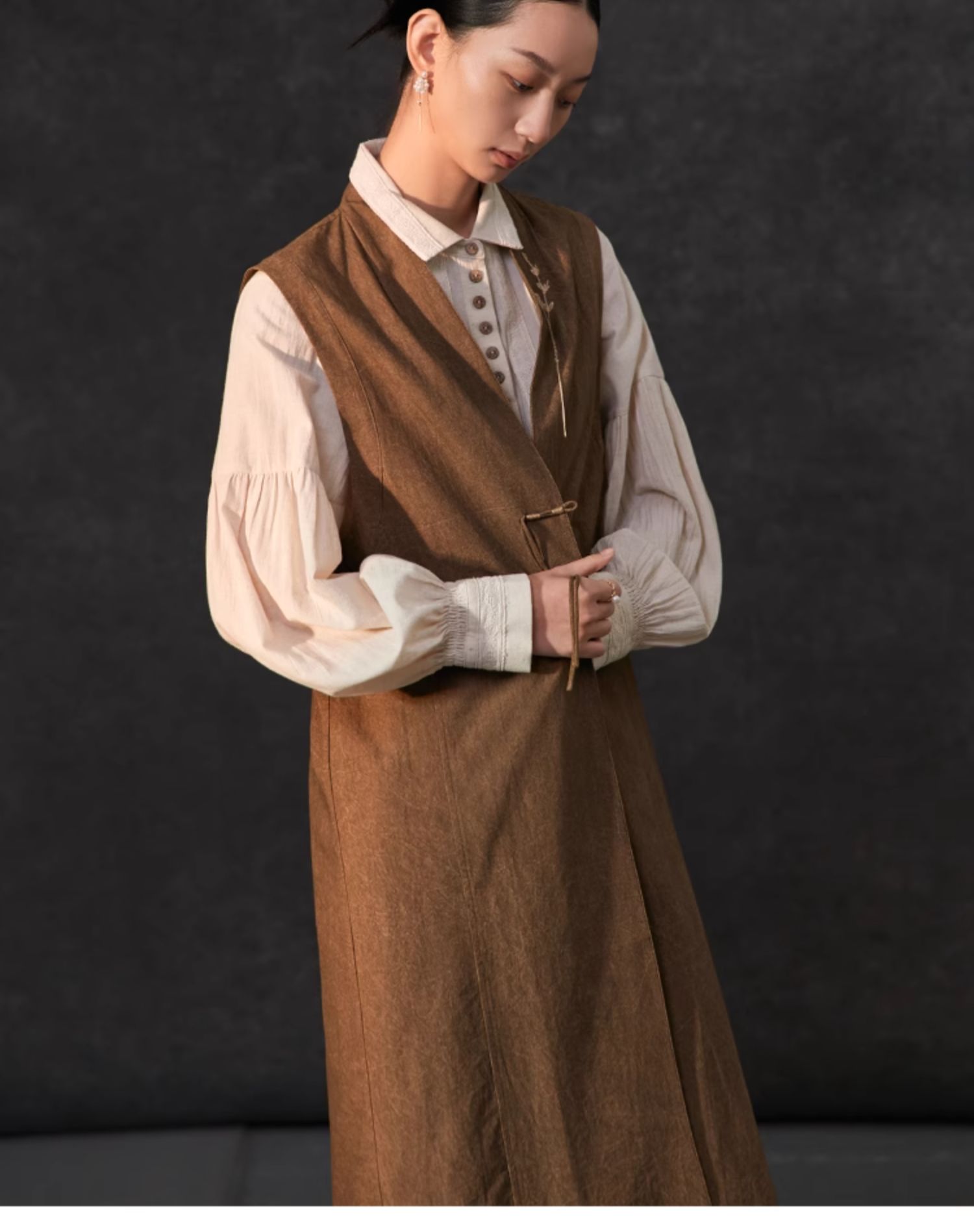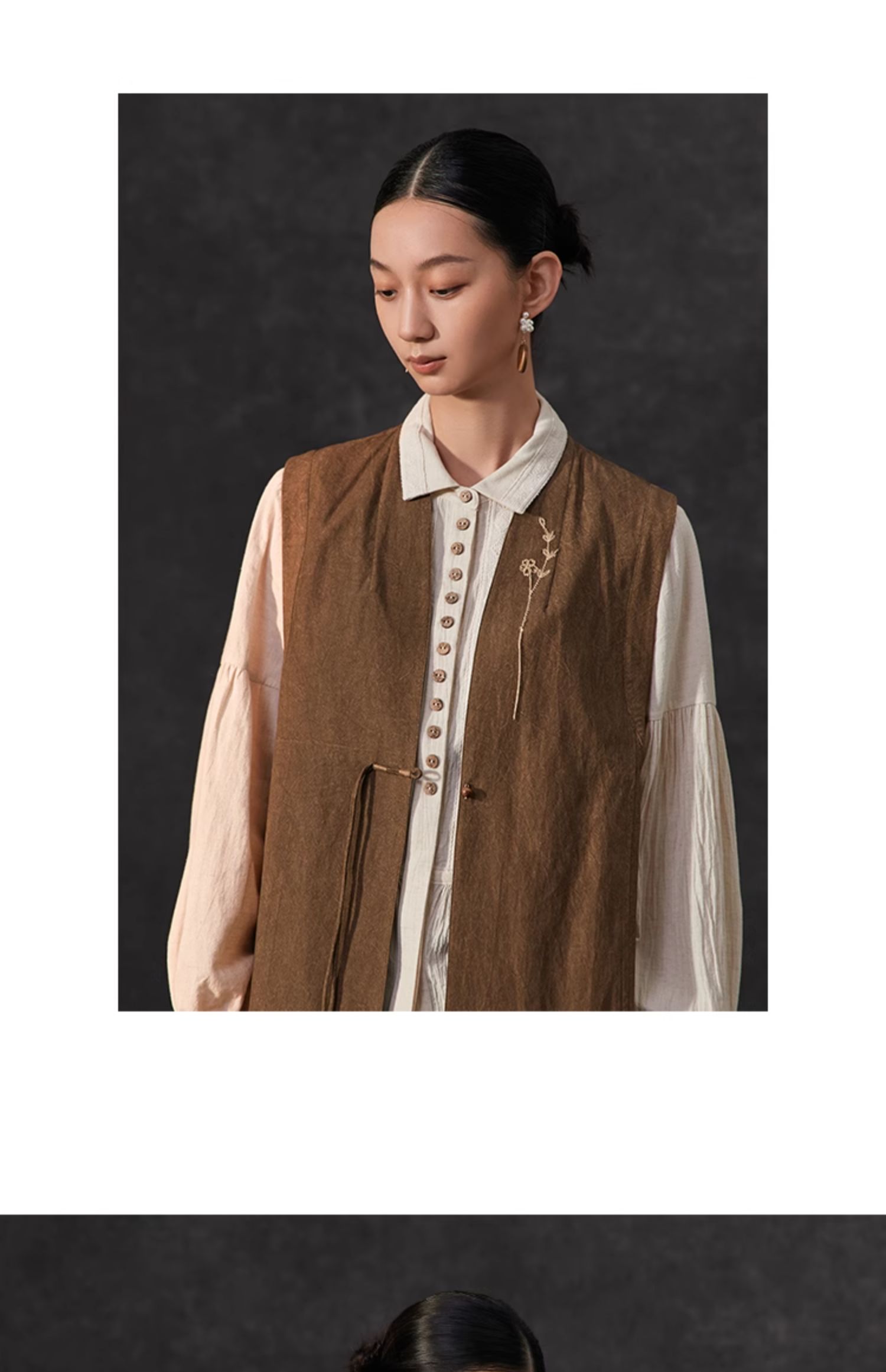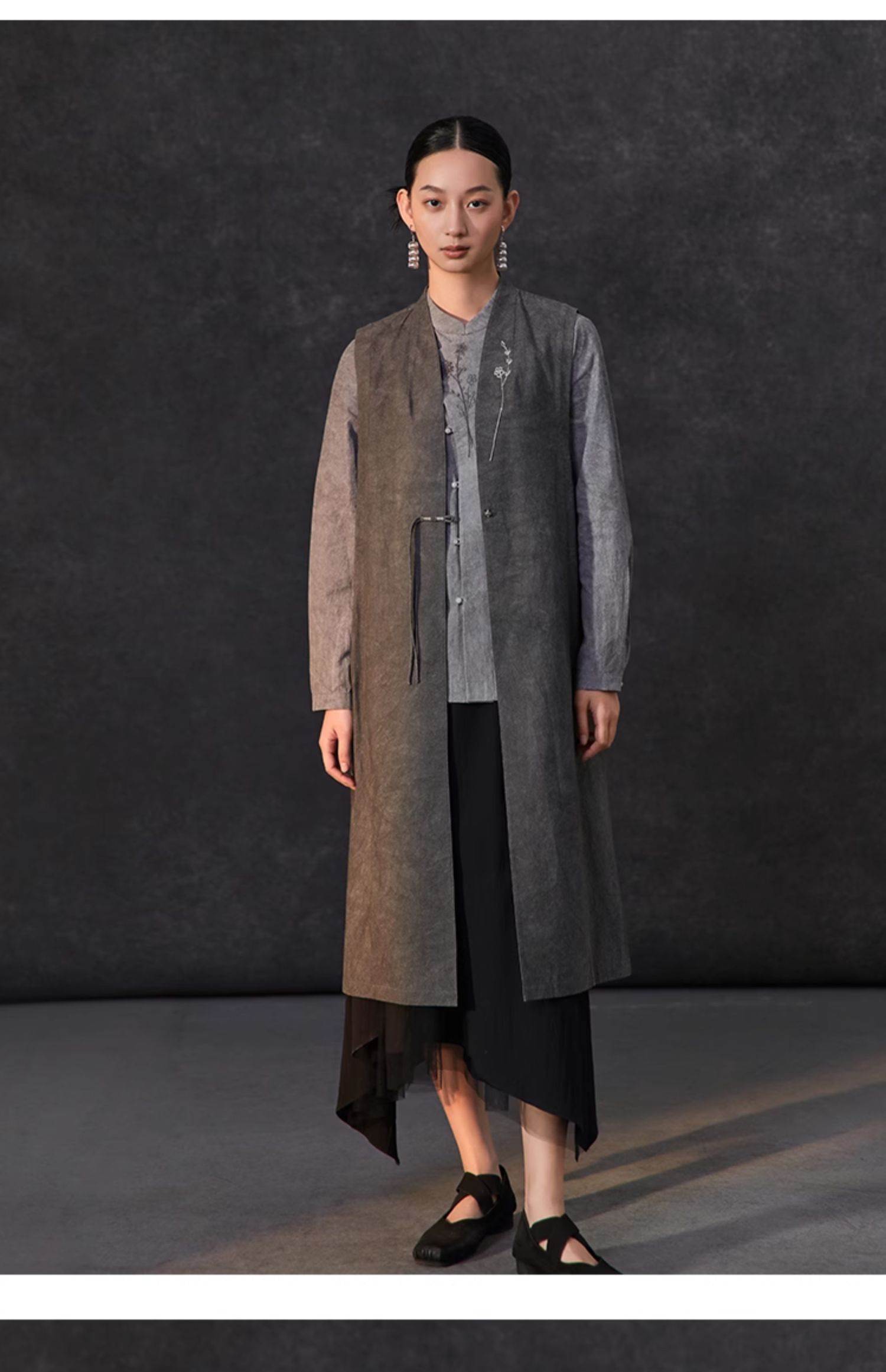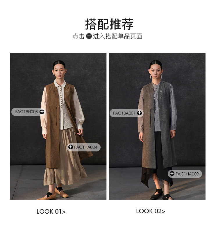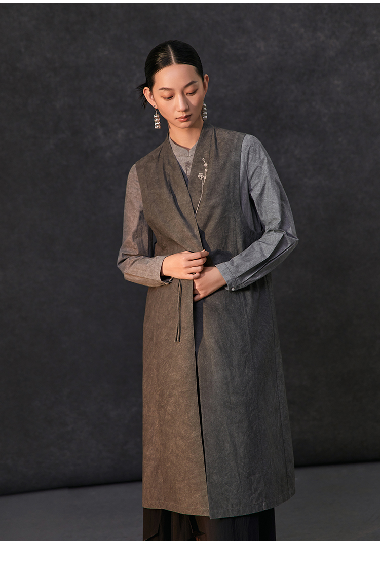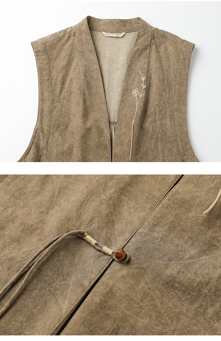 Famecoco新中式国风盘扣刺绣长款马甲女无袖背心马夹FAC1CA002