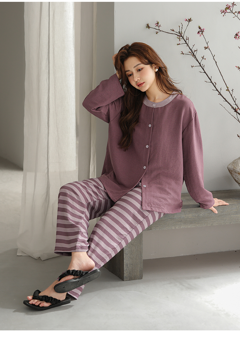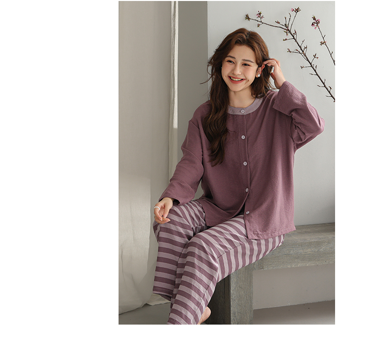 可人儿春秋季纯棉睡衣女士休闲圆领长袖带胸垫少女学生家居服套装