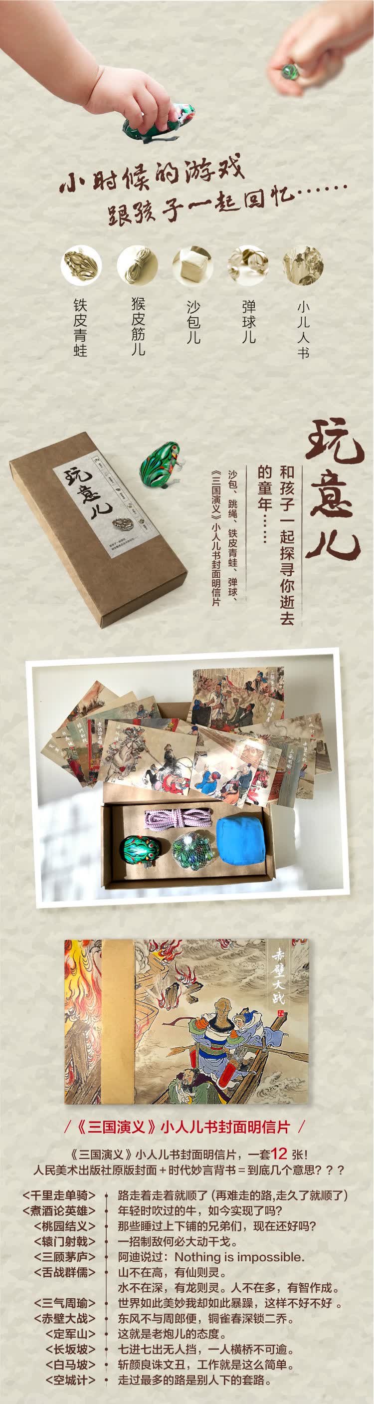 【 包装内容 】沙包、跳皮筋、铁皮青蛙、弹球、三国演义小人书明信片
