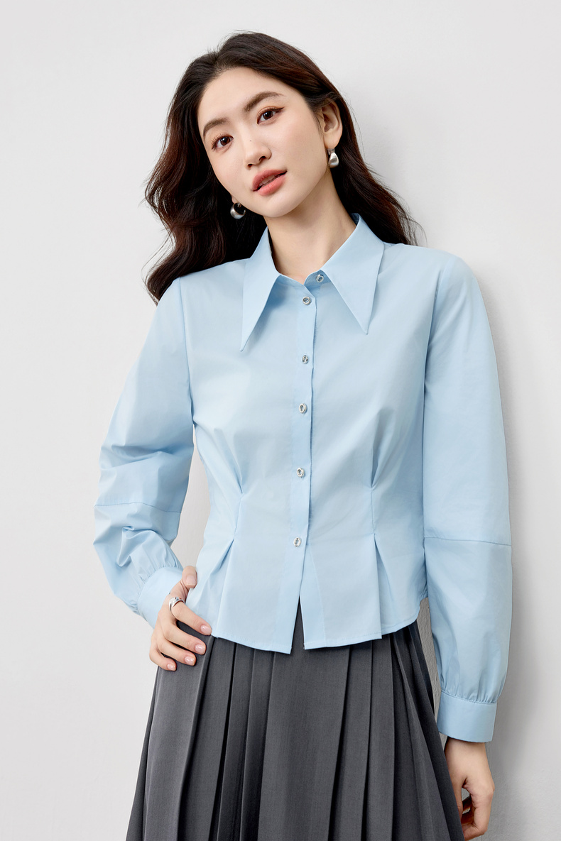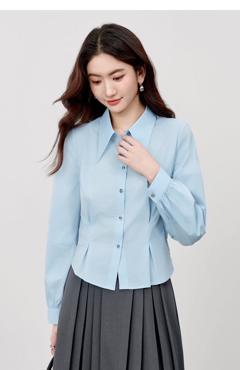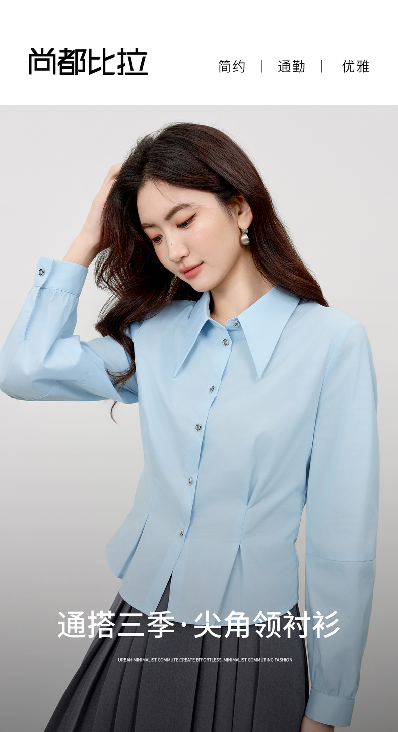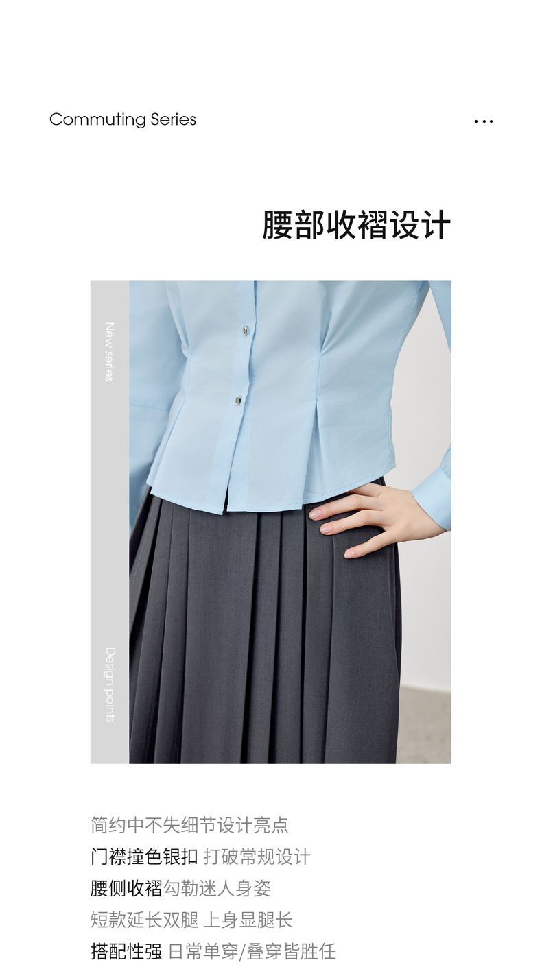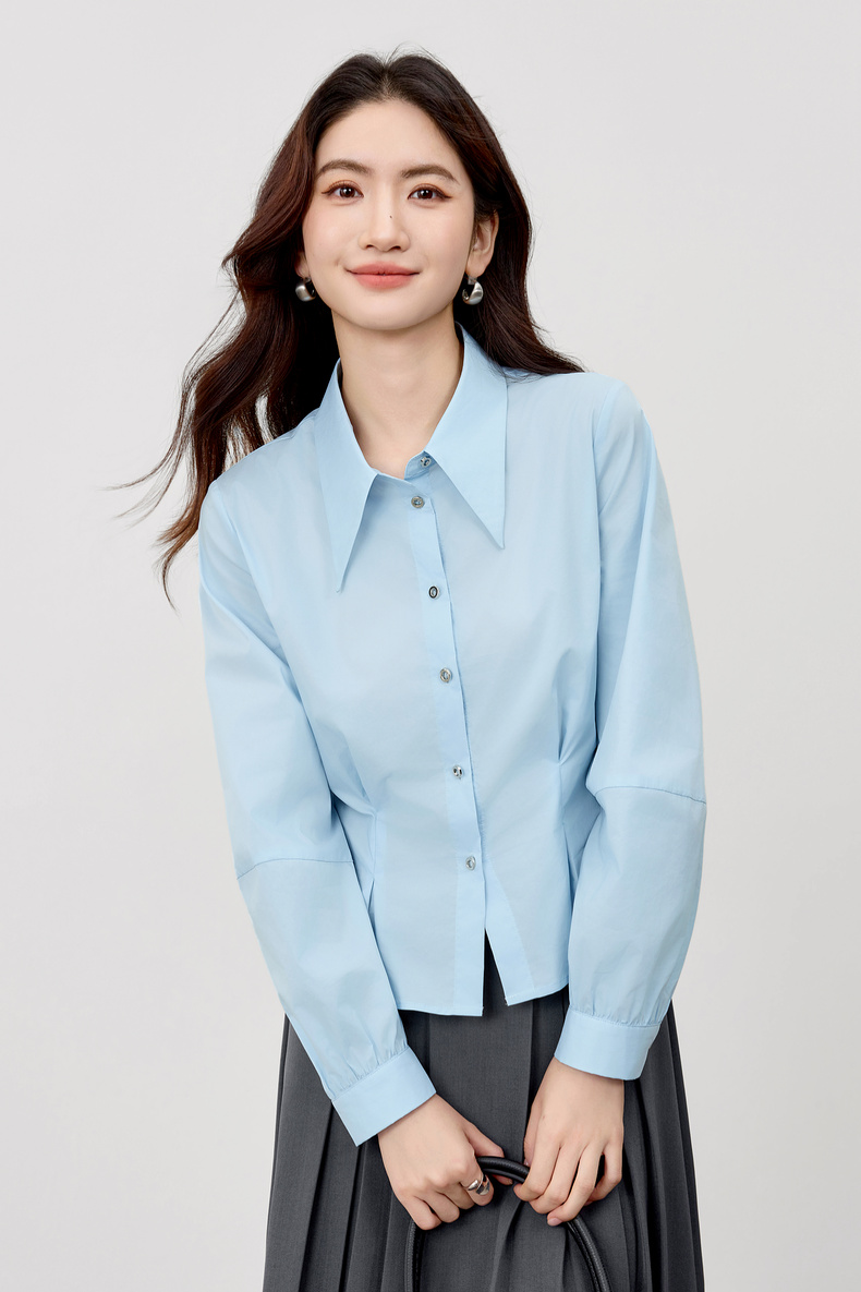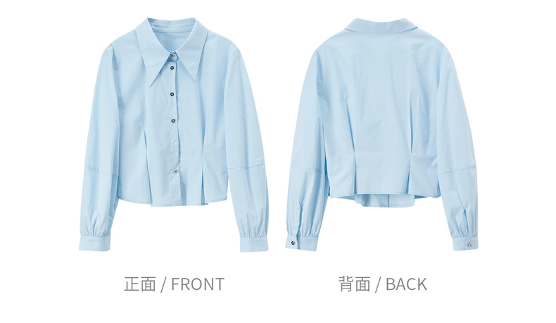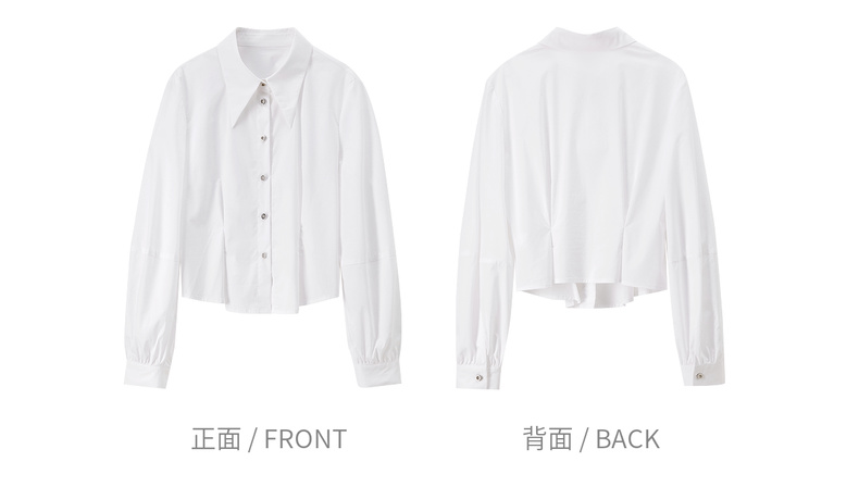 【内购】【通搭三季】简约通勤尖角领金属扣腰部收褶分割设计长袖短款衬衫-W53CB2752