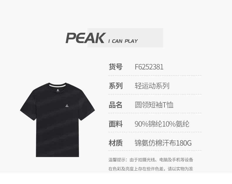 匹克2025年新款轻运动系列男款圆领短袖T恤F6252381