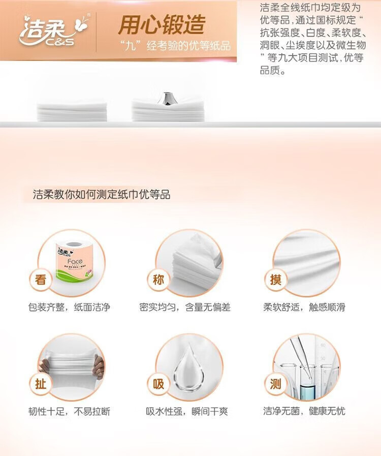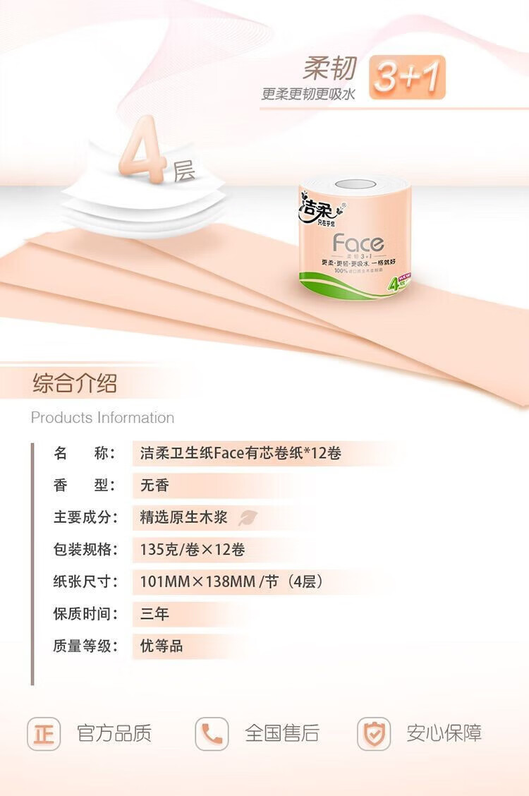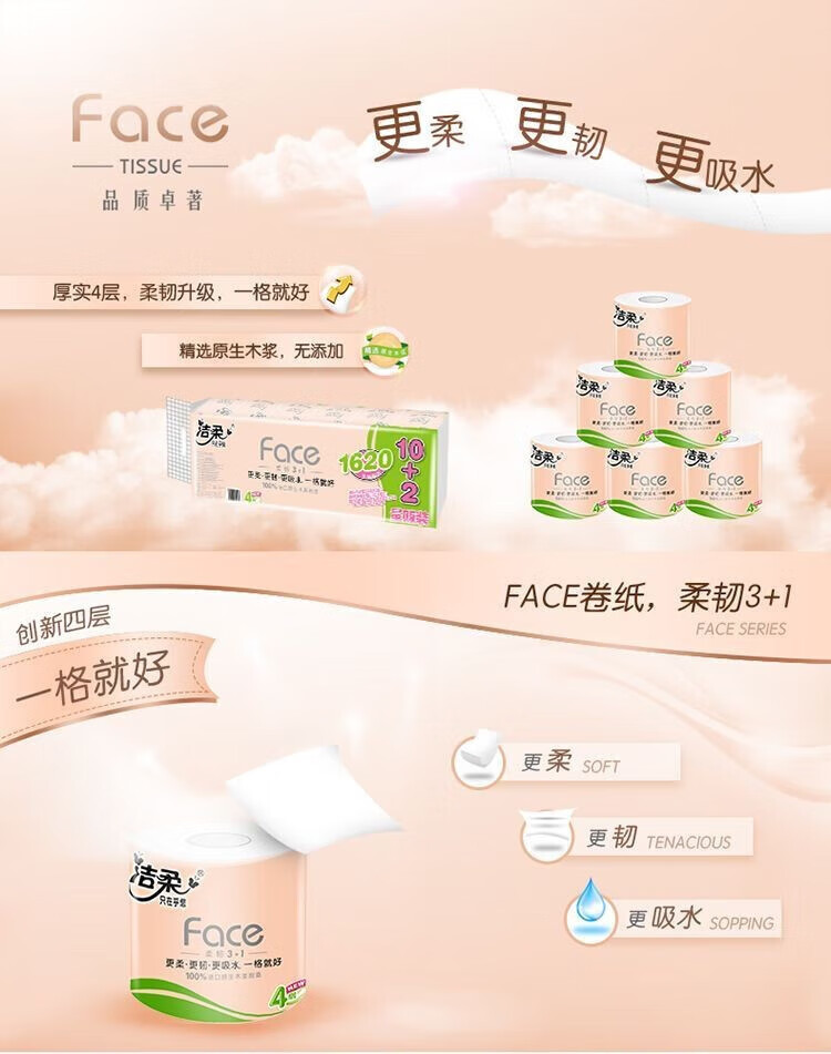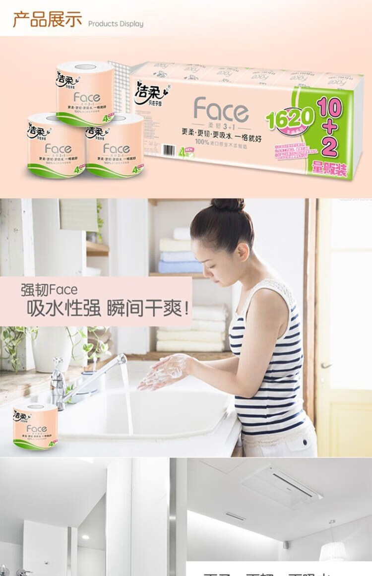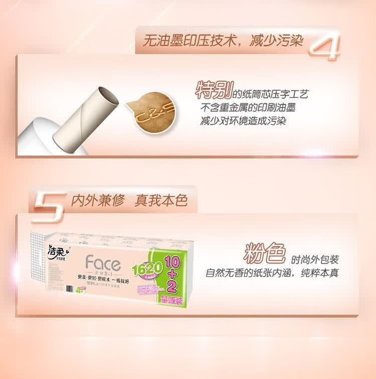 洁柔Face粉色有芯卷纸12卷1620g/提