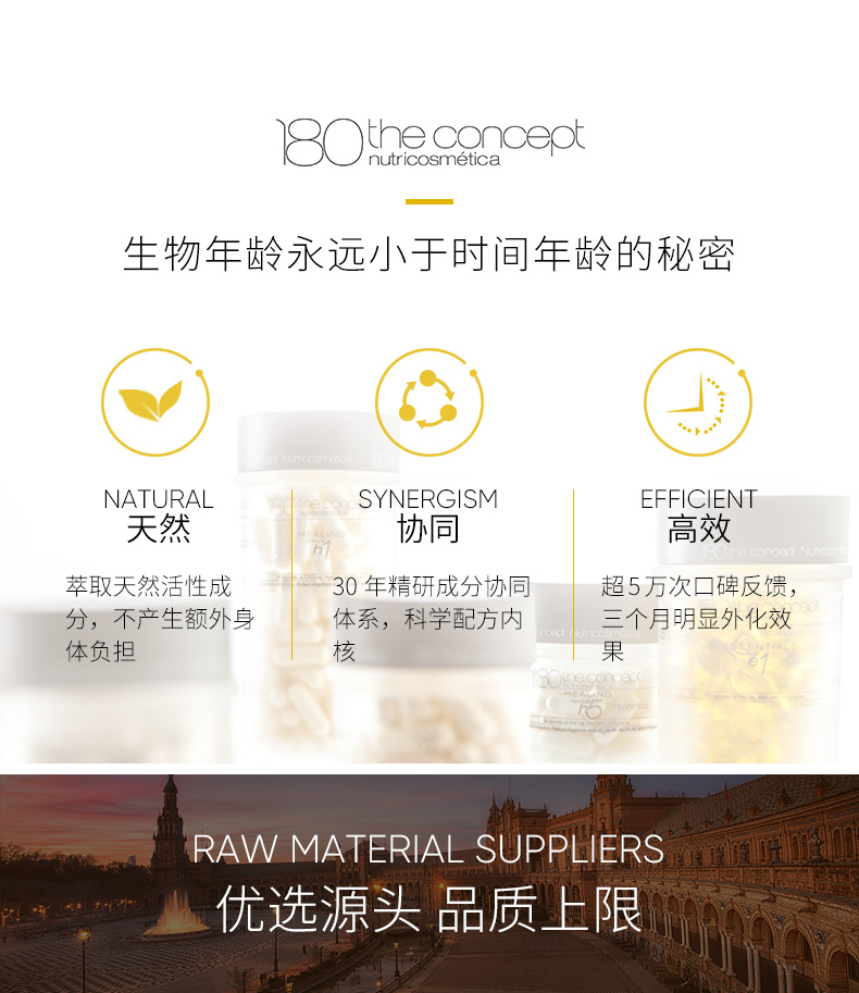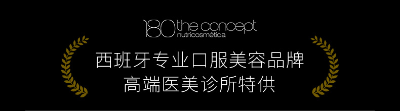 180 the concept由西班牙抗衰老和营养分析专家Gema Cabahero于2010年在西班牙创建品牌专注于美容配方保健。是西班牙各界社会名流时尚达人首选口服抗衰品 被誉为西班牙最佳美容食品