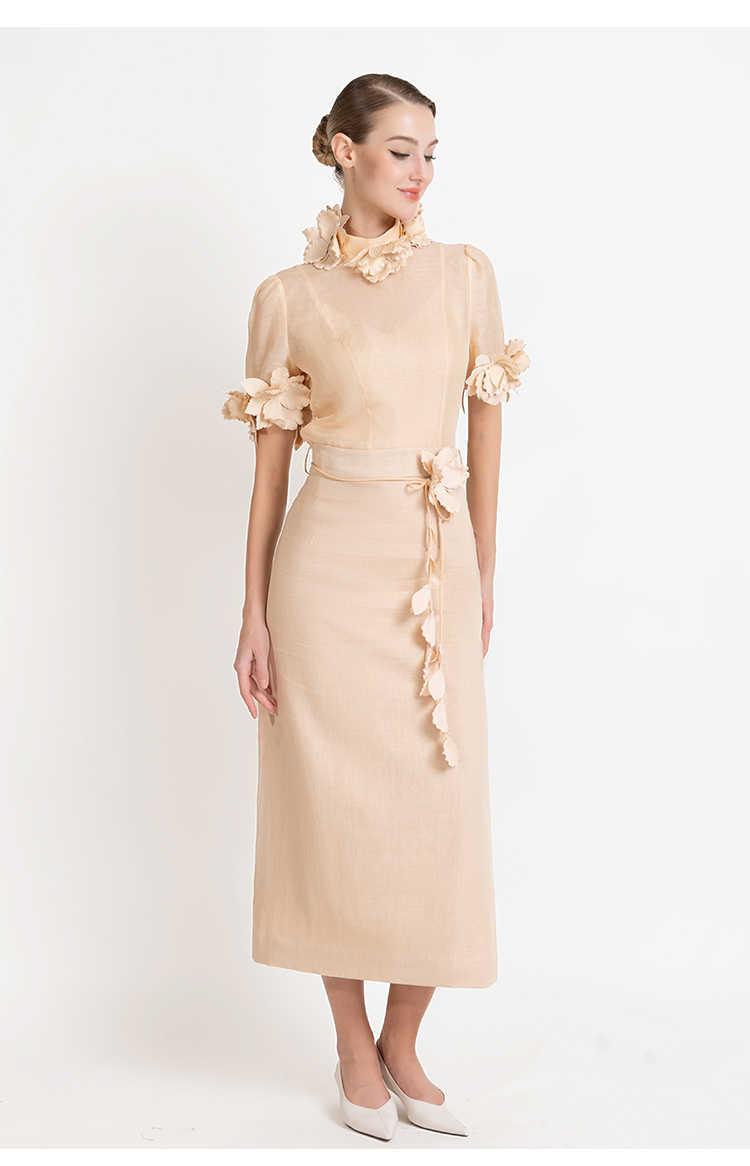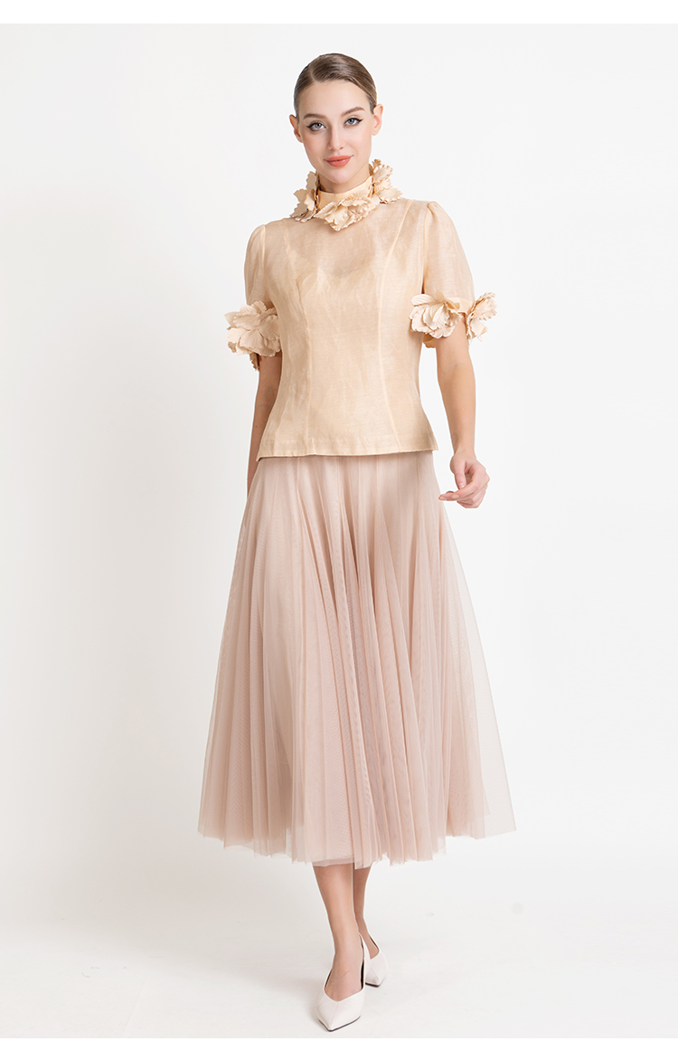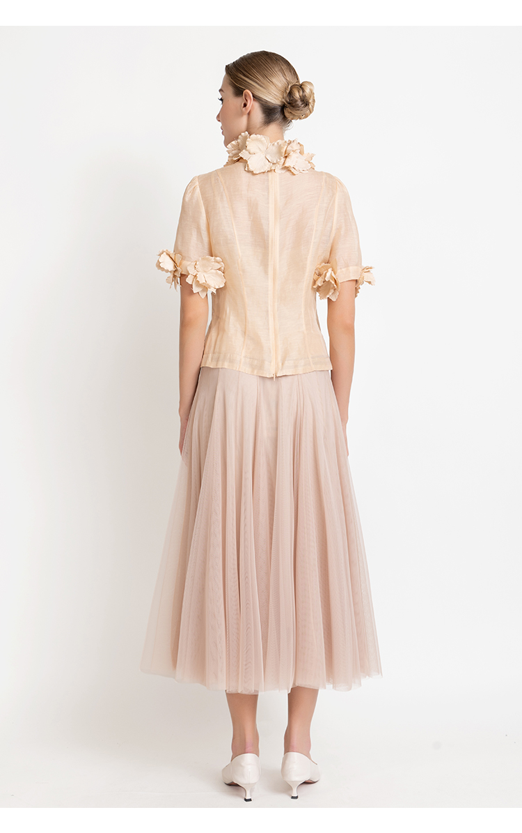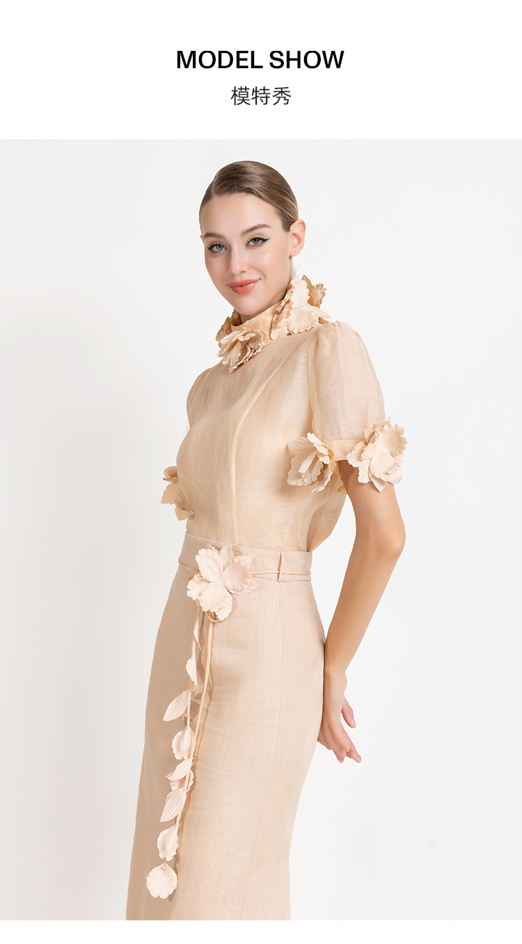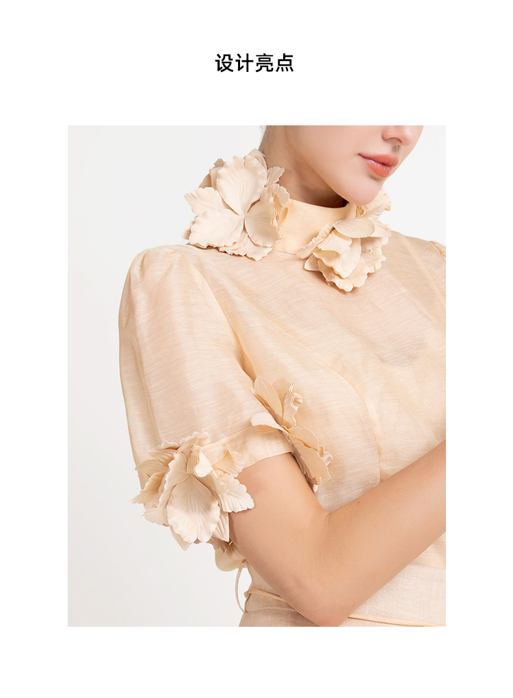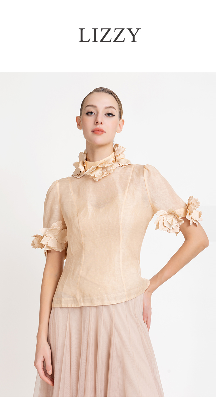 LIZZY 优雅名媛风时尚丝麻立体花短袖修身浪漫上衣{配吊带}7987