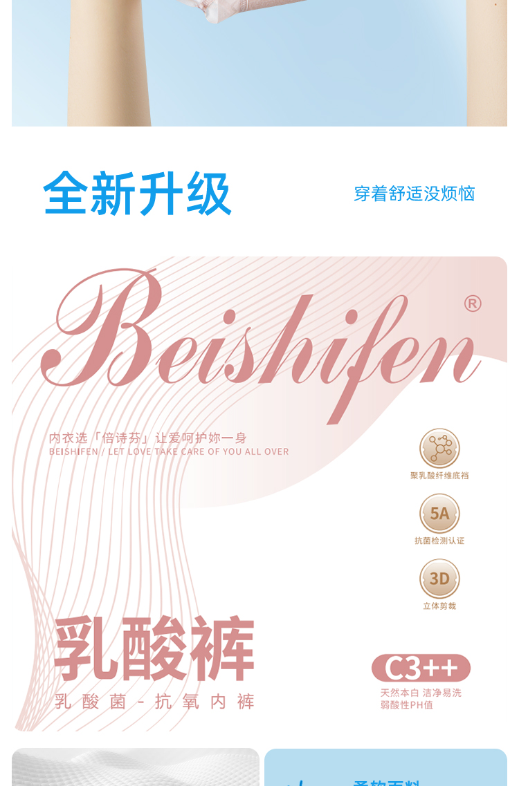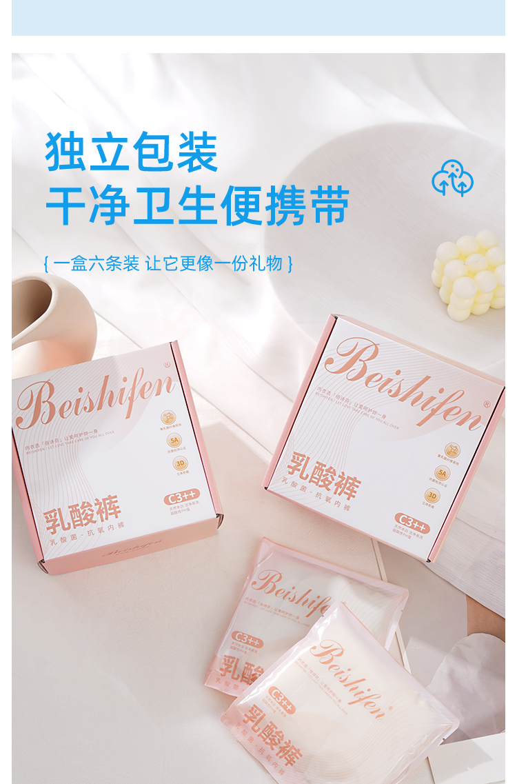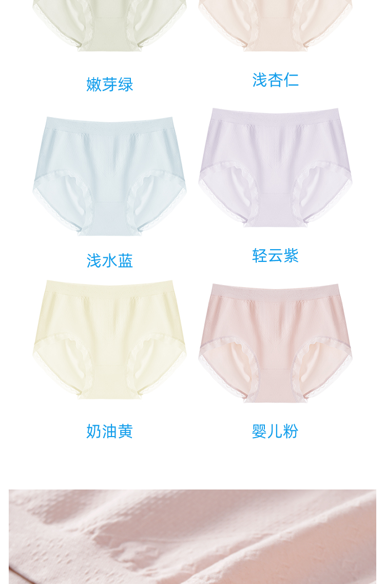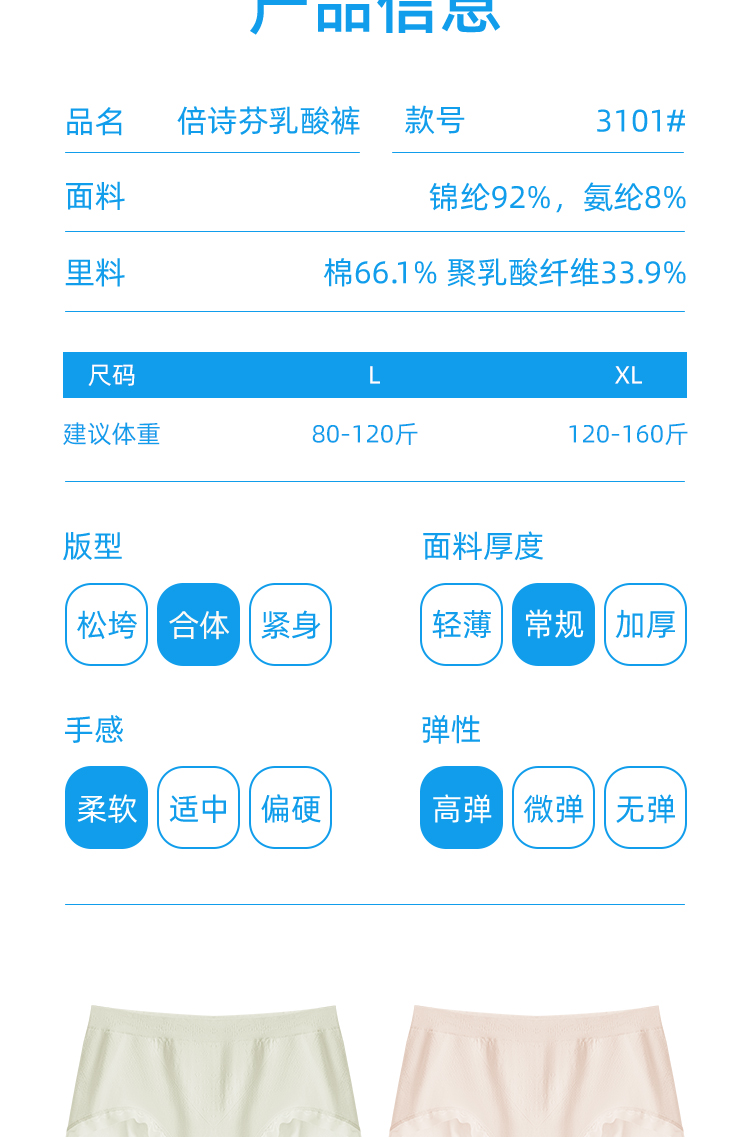 | 【品名】【超值6条礼盒装】倍诗芬乳酸裤/女士内裤 透气不闷 亲肤舒适 3101 【规格】嫩芽绿 浅杏仁 浅水蓝 轻云紫 奶油黄 婴儿粉(各一条) 【产地】国内 【尺码】L,XL 【材质】 面料:锦纶 92% ,氨纶 8% 裆部:棉66.1% ,聚乳酸纤维33.9% 【发货包装】独立包装盒 【发货地】广东省汕头市 【发货快递】申通 【不发货区域】港澳台 【补邮费地区】新疆,西藏,内蒙古+15元 【发货时效】48-72小时,周末节假日顺延 【特别提醒】因产品属于贴身衣物,非质量问题,拆封是不支持退换的,敬请谅解~ 【关于售后】退换货需收运费+3/单 |
