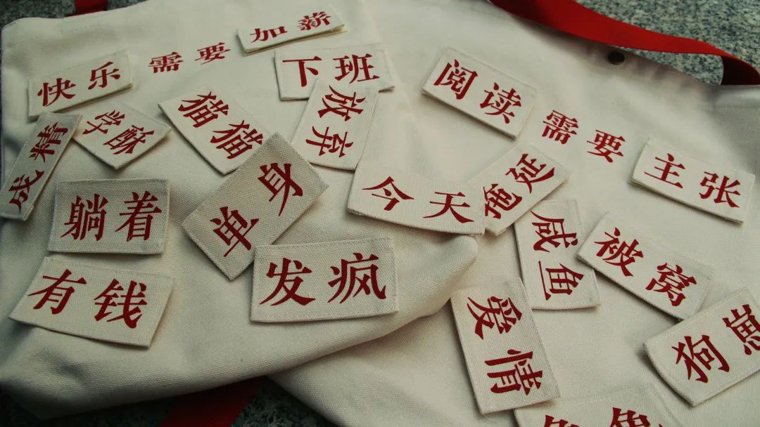 接下来,重点来了!为满足大家的个性(魔性)需要,我们在包的正面做了拼贴DIY设计,“XX”需要“XX”两边的词语,你可以根据你拥有的魔术贴自由组合。