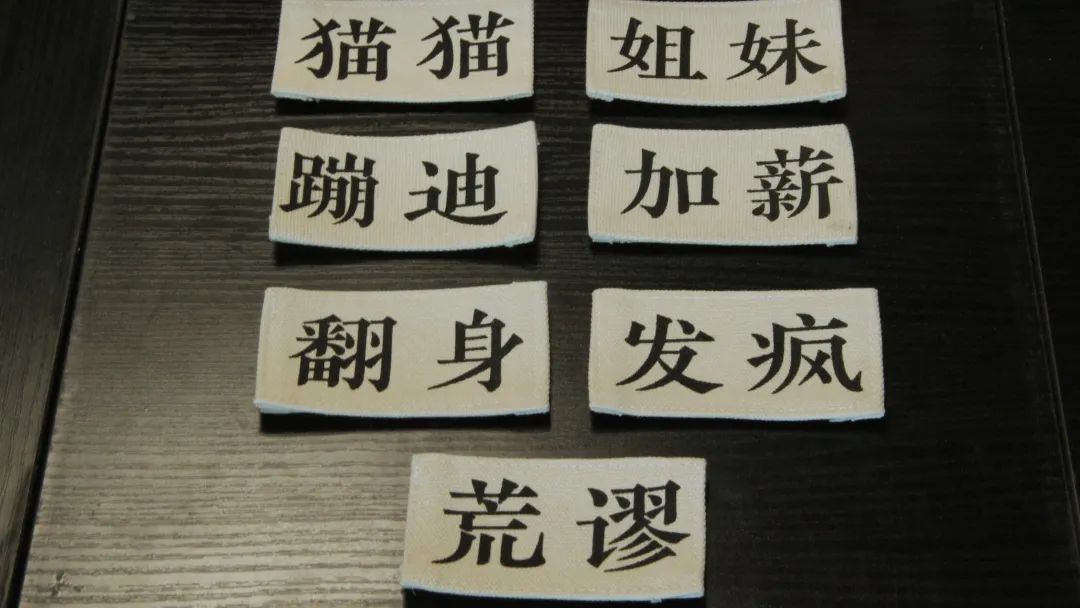 正面为“XX”需要“XX”拼贴DIY,拼贴的地方我们做了手工锁边、多种文字版本的魔术贴(红色、黑色都有)——