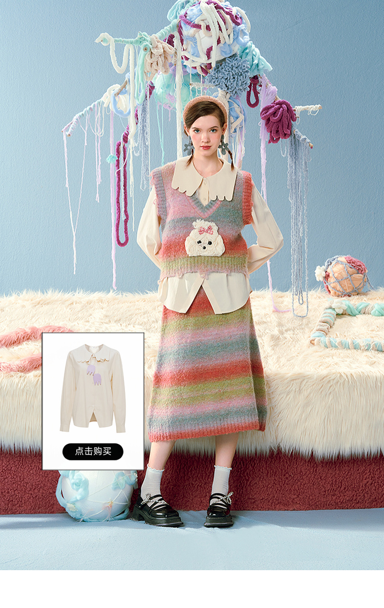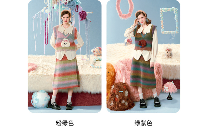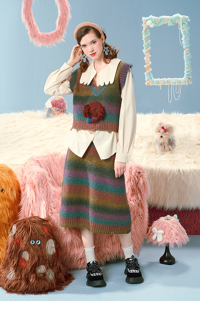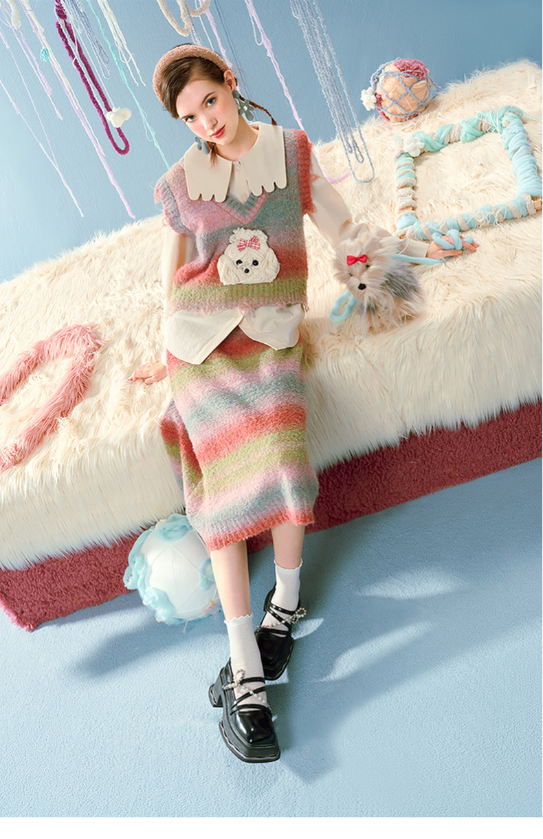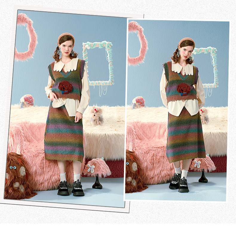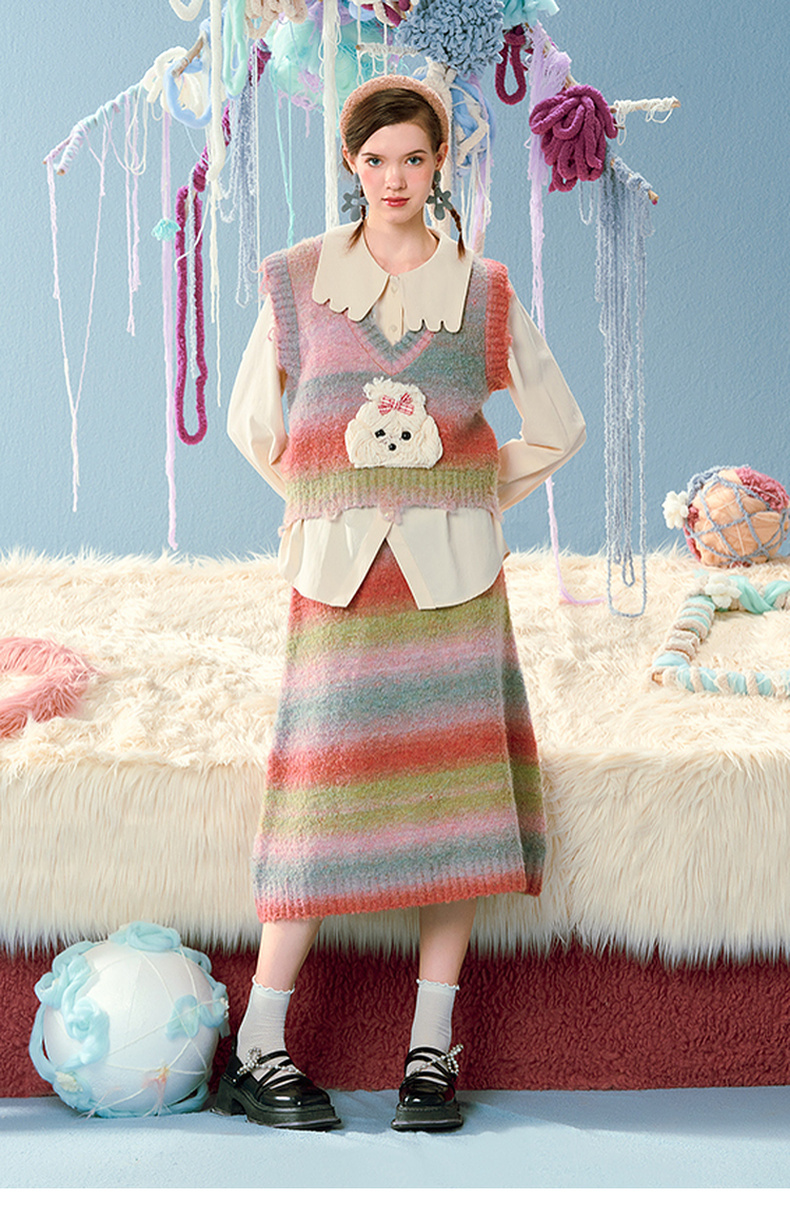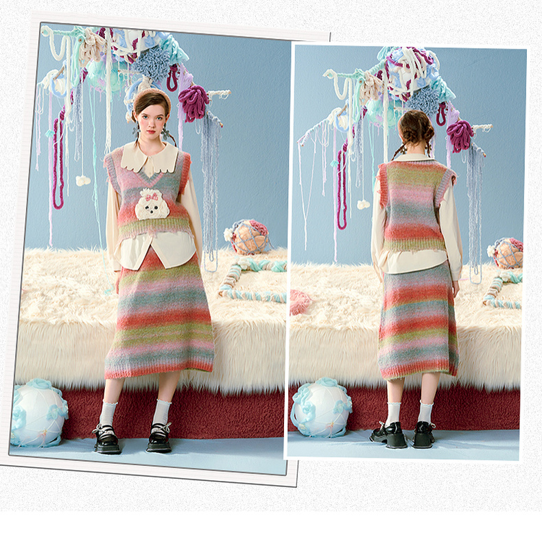 两三事马卡龙弥散立体动物装饰条纹毛织两件套女款