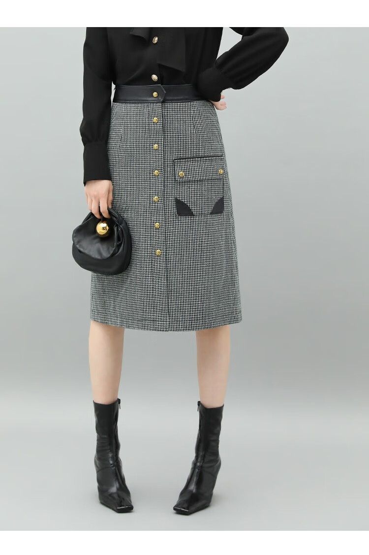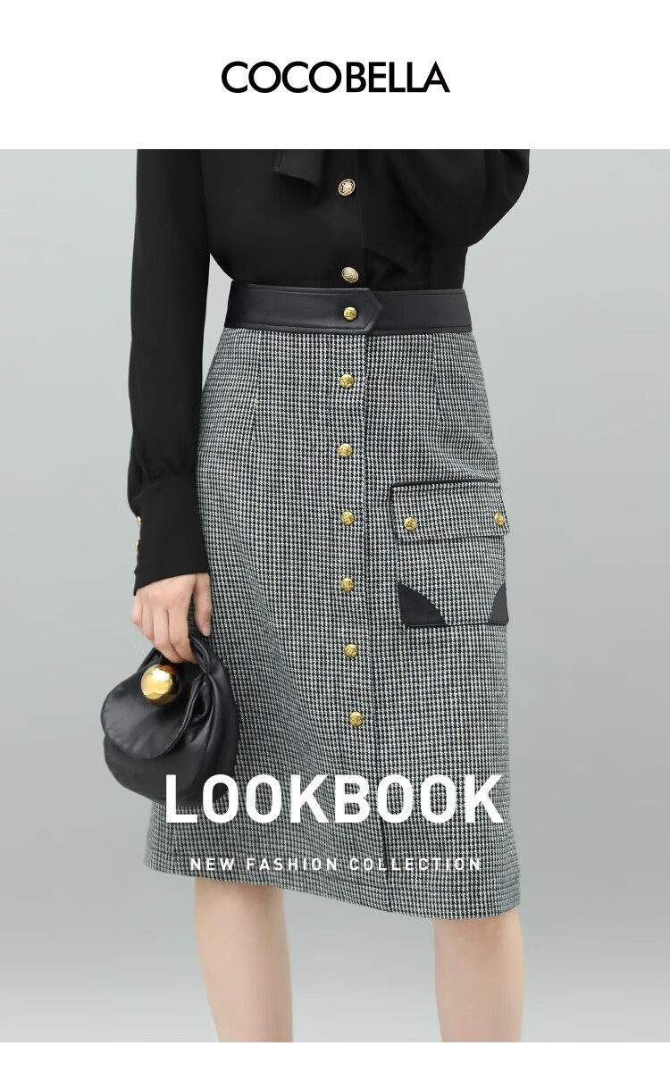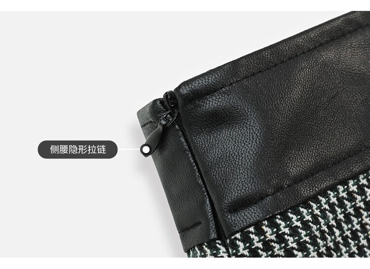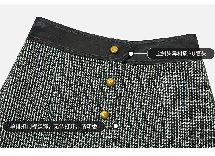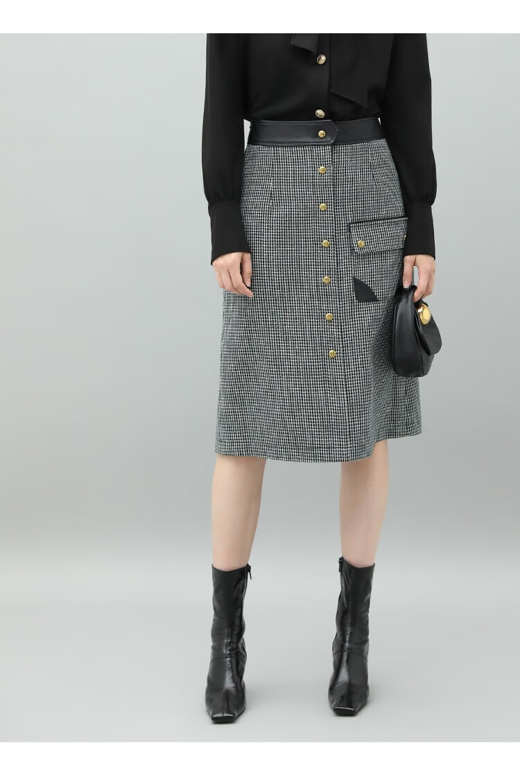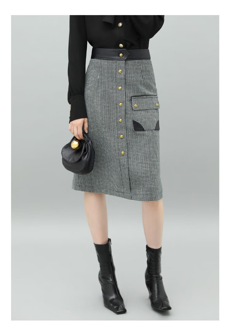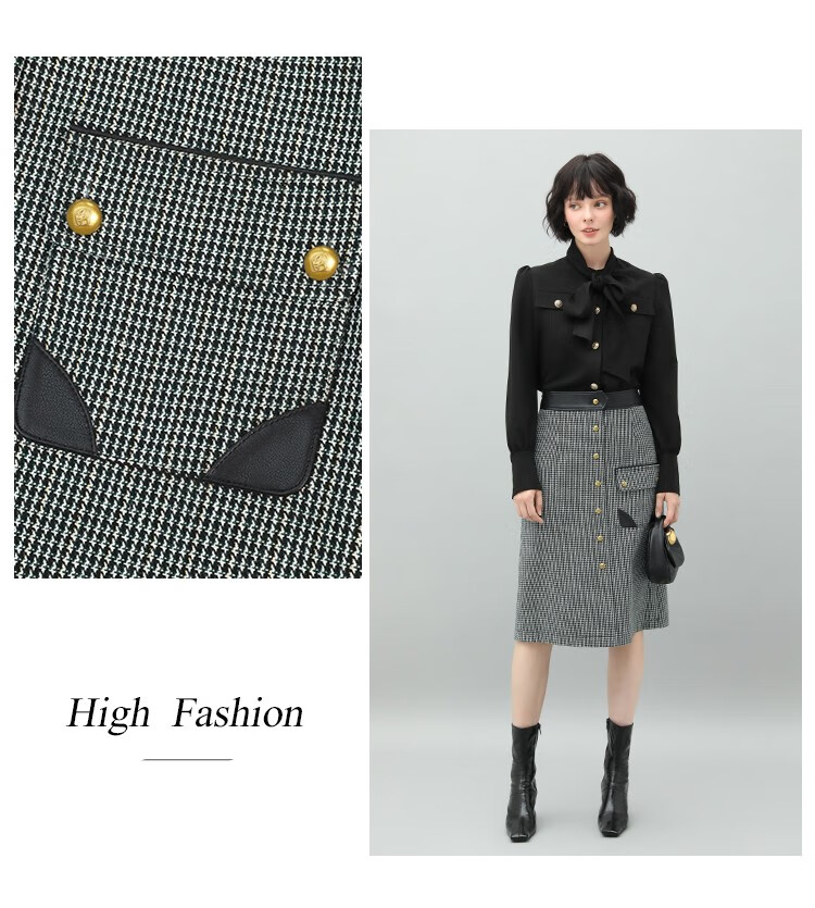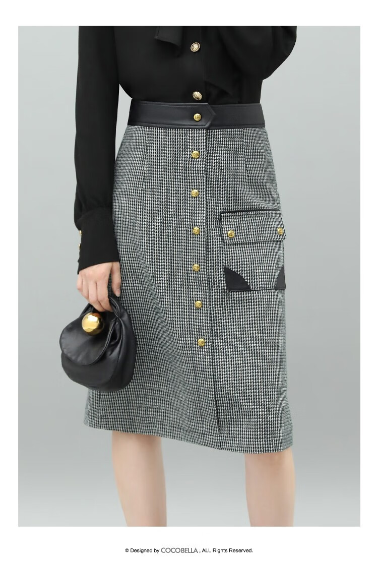 COCOBELLA质感PU拼接及膝千鸟格半身裙女秋冬气质A字裙HS551