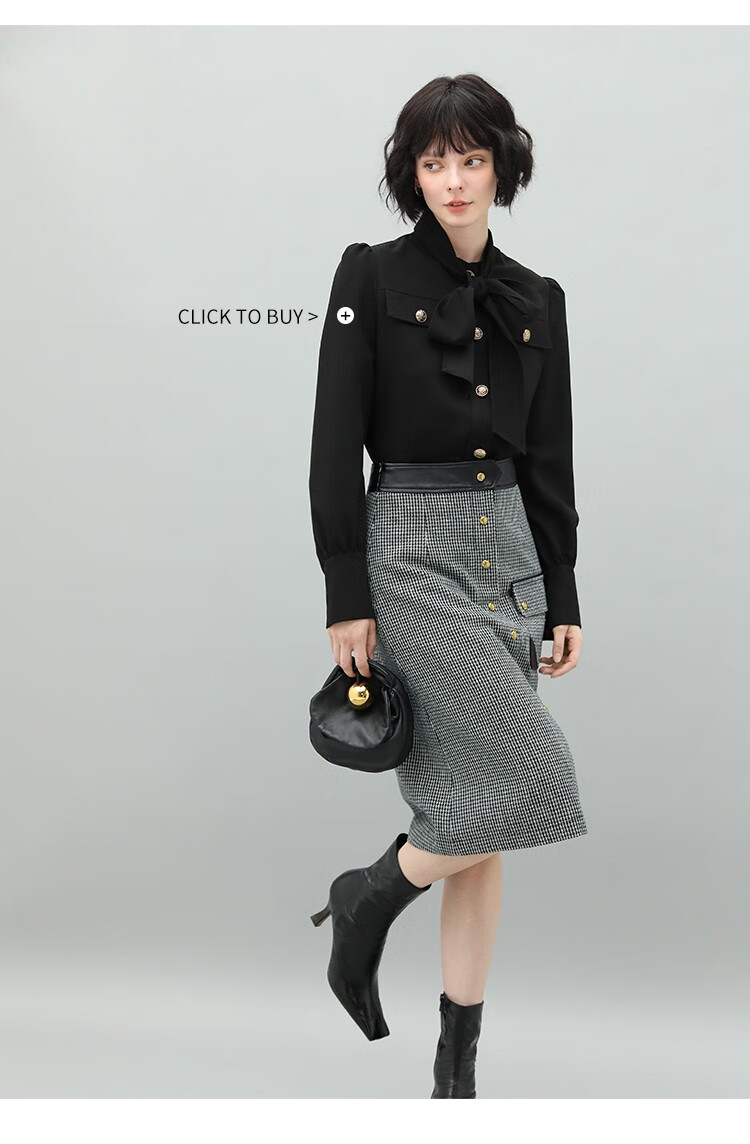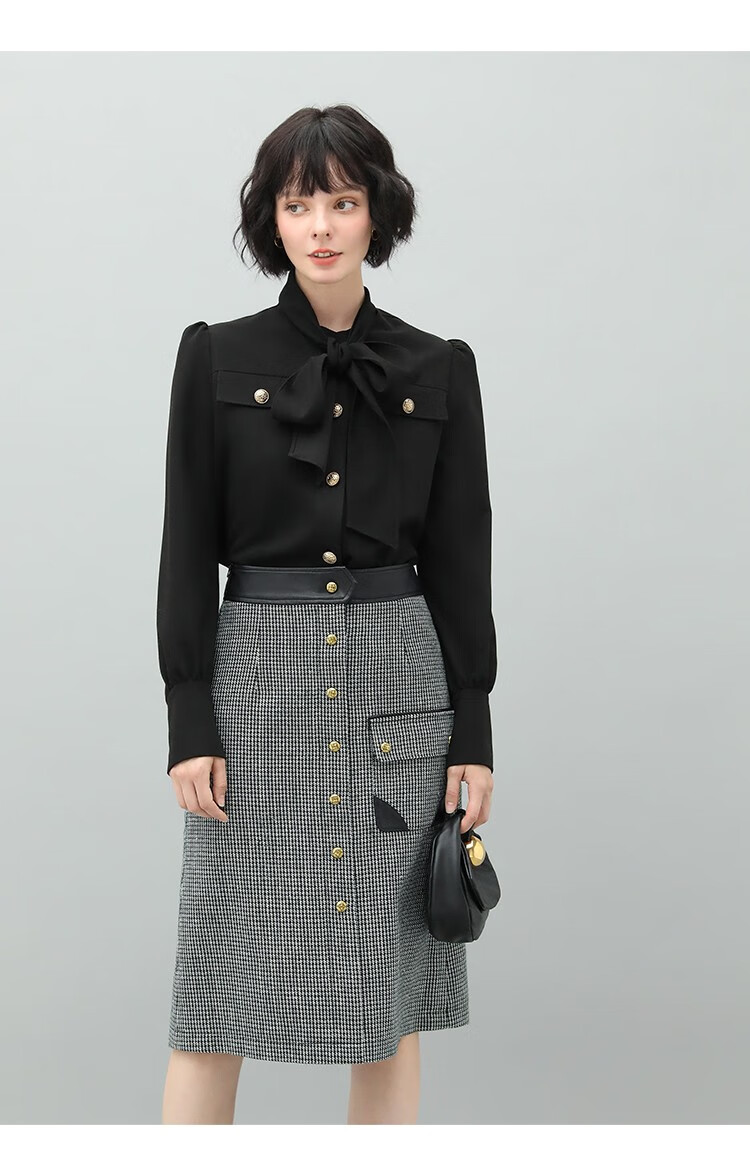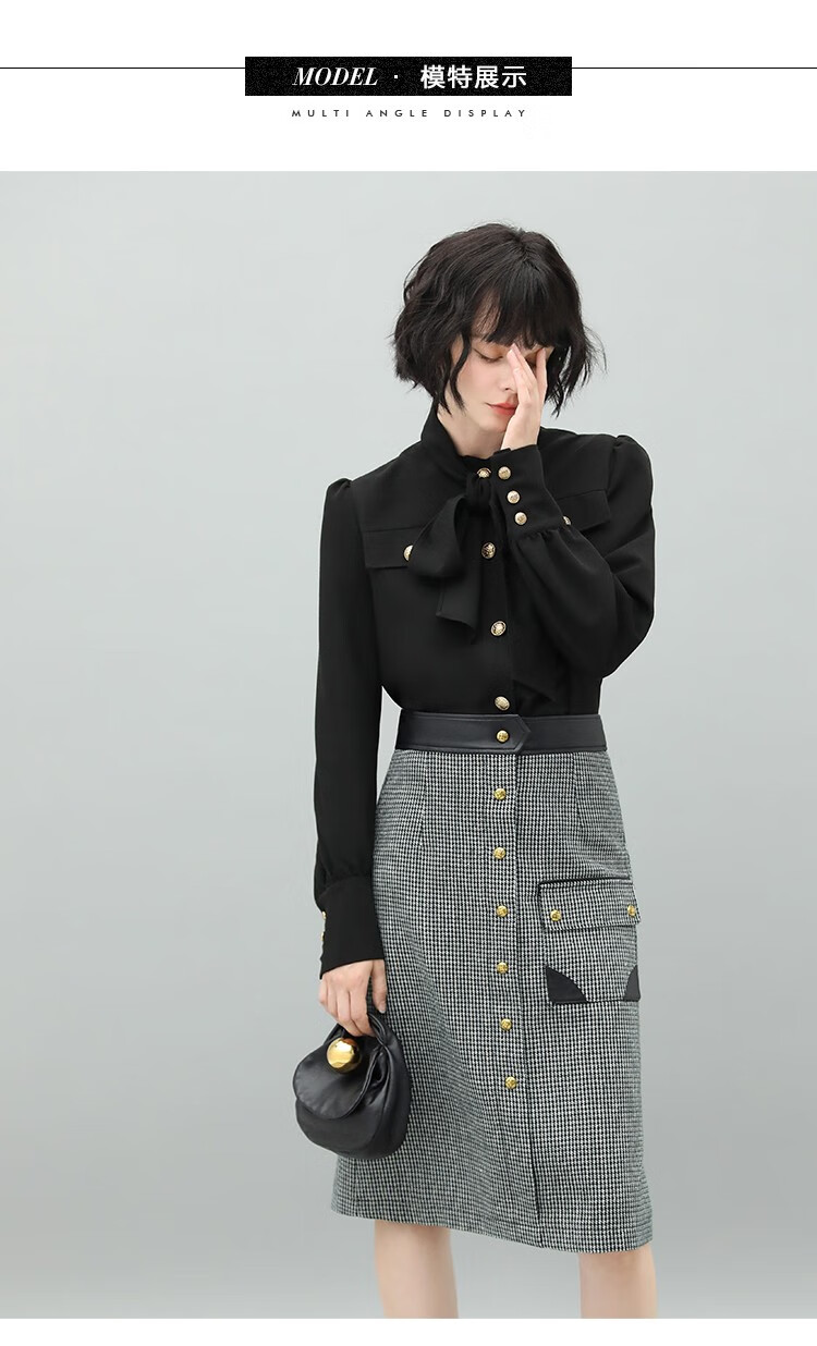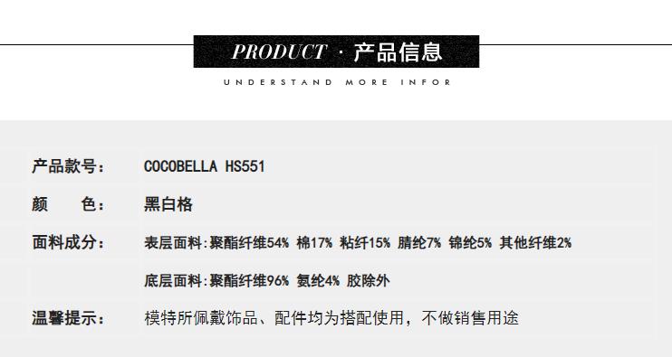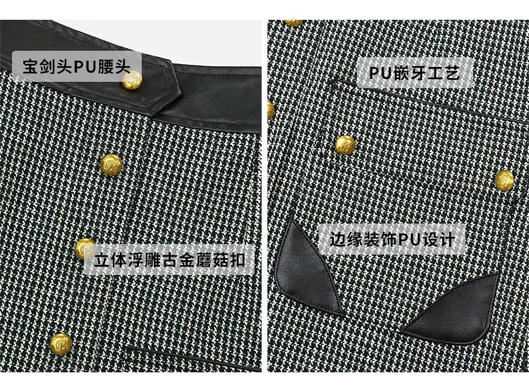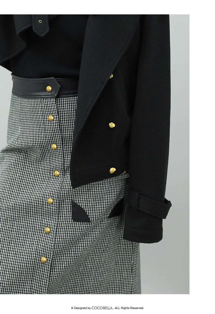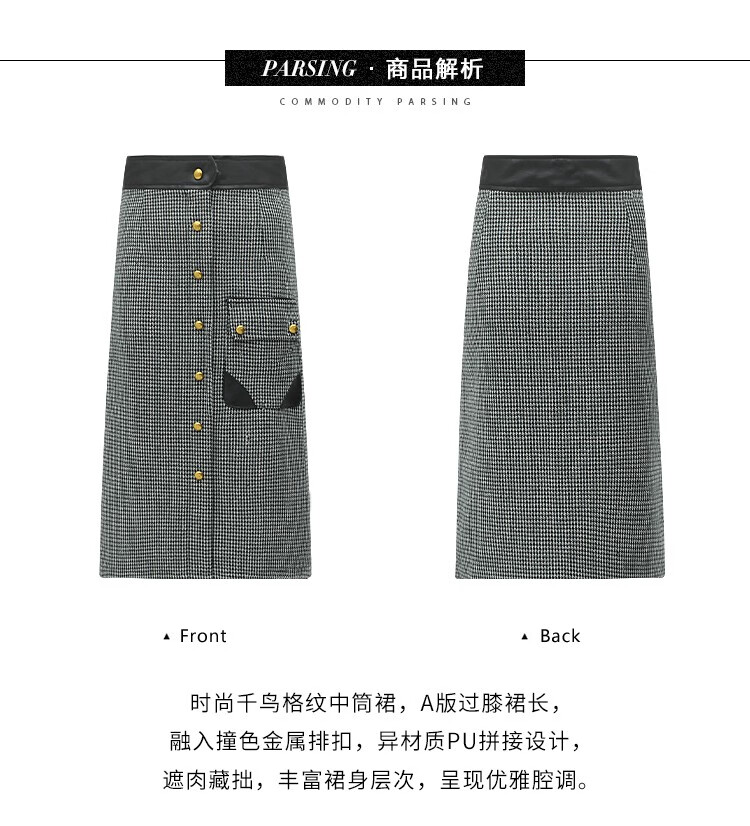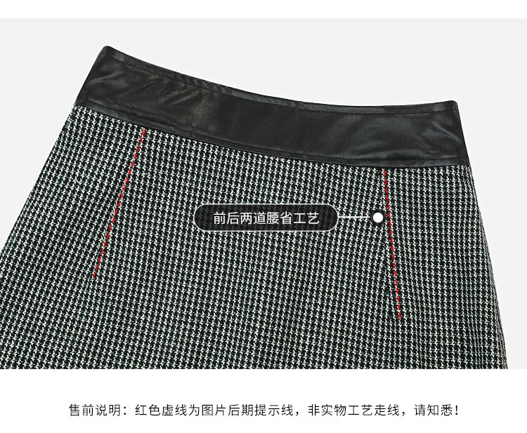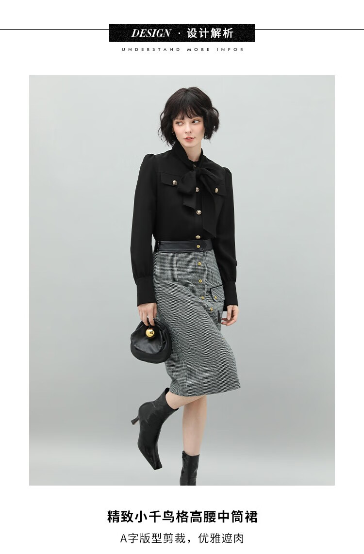 COCOBELLA质感PU拼接及膝千鸟格半身裙女秋冬气质A字裙HS551