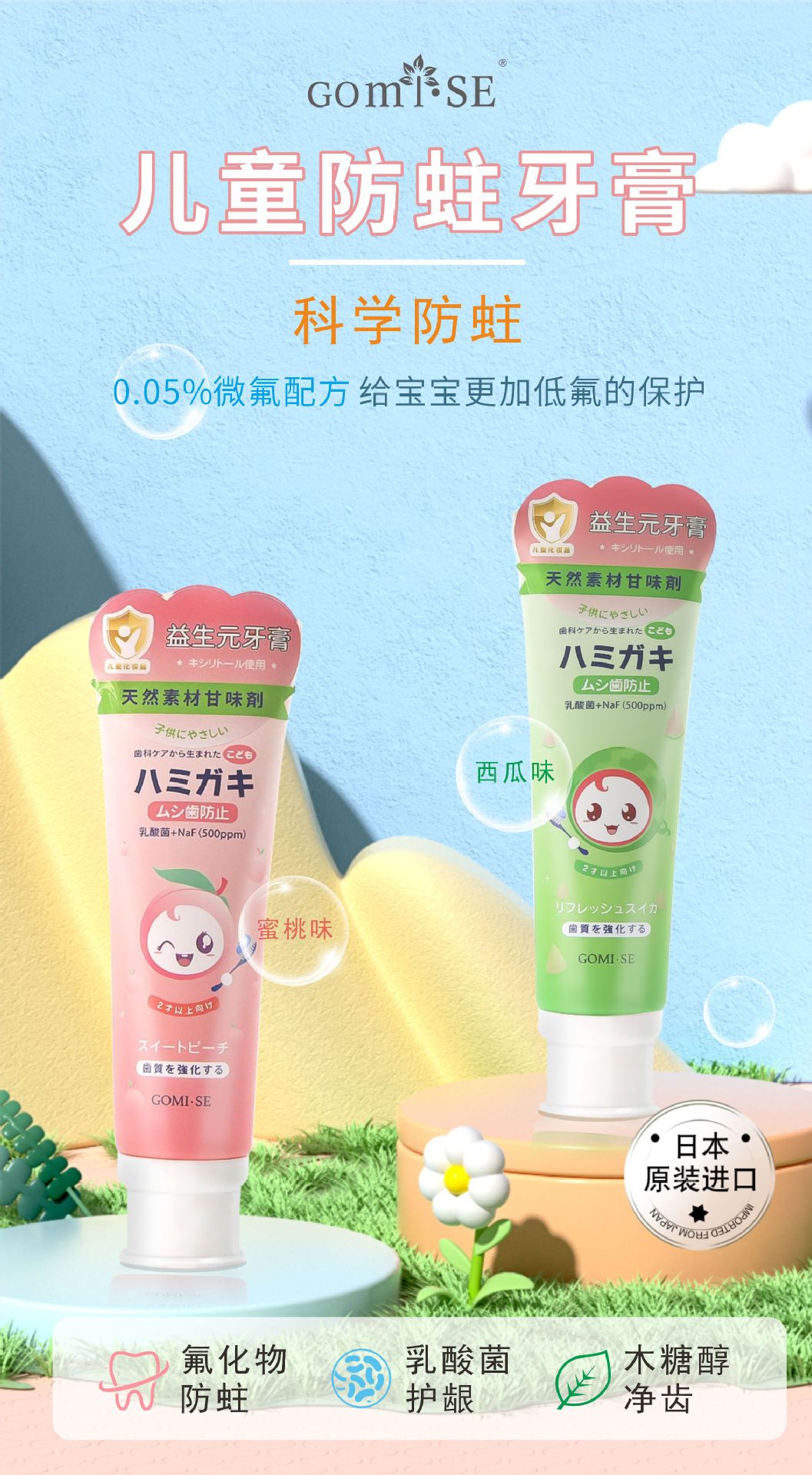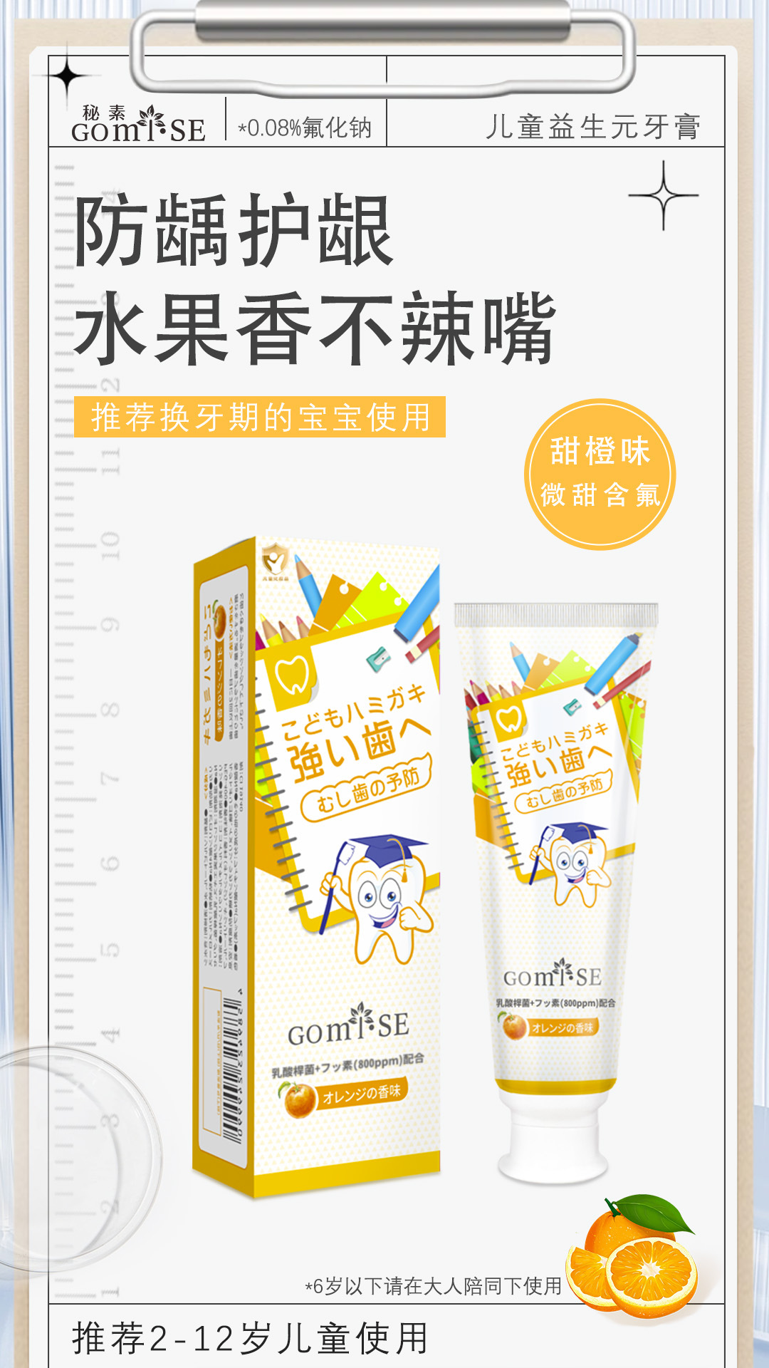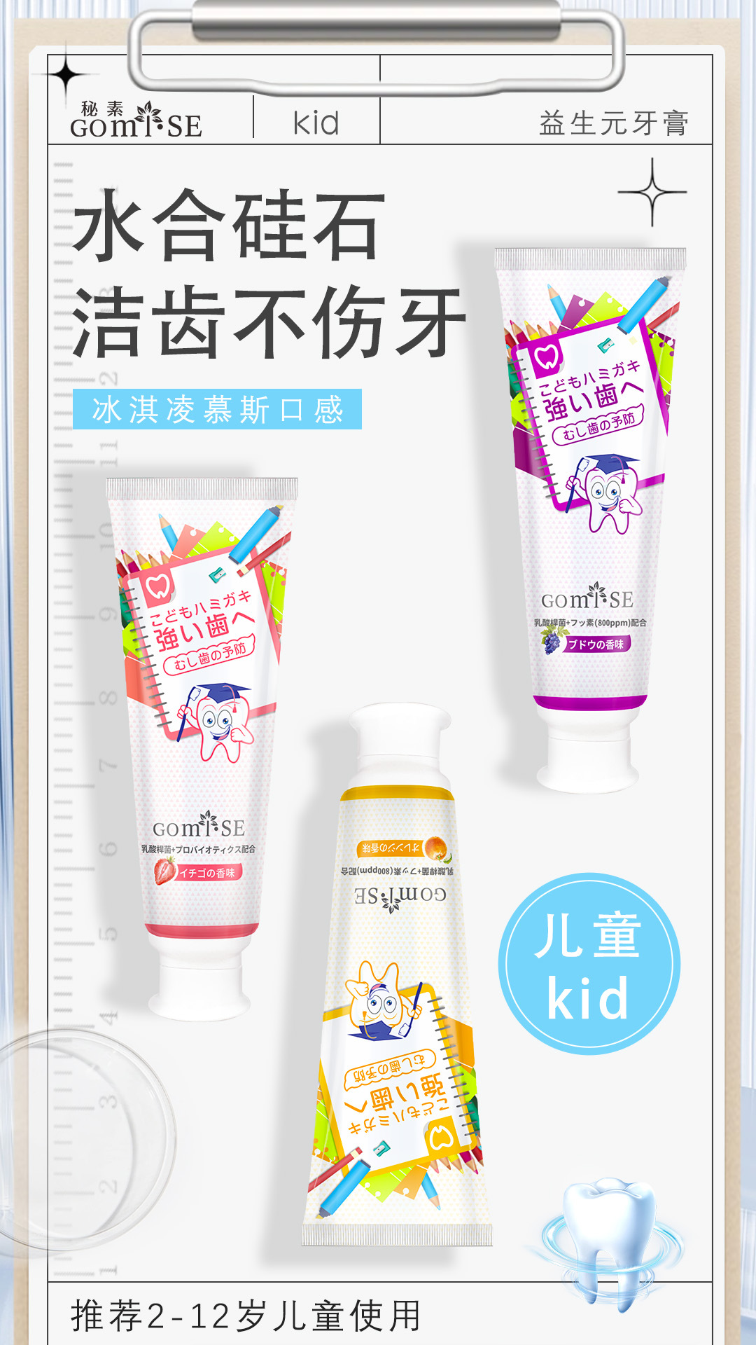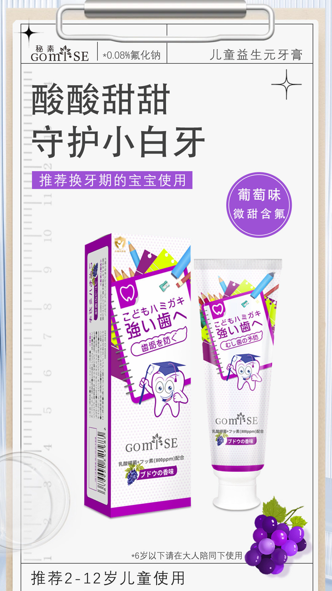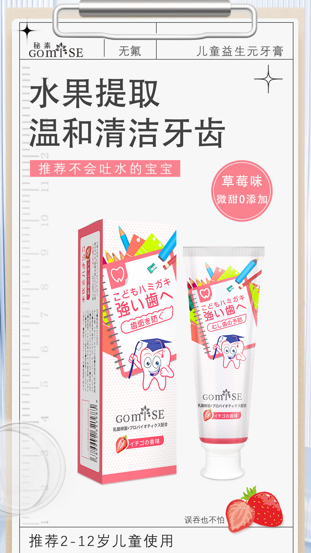 日本秘素儿童益生元牙膏3-12岁含氟防蛀固齿护龈无刺激正品批发
