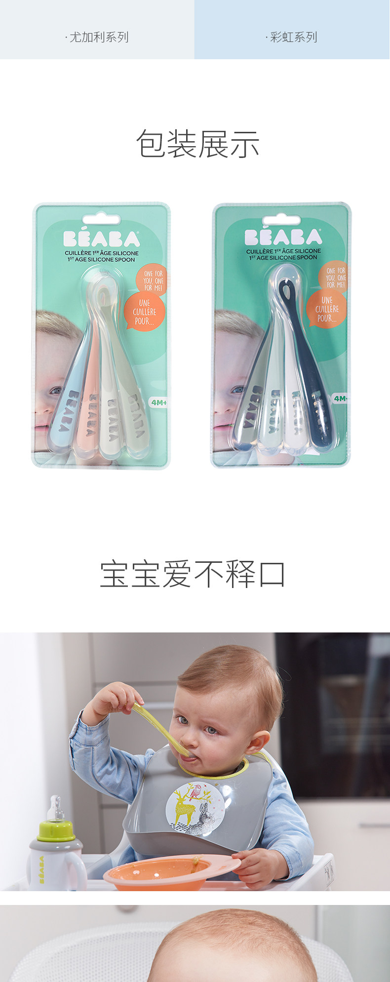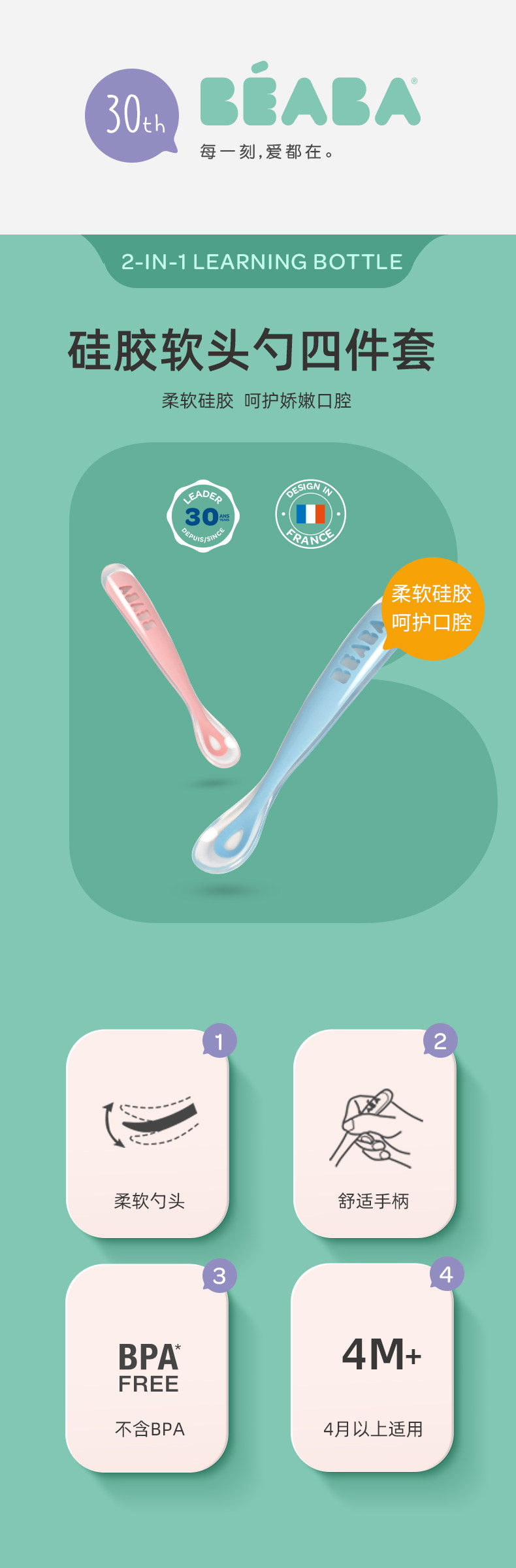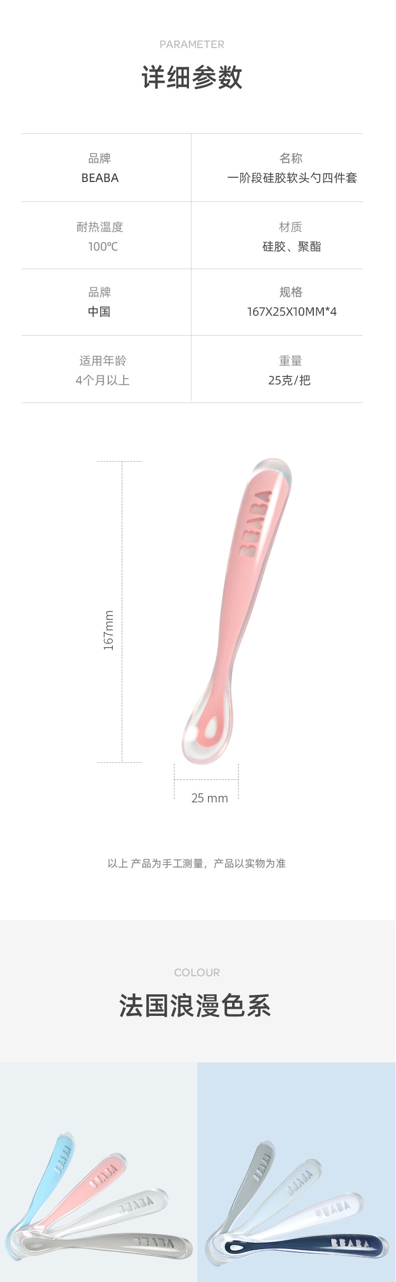 法国BEABA一阶段儿童硅胶软勺 4只装 宝宝碗勺餐具婴儿勺子新生儿软头勺