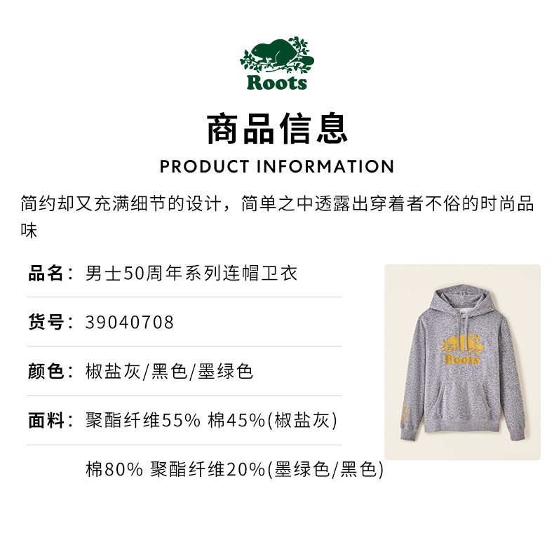【2件9折】【ROOTS】男式50周年系列连帽卫衣