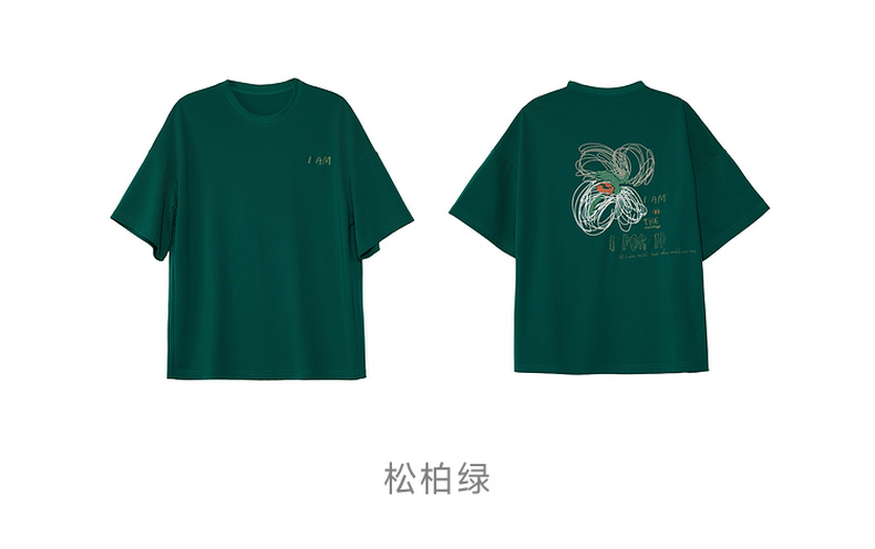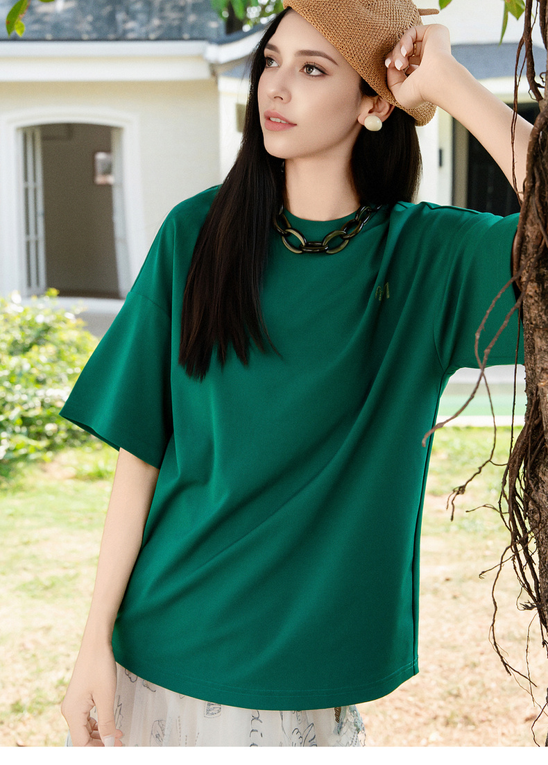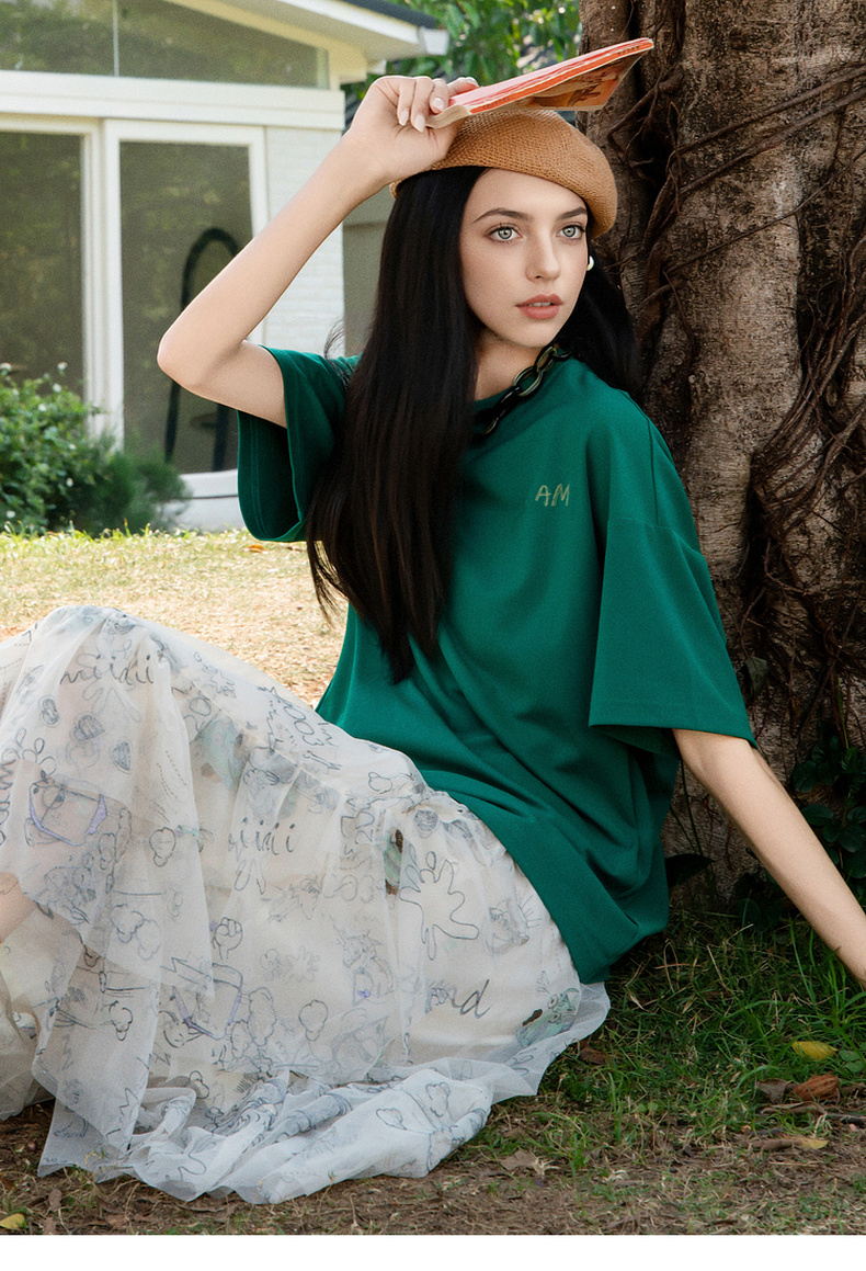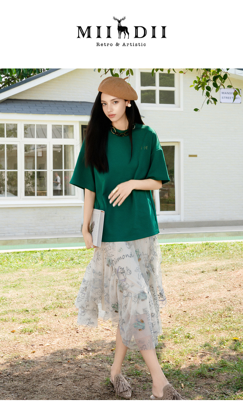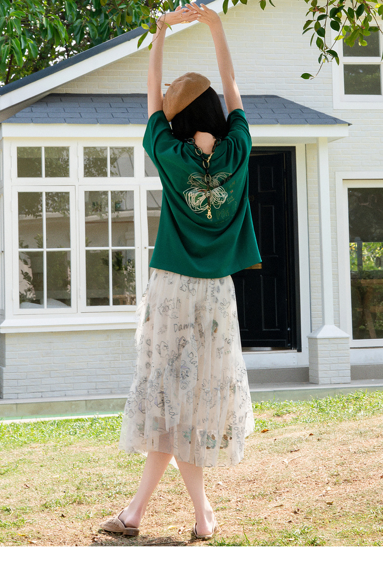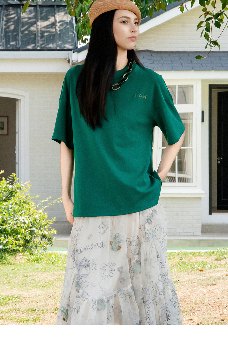 谜底绿色T恤短袖女2025夏季新款后背印花宽松圆领上衣256MT6213