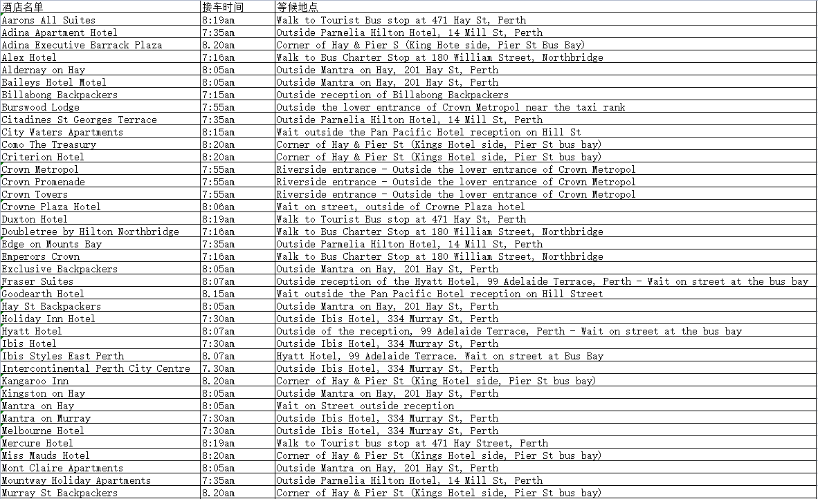 提供部分珀斯酒店接车服务,请预留酒店信息,少数市区酒店需要到就近点上车,请以最终预定确认为准。