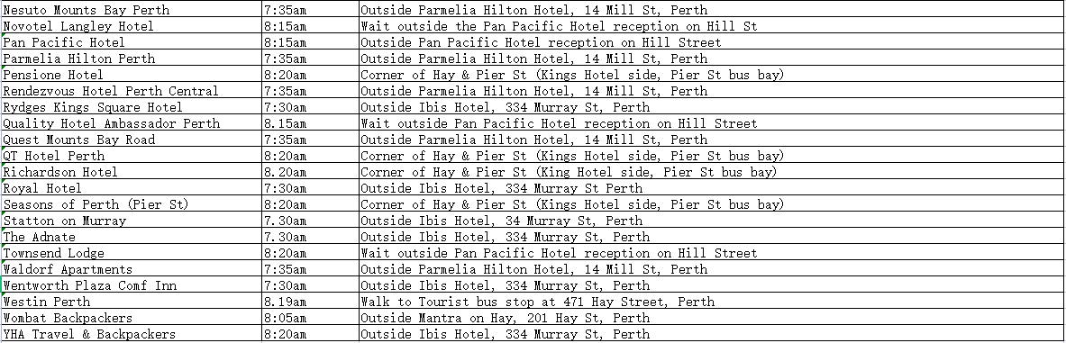 请注意,从珀斯出发的酒店接送服务仅适用于上午8:45从珀斯到罗岛的服务。目前还没有提供返回珀斯市的接送服务,您必须自己寻找交通工具返回住宿。