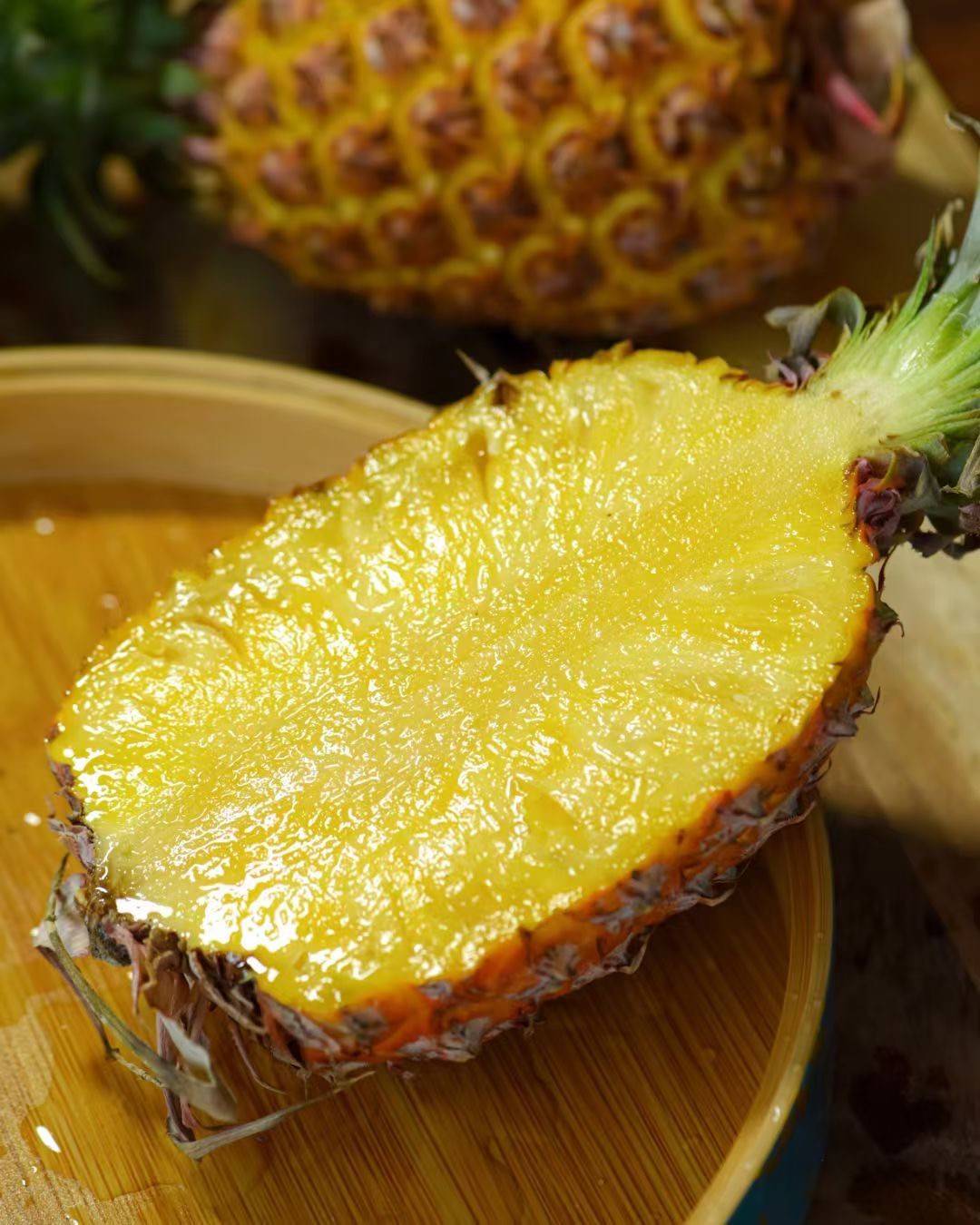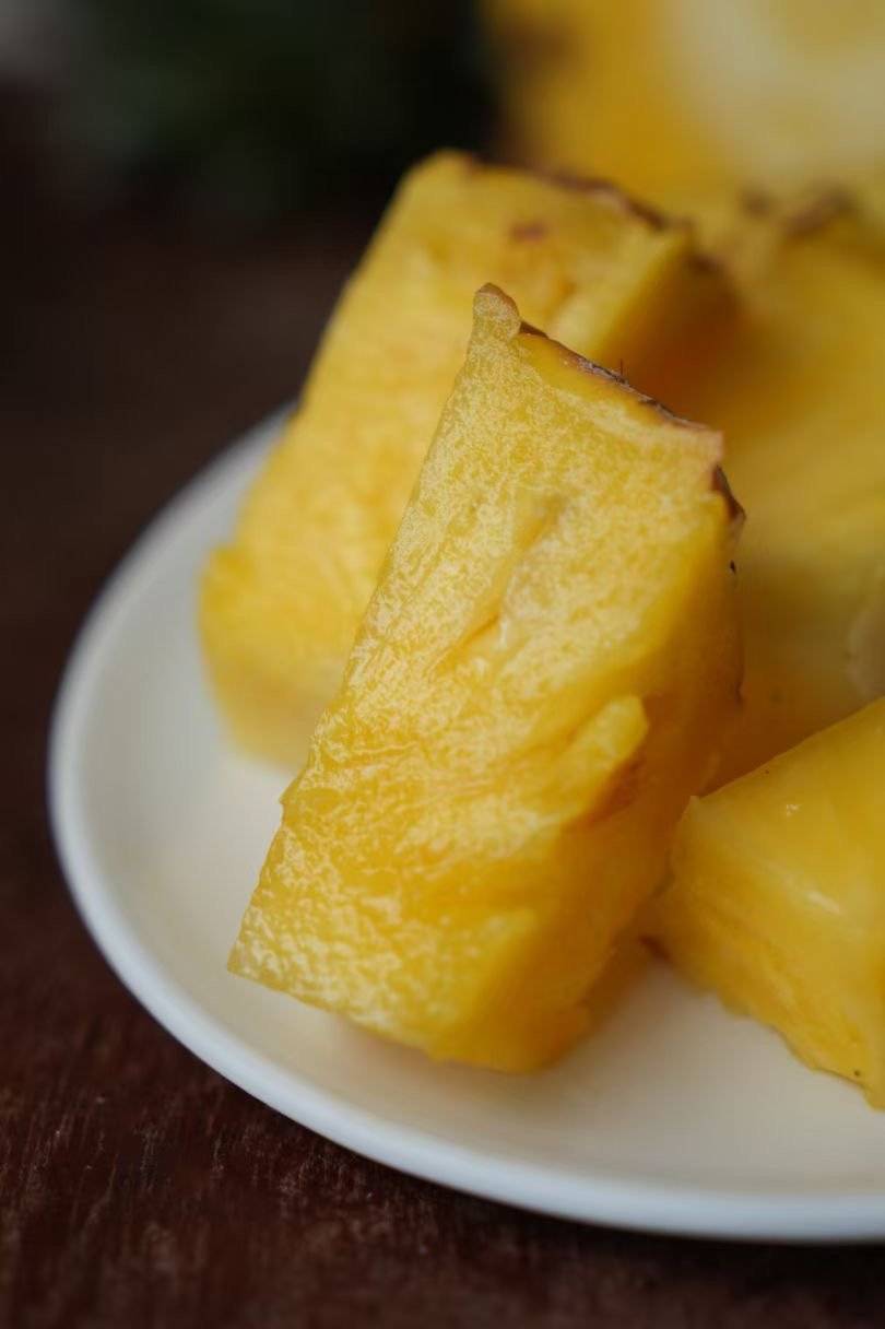 正宗的海南金钻凤梨,凤梨不同于菠萝酸涩的口感,它皮薄肉厚,酸甜有味,切开那薄薄的果皮,露出金色的果肉,空气中弥漫着凤梨醉人的清香味,充盈的汁水顺着果肉的切面流淌,浓郁的热带水果香气炸开~馥郁香甜!又带着水润的清爽~
