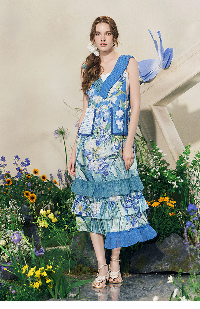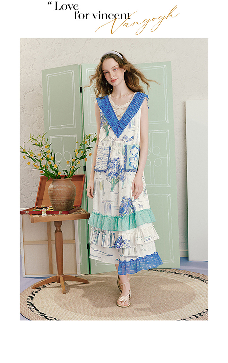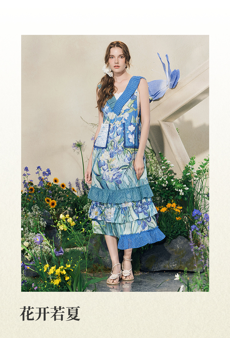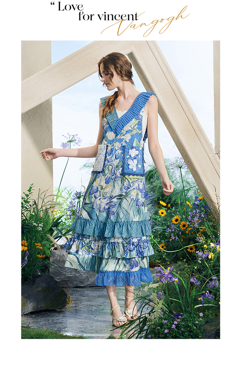两三事梵高文艺花开若夏2025夏季新款压褶荷叶边印花蛋糕裙连衣裙