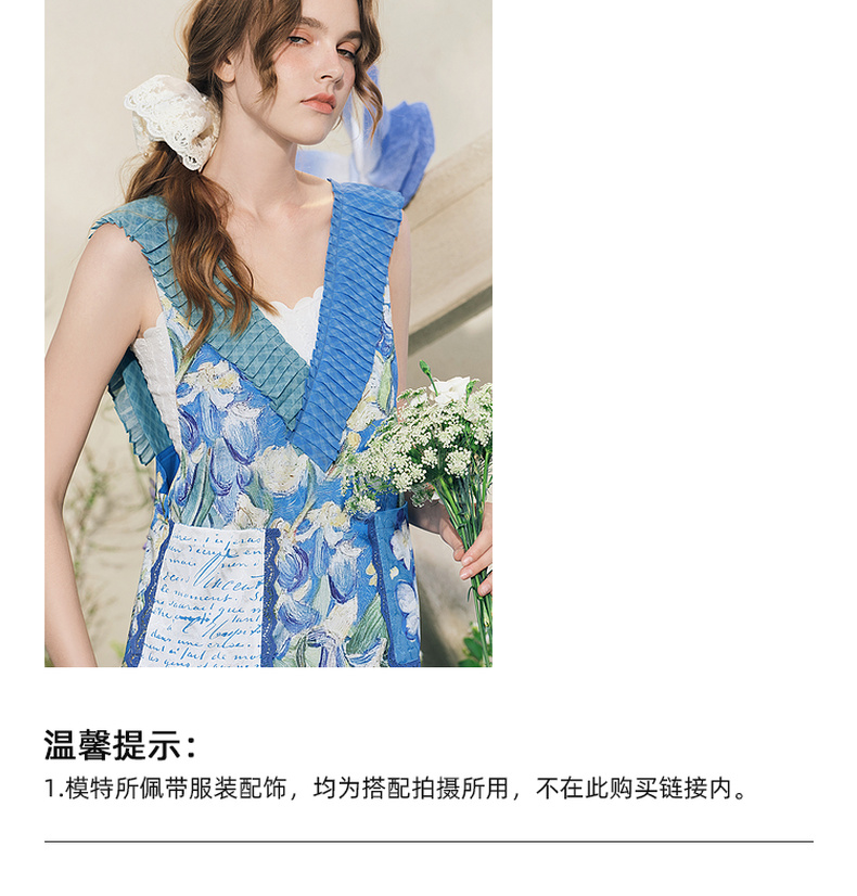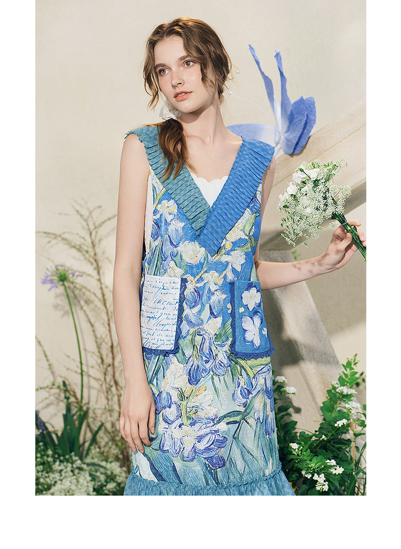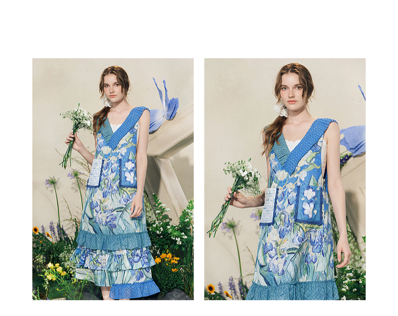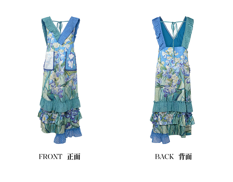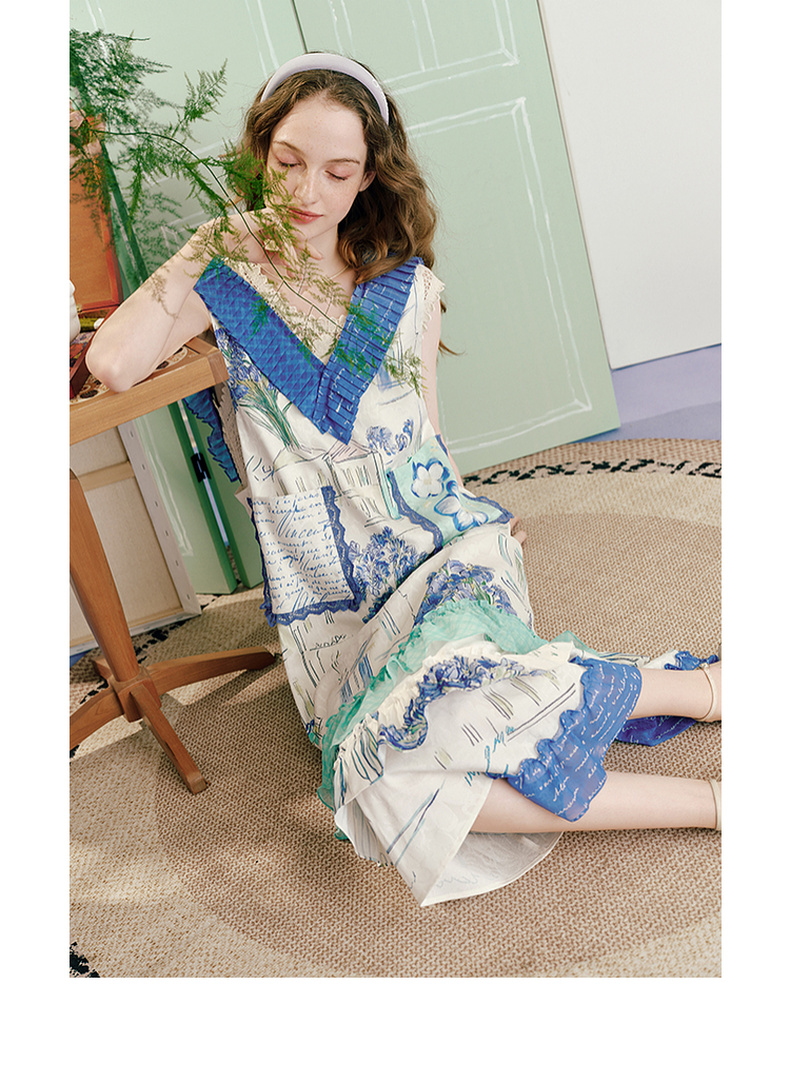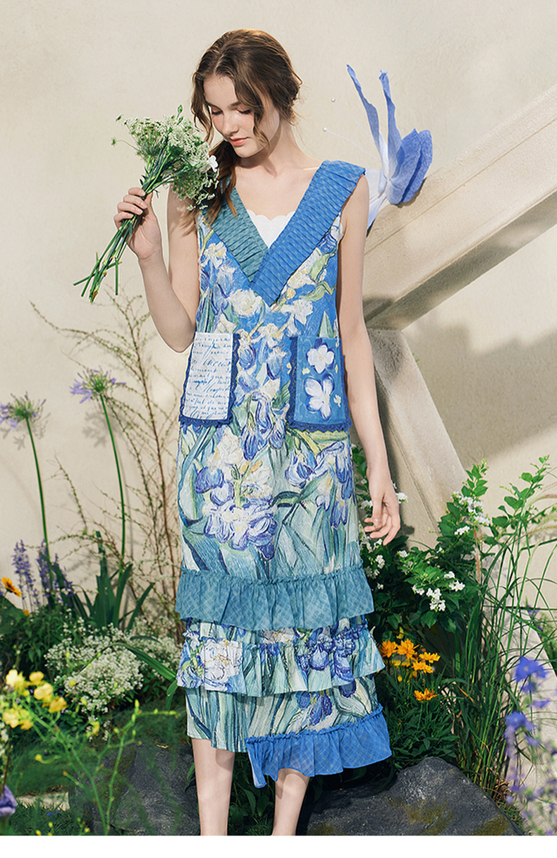 两三事梵高文艺花开若夏2025夏季新款压褶荷叶边印花蛋糕裙连衣裙