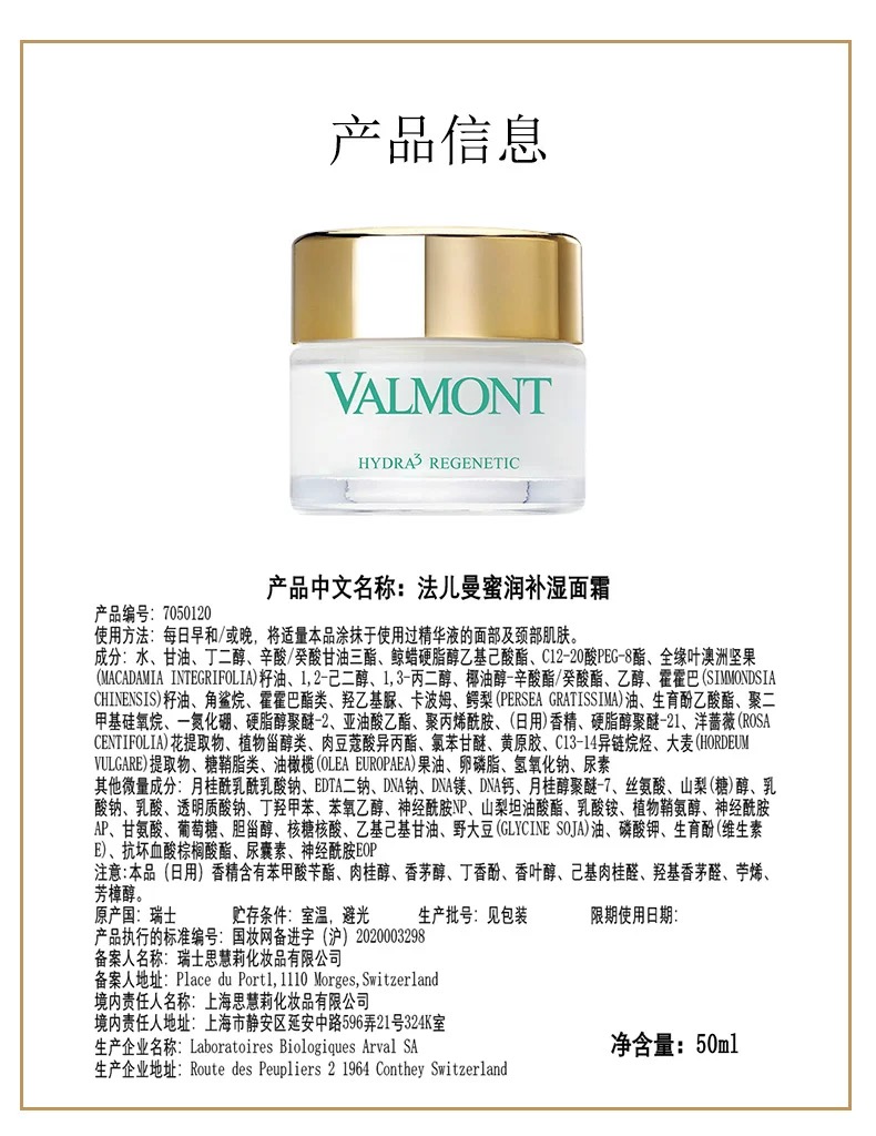 Valmont 蜜润补湿面霜 50ml