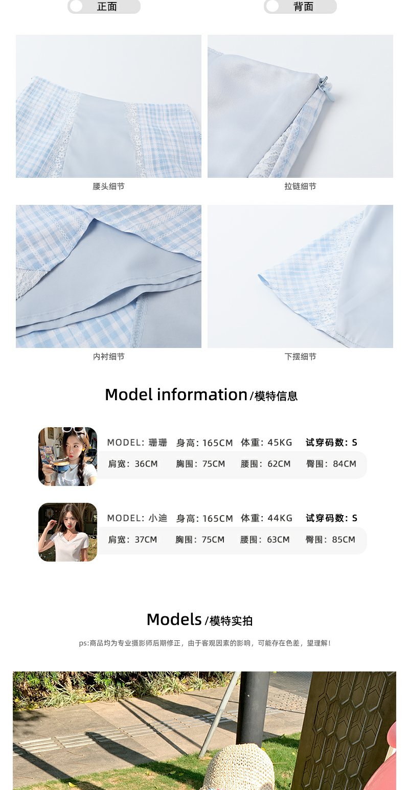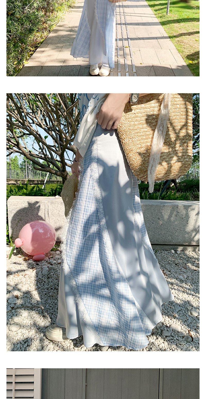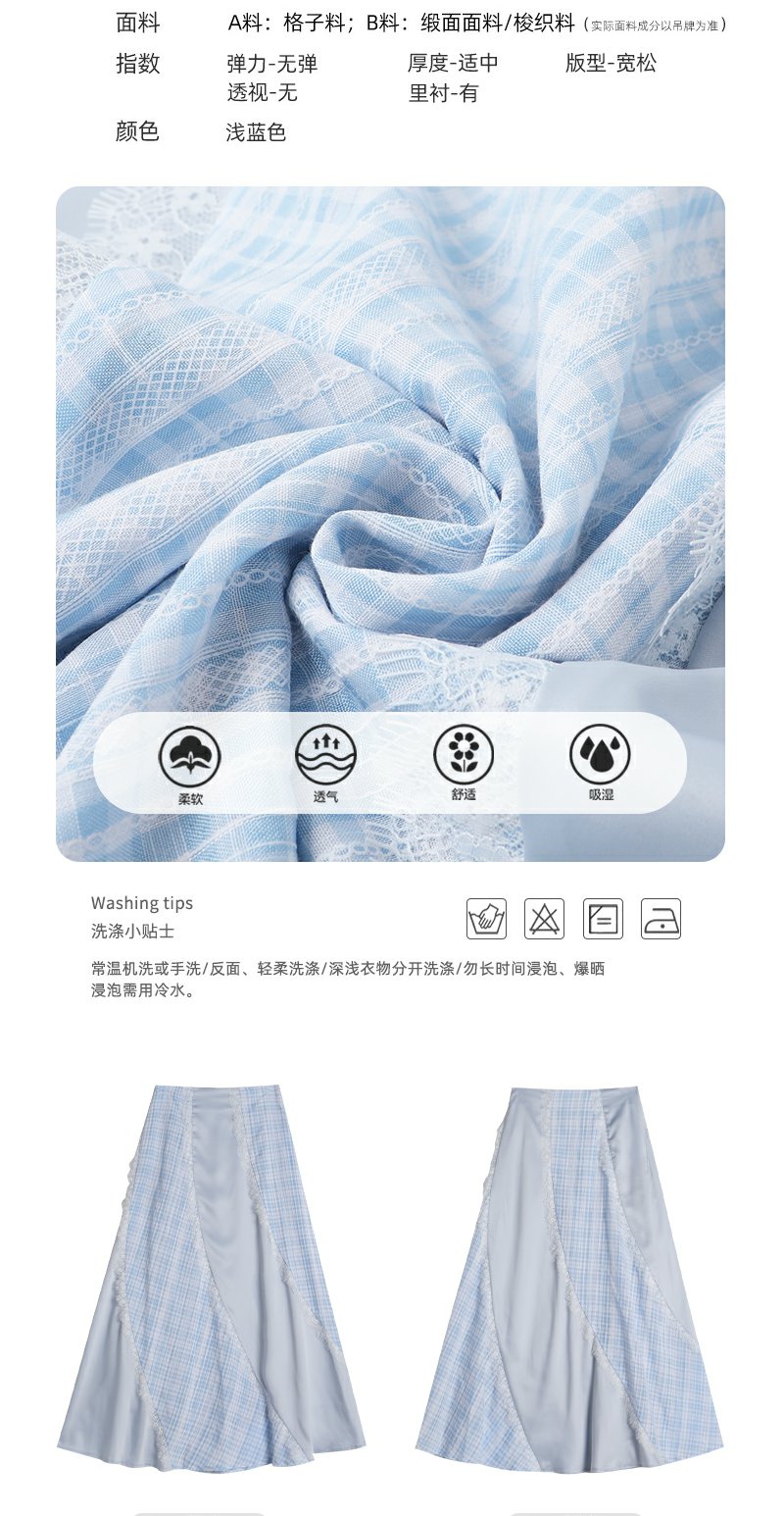<曾小咸推荐>浅蓝色清新格纹蕾丝拼接半身裙