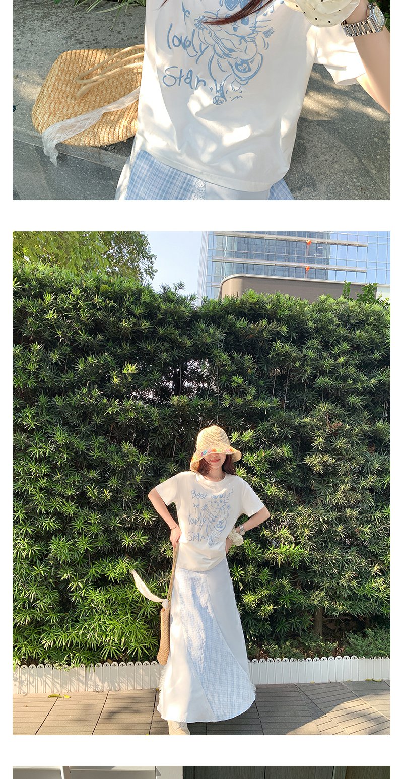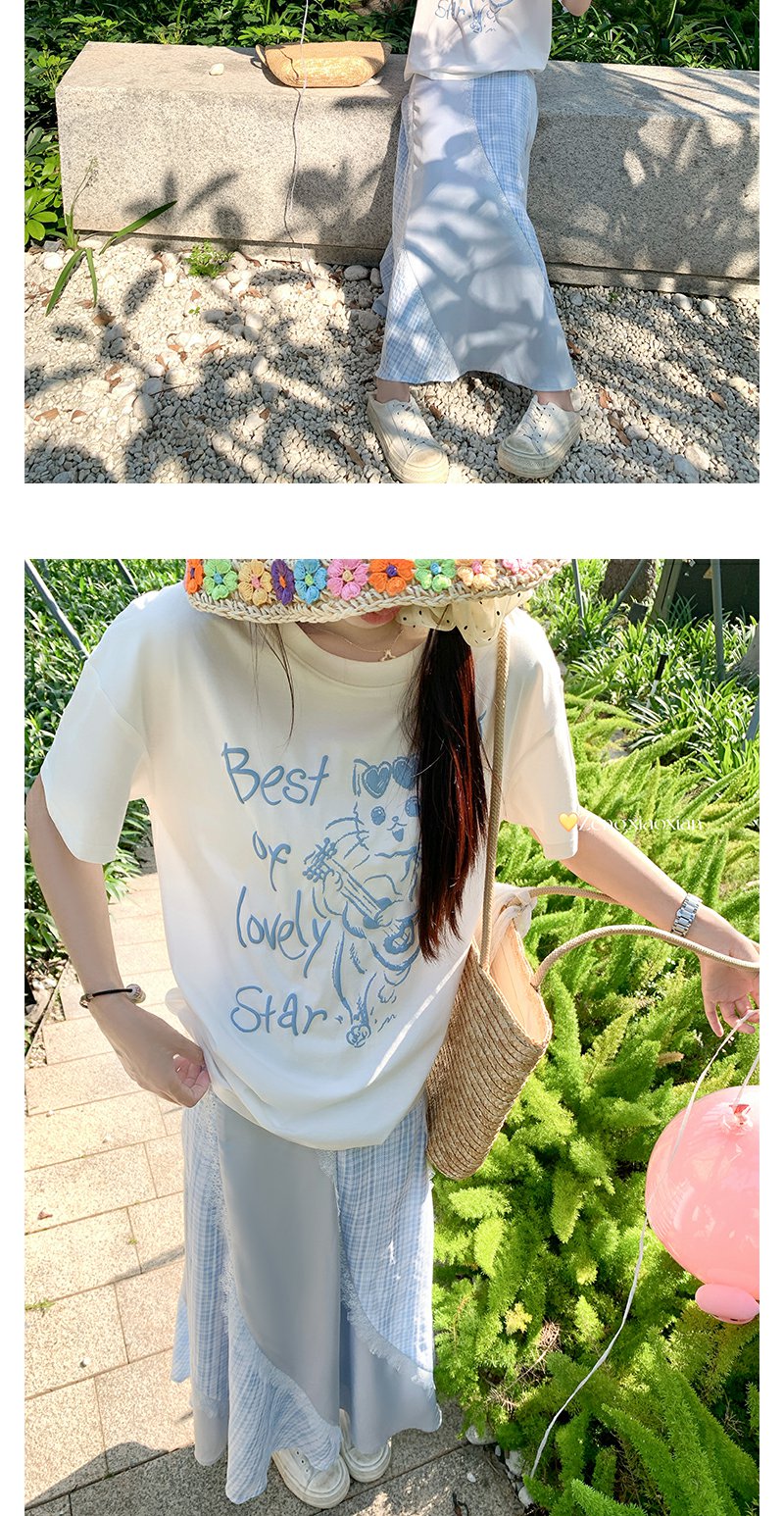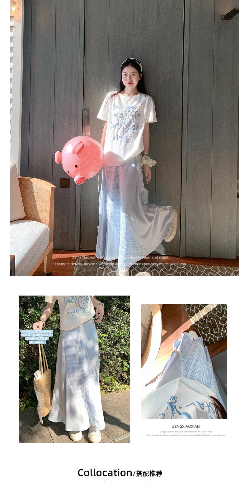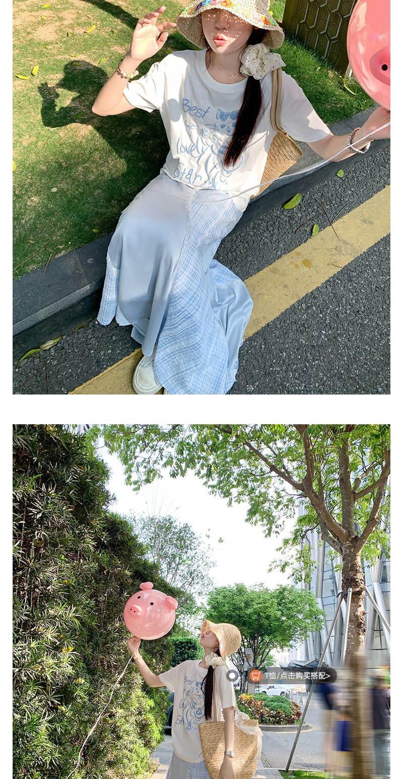<曾小咸推荐>浅蓝色清新格纹蕾丝拼接半身裙