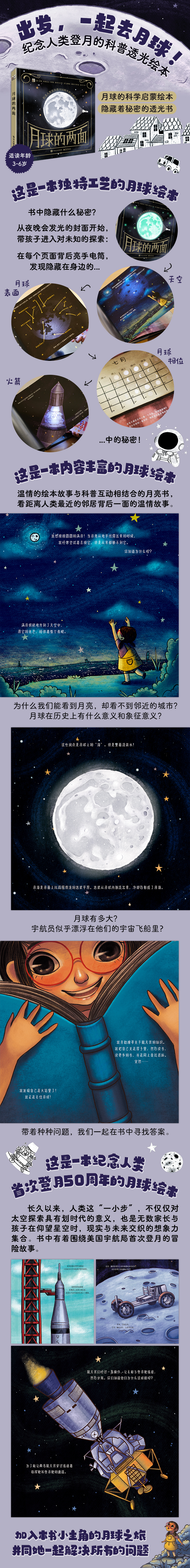这是一本纪念人类*次登月50周年的月球绘本。这是一本隐藏着秘密的透光书。在每个页面后面点亮手电筒,发现隐藏在宇宙、恒星、卫星、月球及其相位中的秘密,以及围绕美国宇航局*次登月的所有冒险。这是一本互动与科普相结合的月亮书,看距离人类*近的邻居背后一面的温情故事。为什么我们能看到月亮,却看不到邻近的城市? 月球在历史上有什么意义? 它有多大? 星星是什么? 为什么宇航员似乎漂浮在他们的宇宙飞船里? 失重是什么感觉? 太空听起来像什么? 月球和宇宙对每个人来说都是一个谜,同时也是一个神秘而迷人的元素。书中有很多信息,神话、传说、数据、特征和更多关于月球的插图,此外,在这本美丽的月球书里,还有很多小惊喜!快和爸爸妈妈一起拿去这本书,探索月亮的秘密吧!