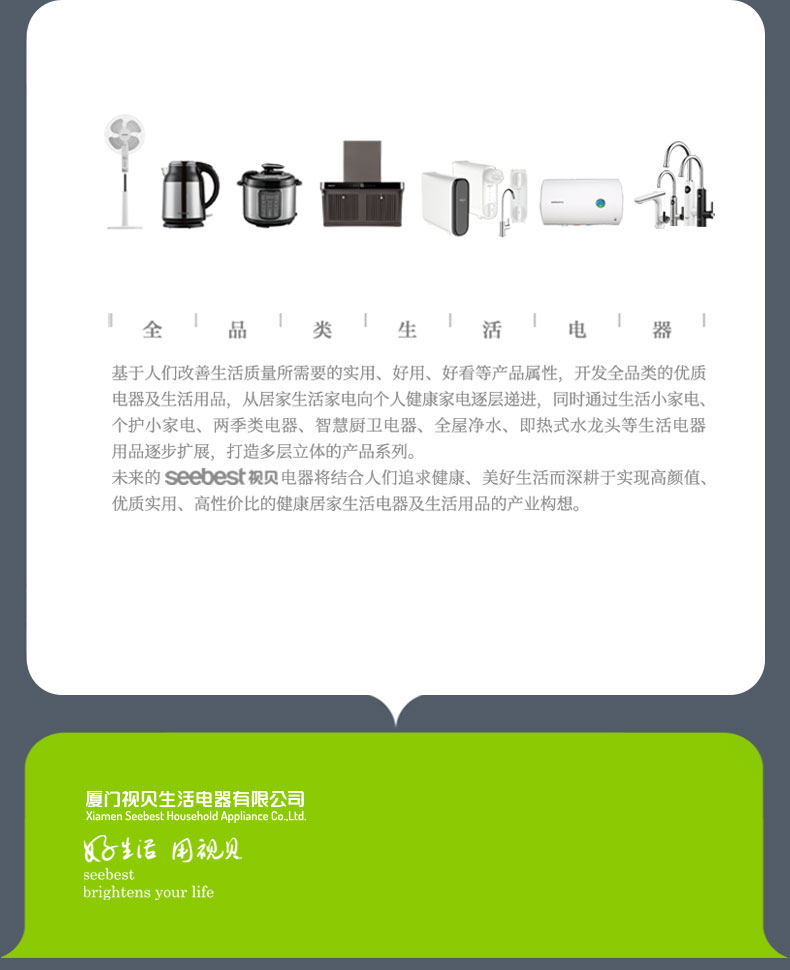 厦门视贝科技有限公司是集产品自主设计,研发,生产,销售于一体的高科技企业。拥有80000平方米的制造厂房,核心员工2000多人。产品线涵盖照明、电工,卫浴,线路,集成风暖等领域。