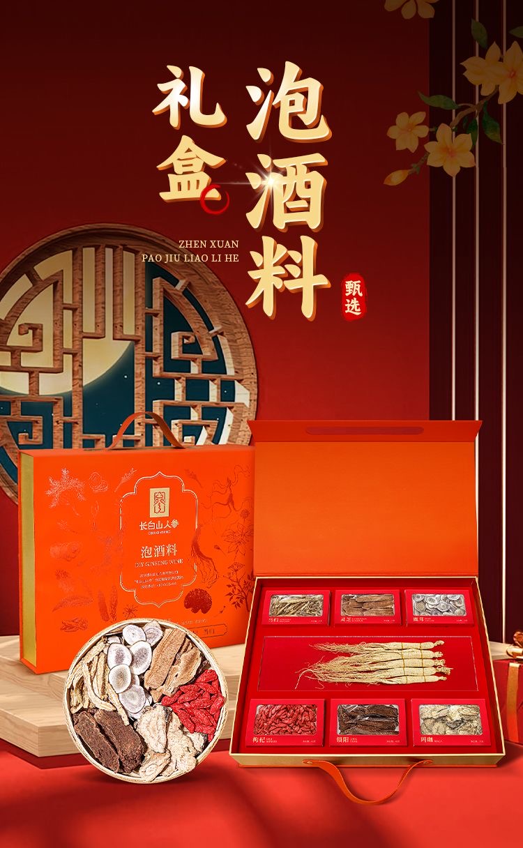 热售【生晒参泡酒料礼盒】长白山人参 生晒参 鹿茸 当归 玛咖 锁阳 灵芝 枸杞泡酒材料215g