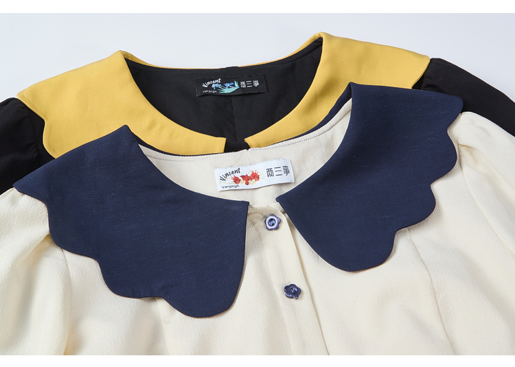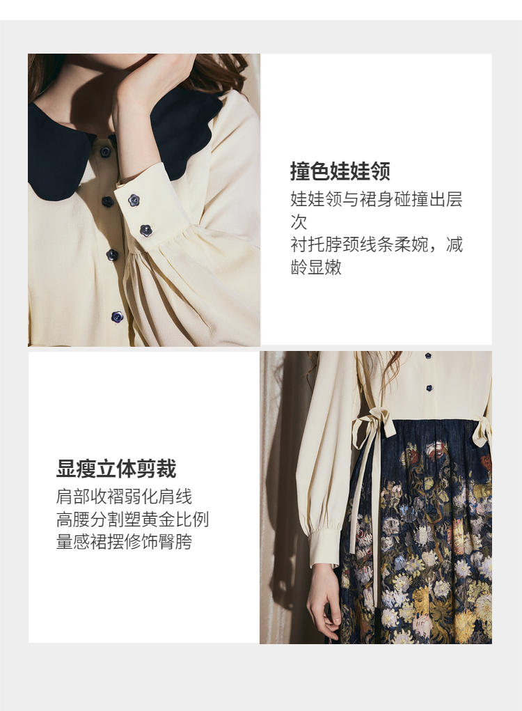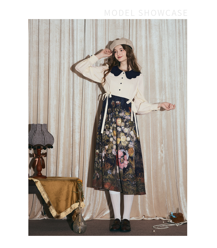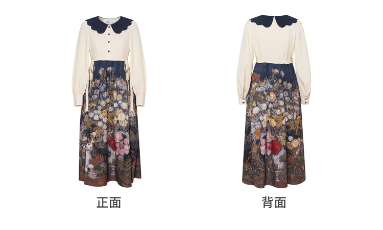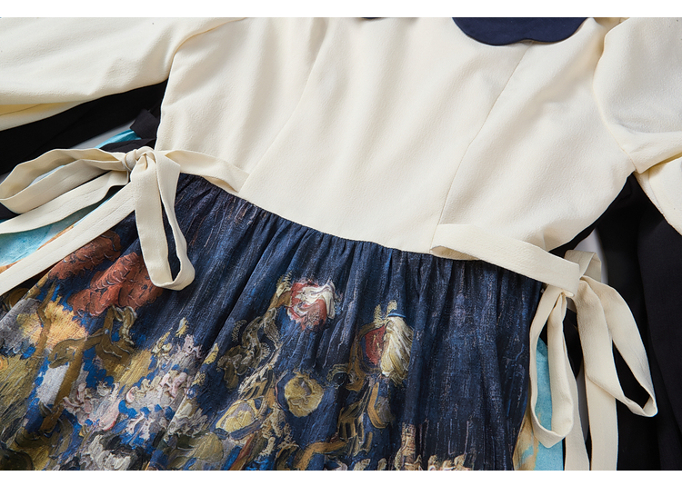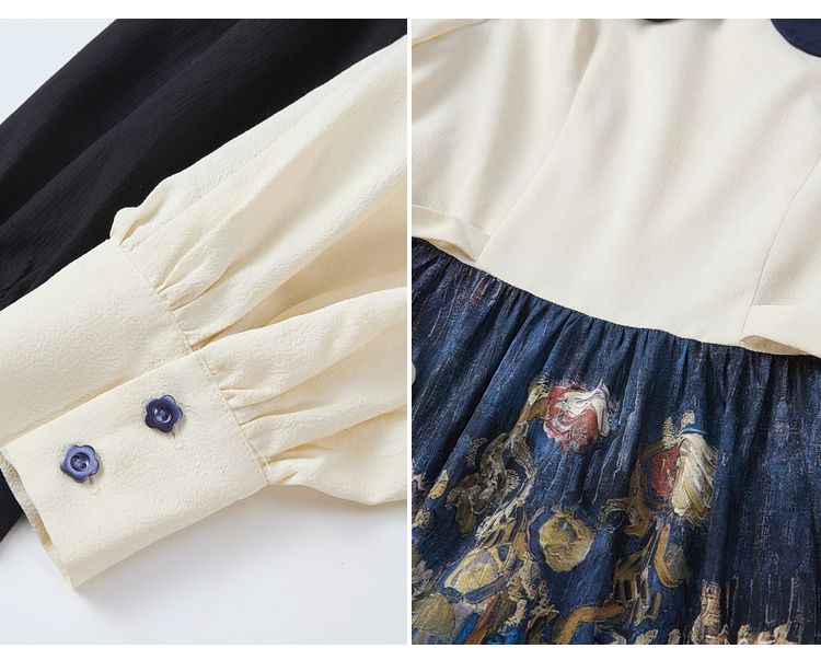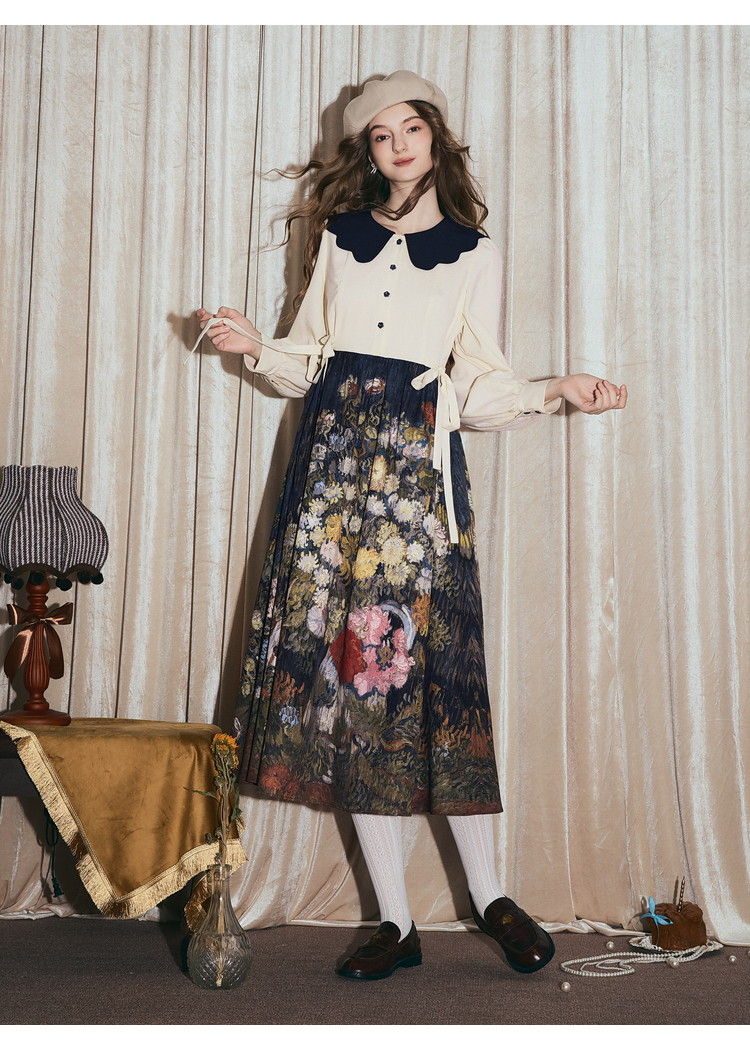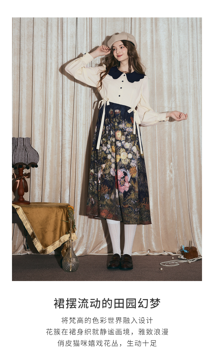 两三事梵高文艺 繁花漫野 2025秋季新款印花裙摆拼接娃娃领连衣裙