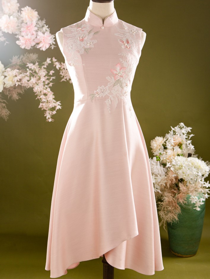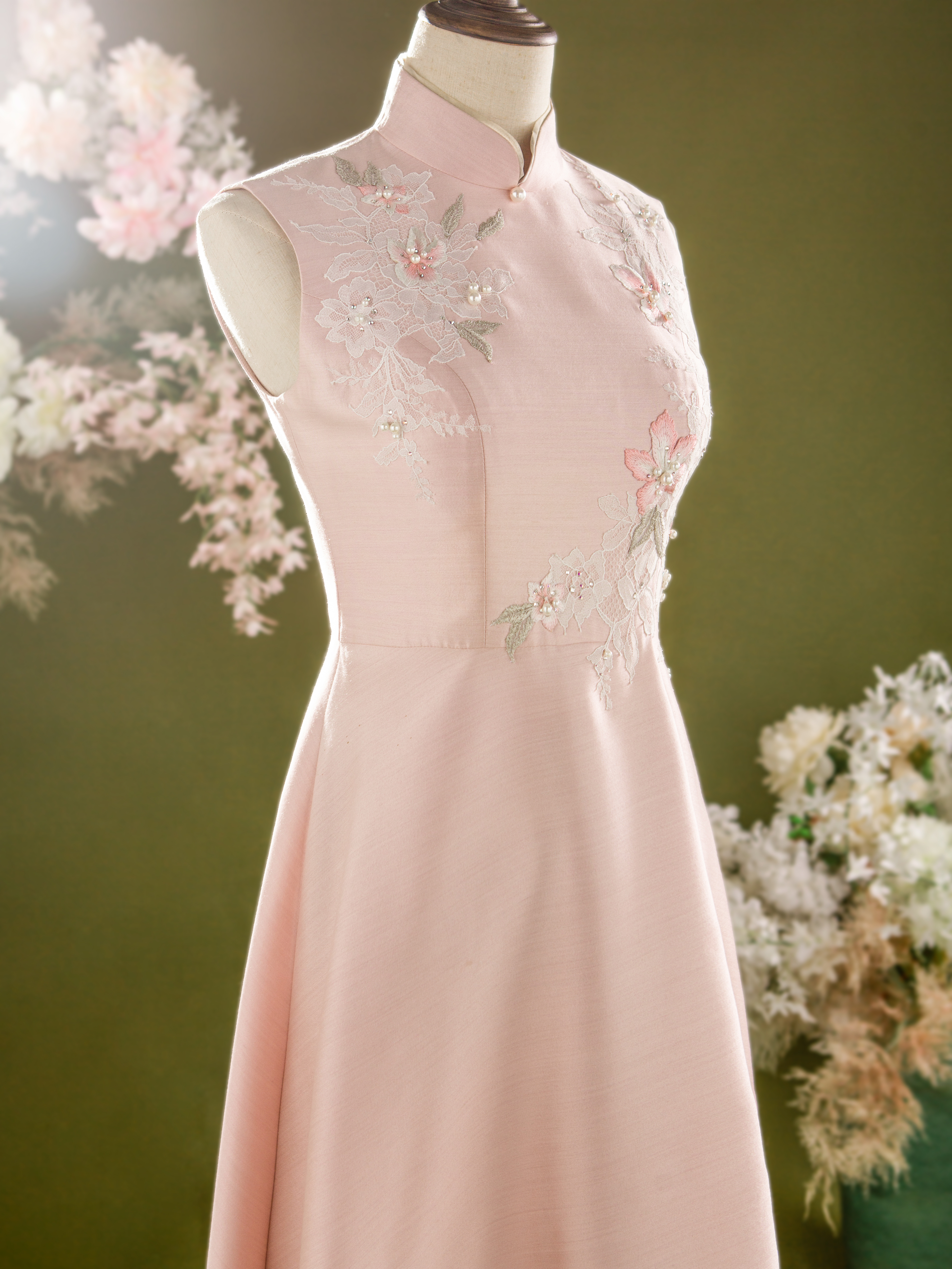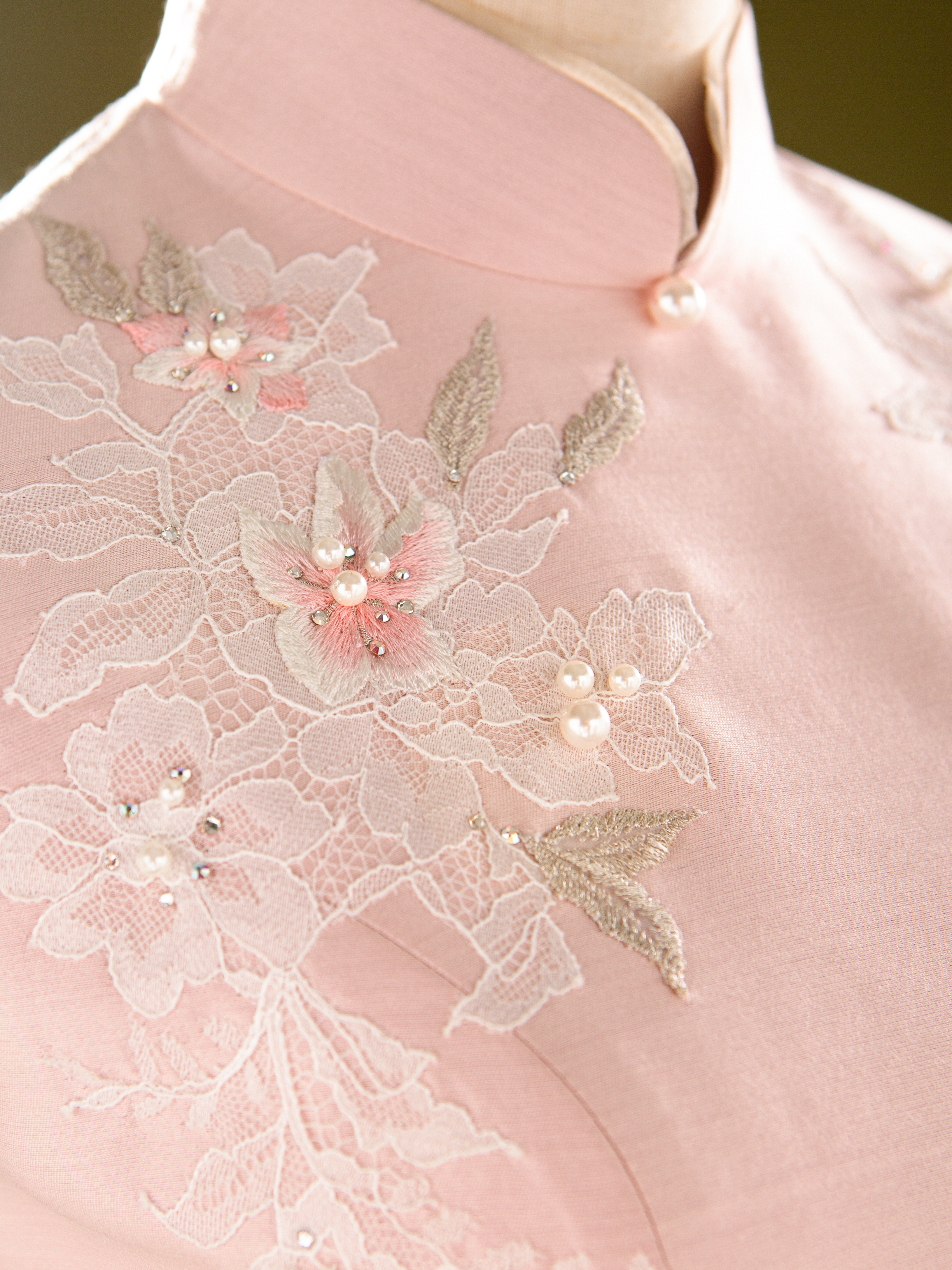 荷言HEYEN 咏弦月【明星同款】 光感真丝丝毛缎+施华洛世奇烫钻+精工桃花手绣+蕾丝定位贴片手工旗袍