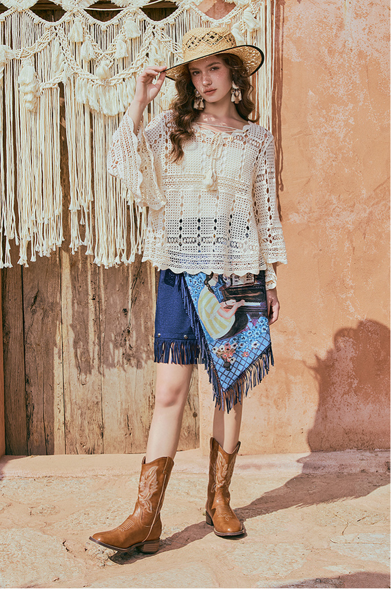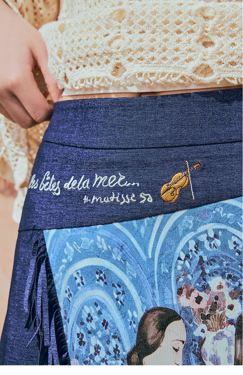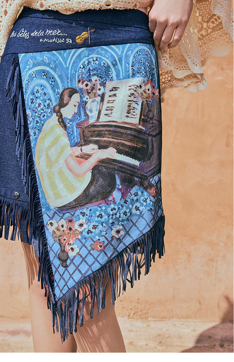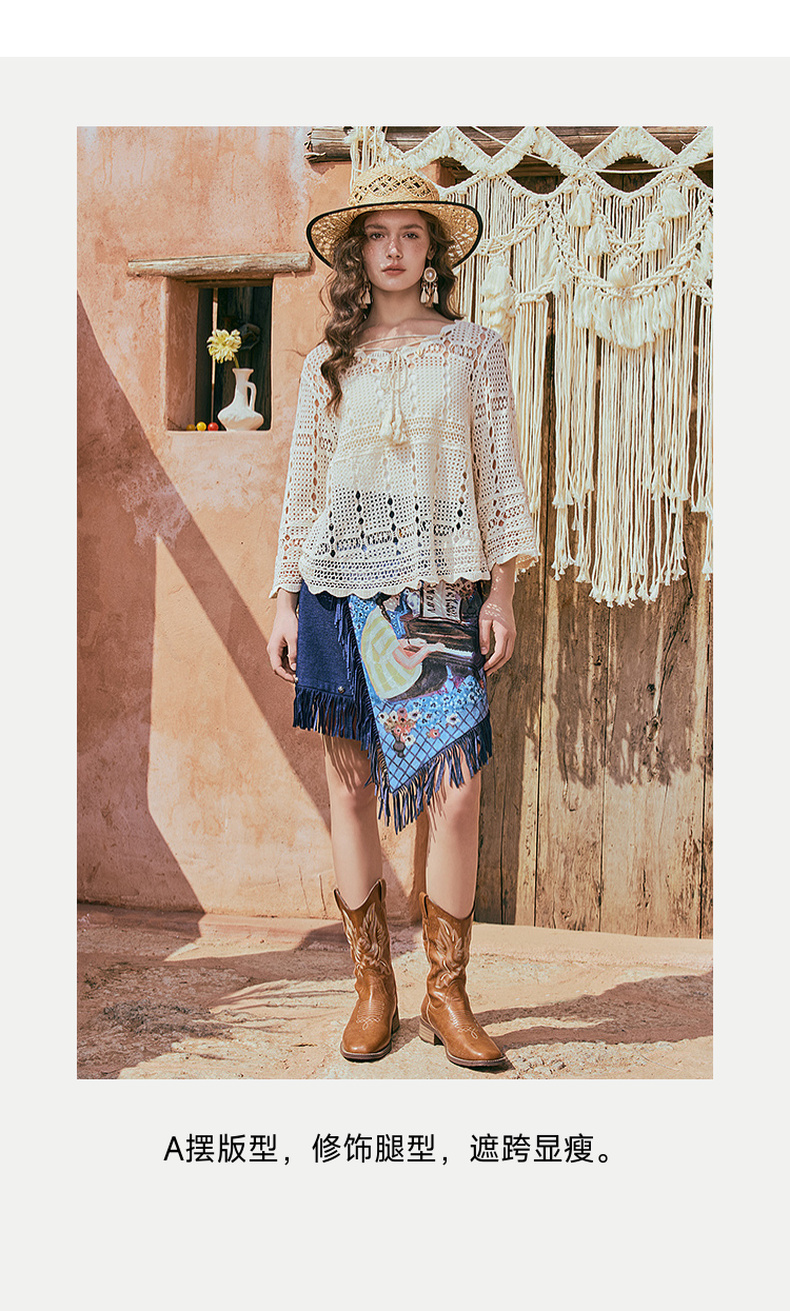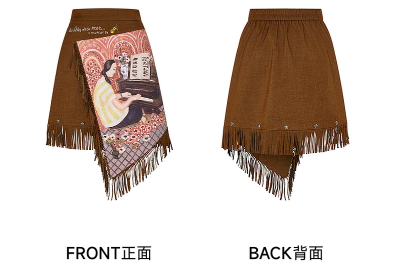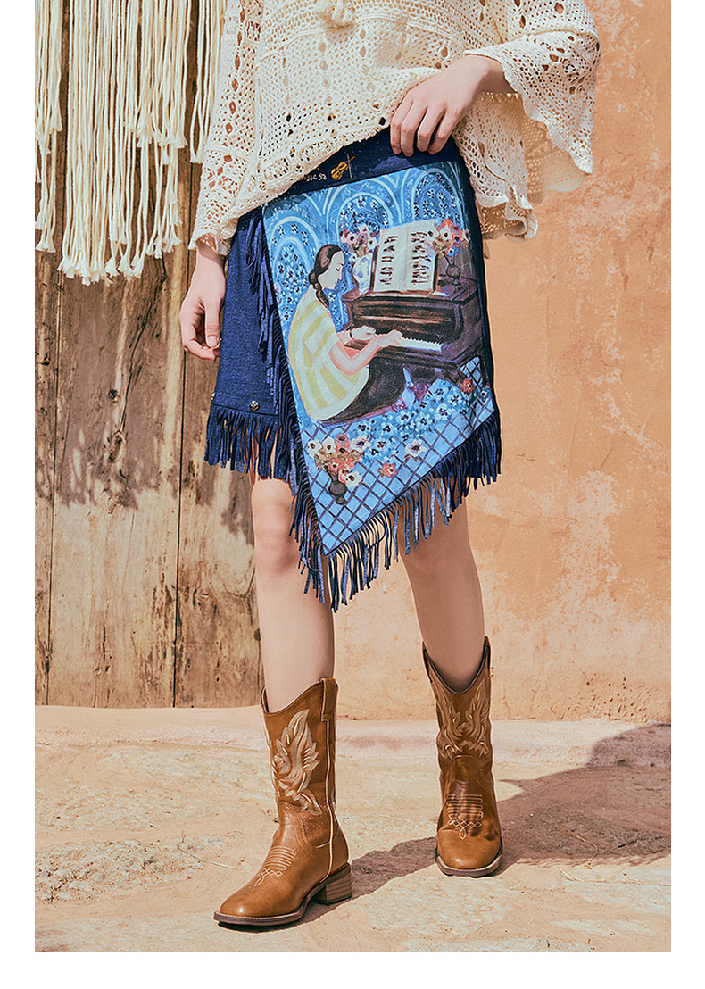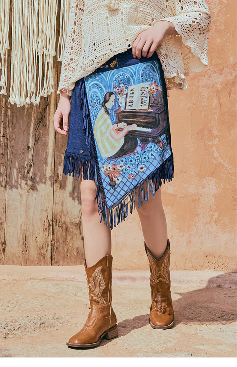 两三事游吟夜曲2025夏新款铆钉装饰印花刺绣流苏不规则裙摆半身裙