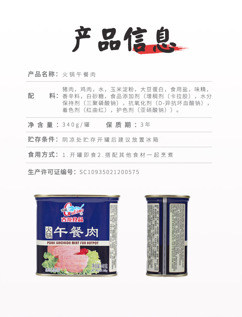 古龙食品 火锅午餐肉罐头火腿香肠猪肉熟食即食火锅食材速食
